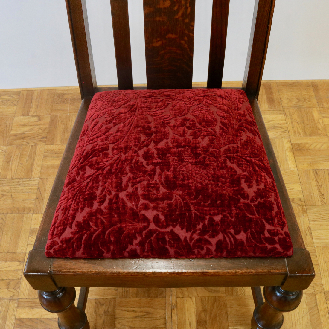 座面は植物柄の赤い起毛生地で張替えました。