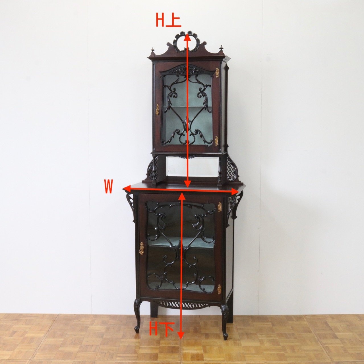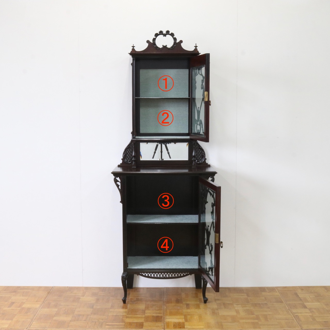 トップのペディメントやガラス扉に施された流麗な装飾が印象的で、品のあるオーラを放っている家具です。インテリアのアクセントとしていかがでしょうか。