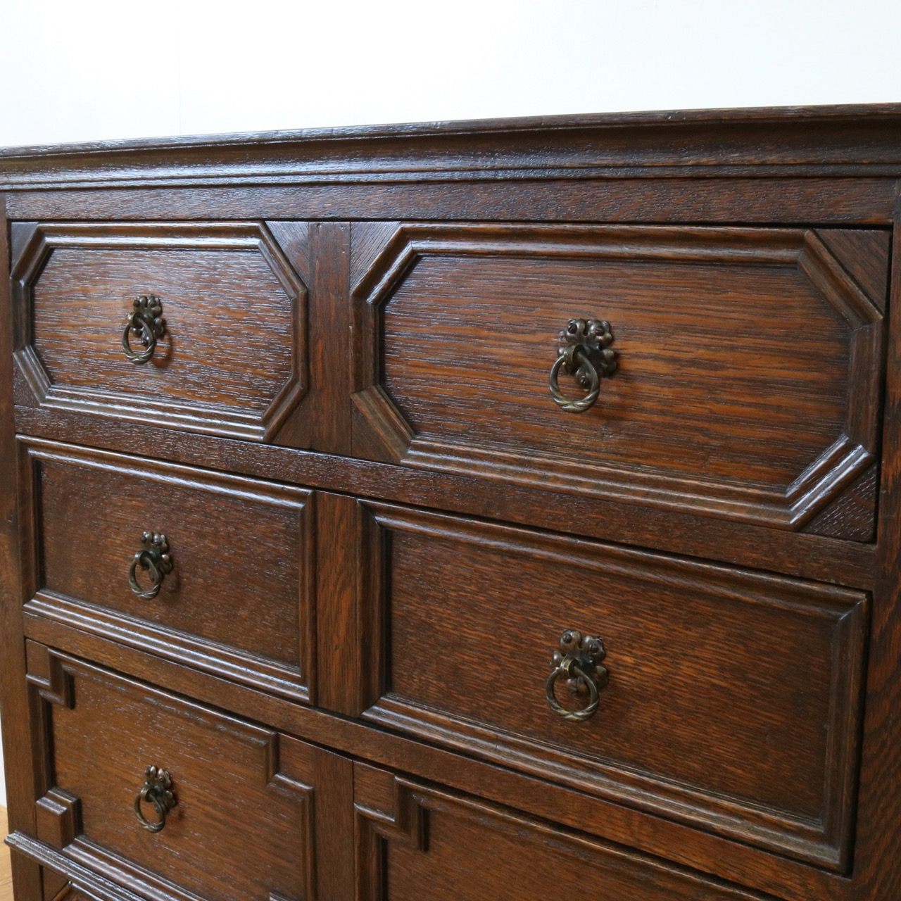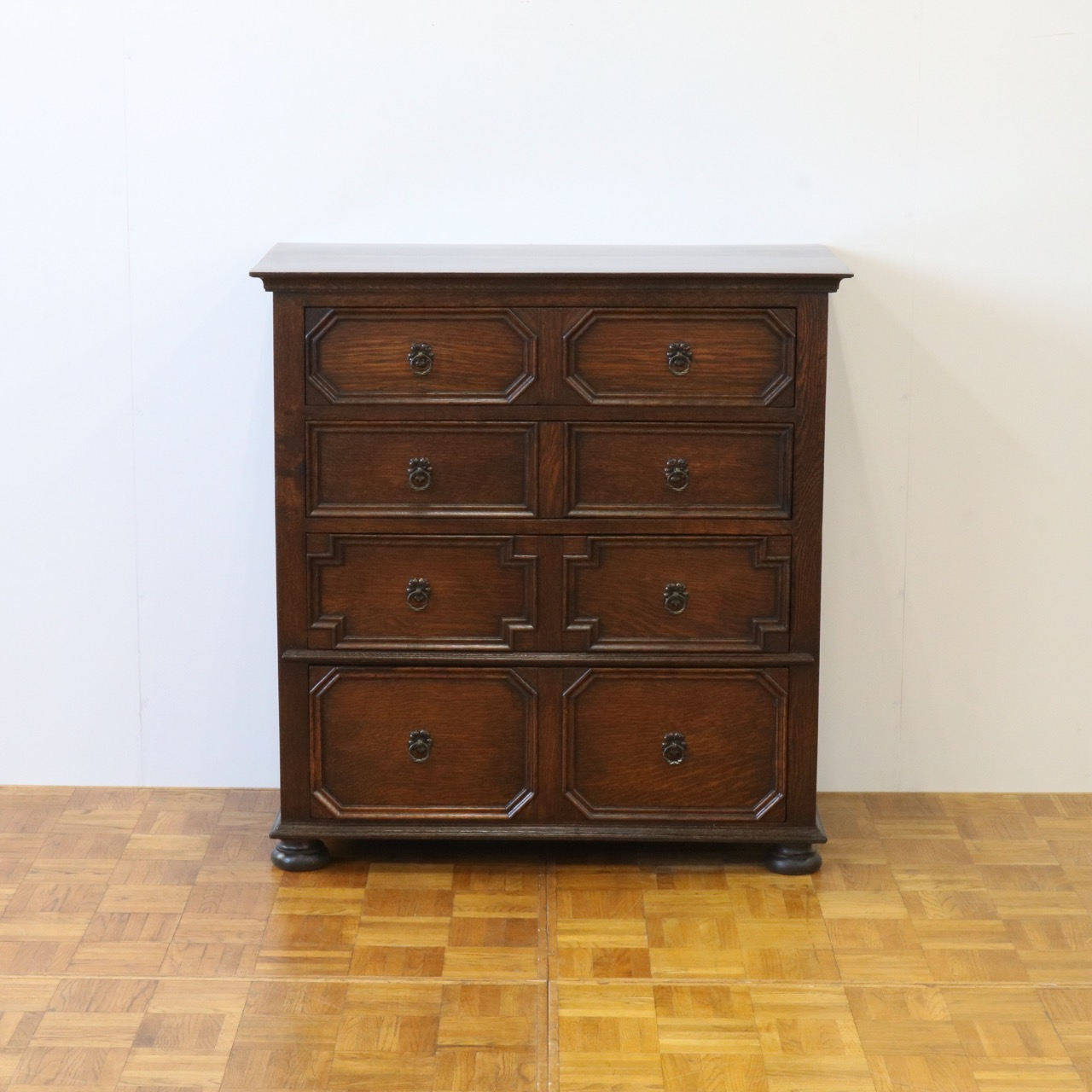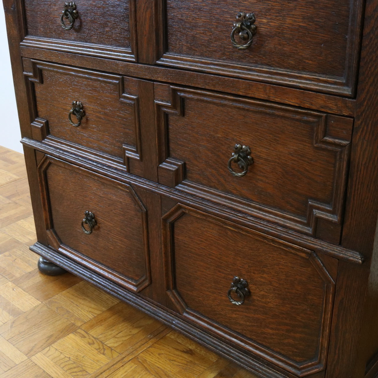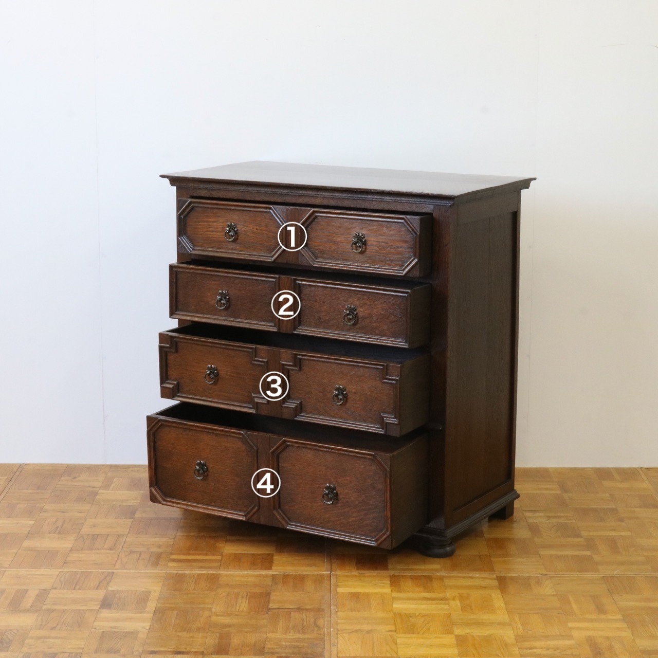 四段ある引き出しは表面の装飾が段ごとに異なっています。
