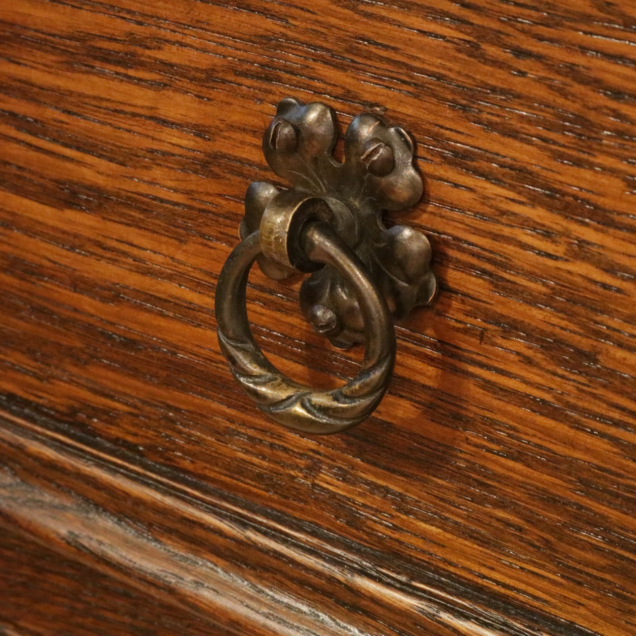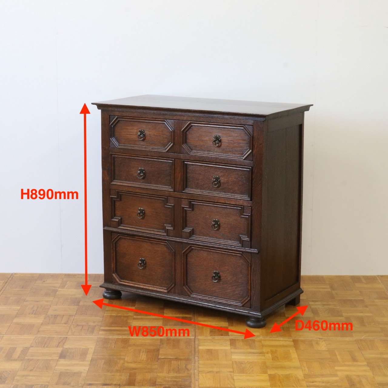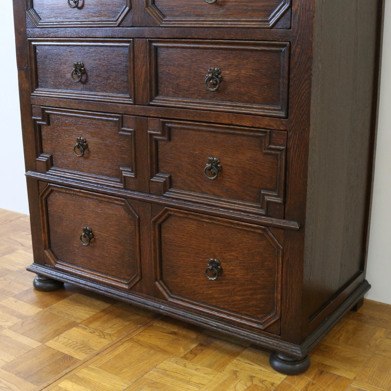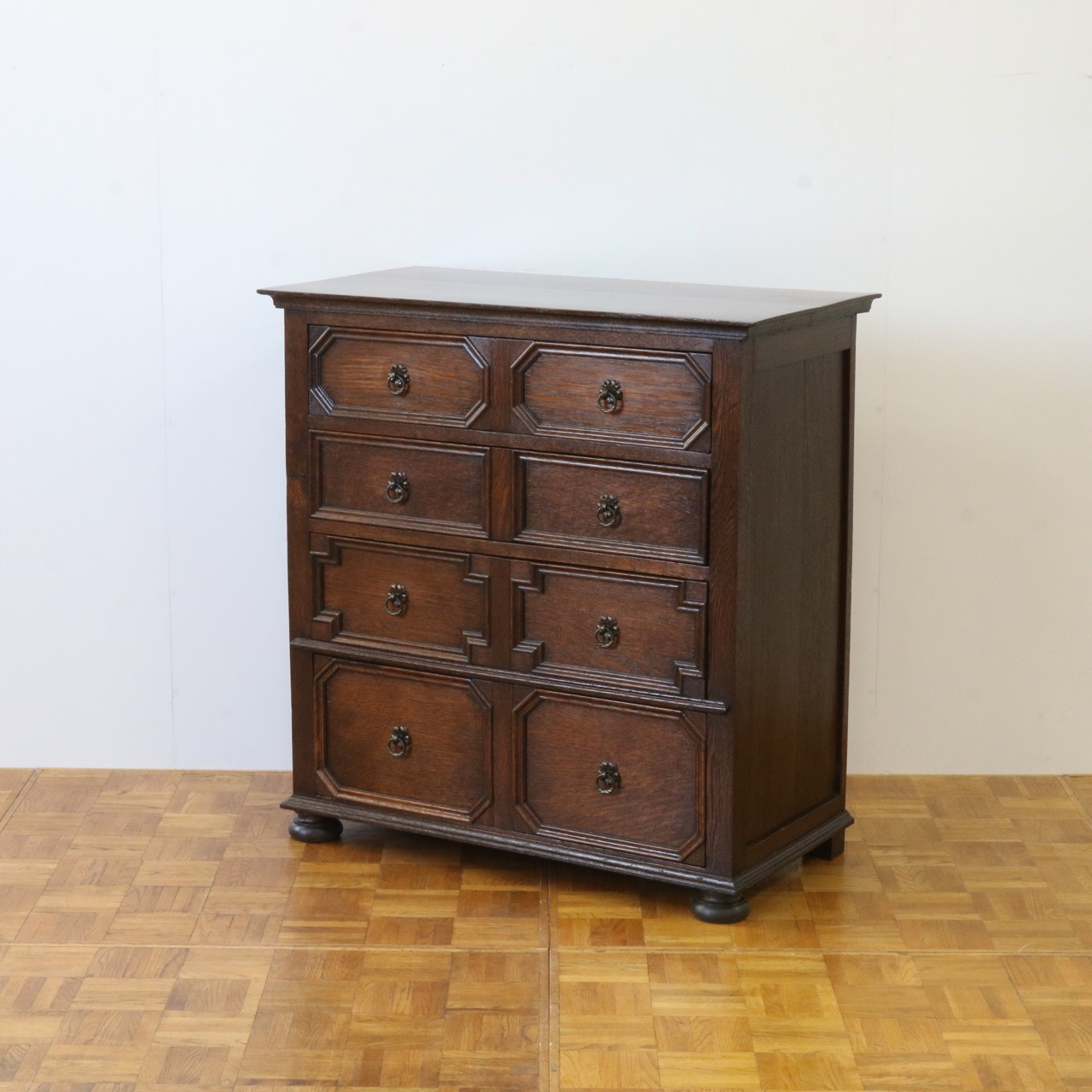 四段ある引き出しは表面の装飾が段ごとに異なっています。