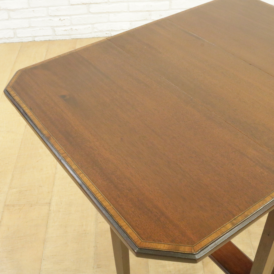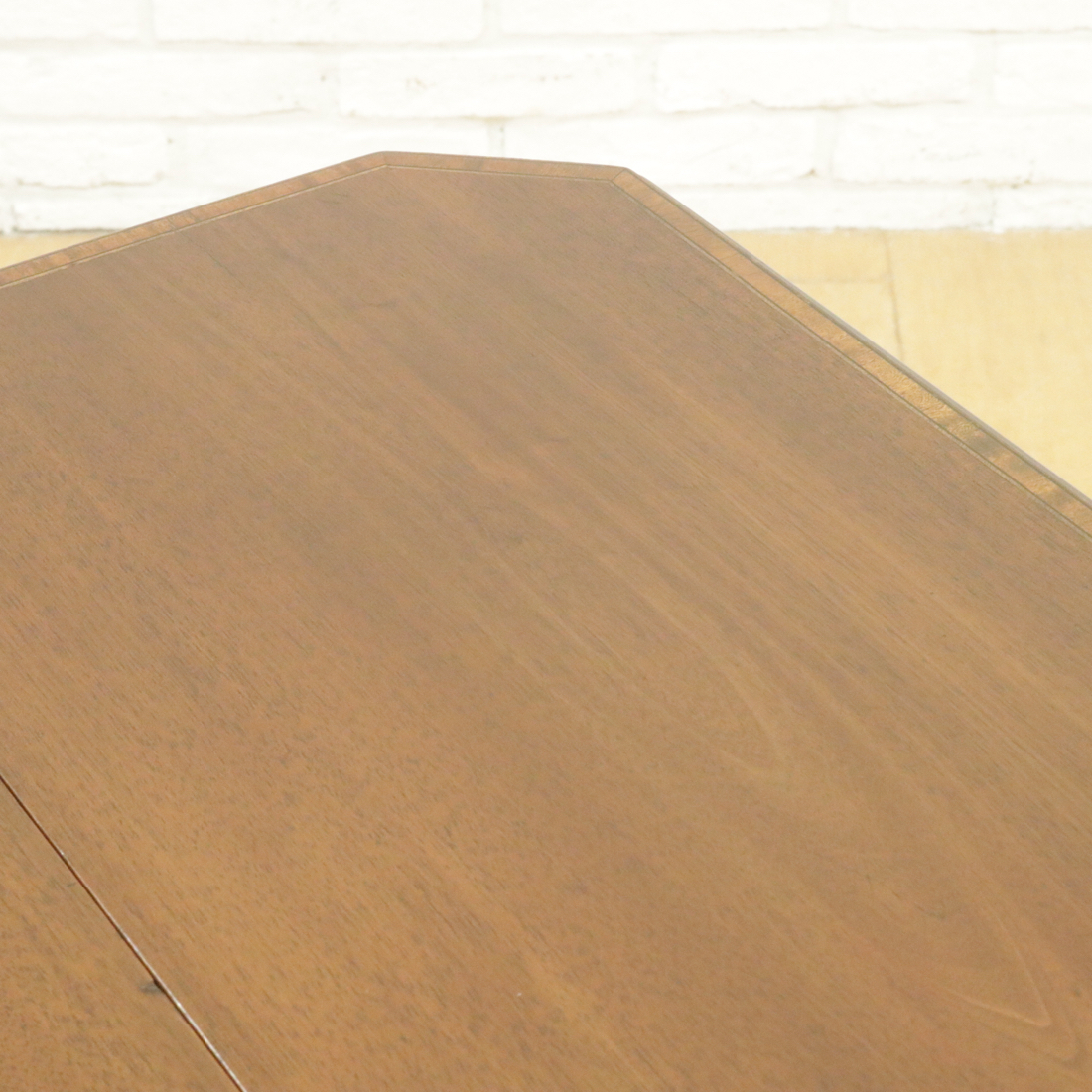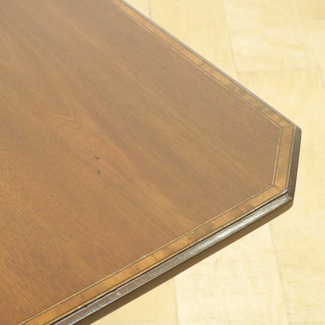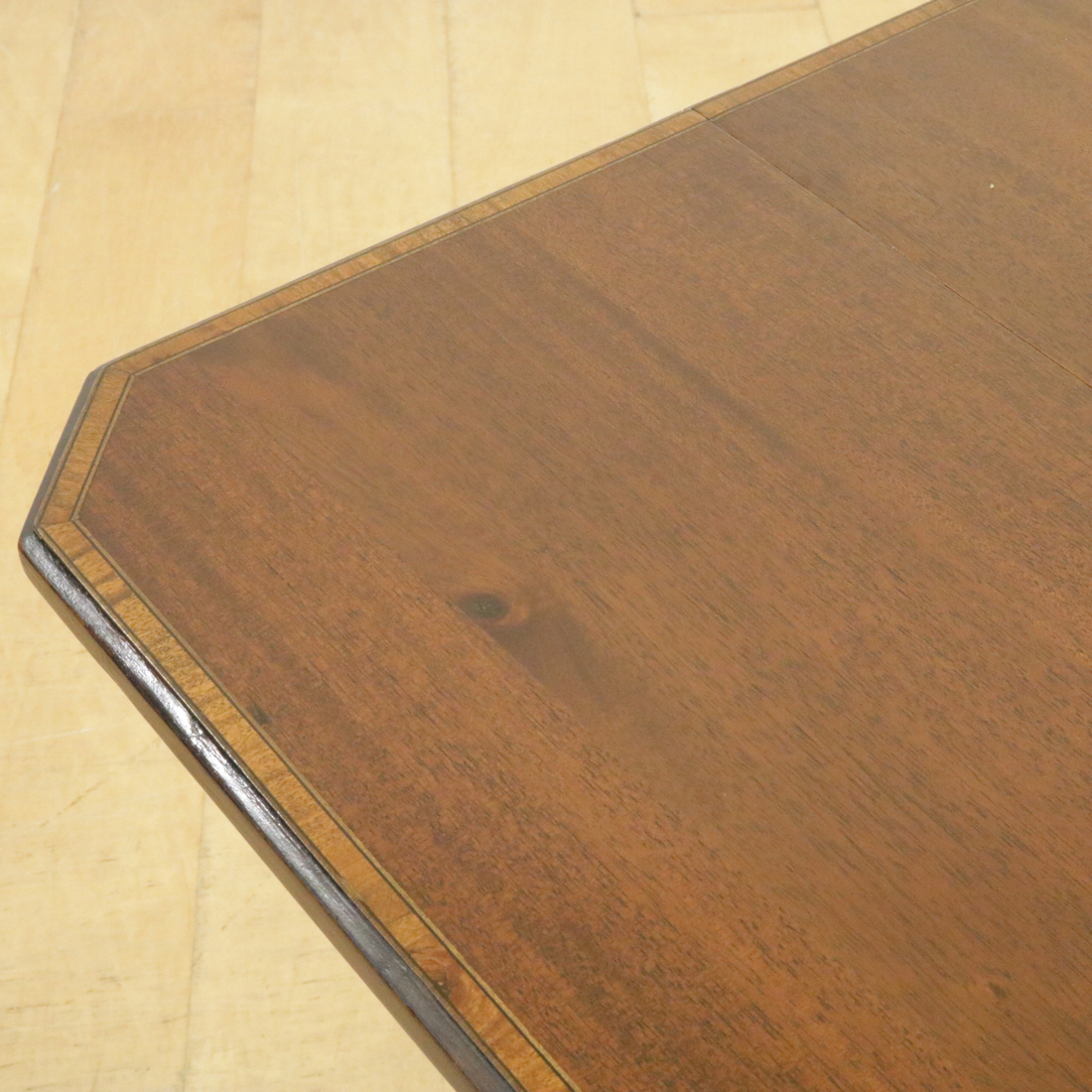 天板はマホガニーの美しい縞模様。縁は明るい色のインレイ装飾で囲まれています。