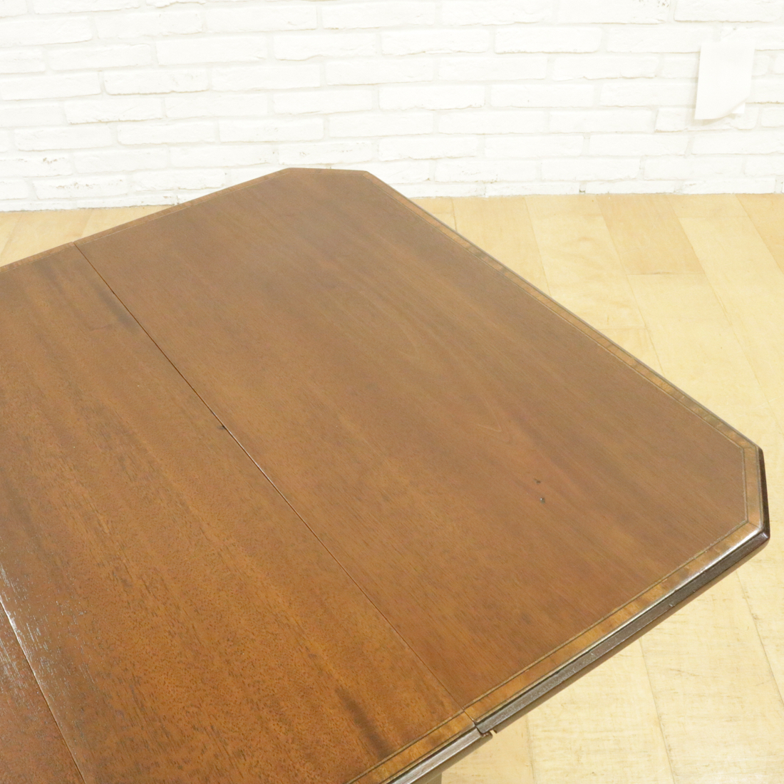 天板縁にインレイが施された上品なデザイン。天板を広げたりコンパクトに畳めたり、実用的なテーブルです。