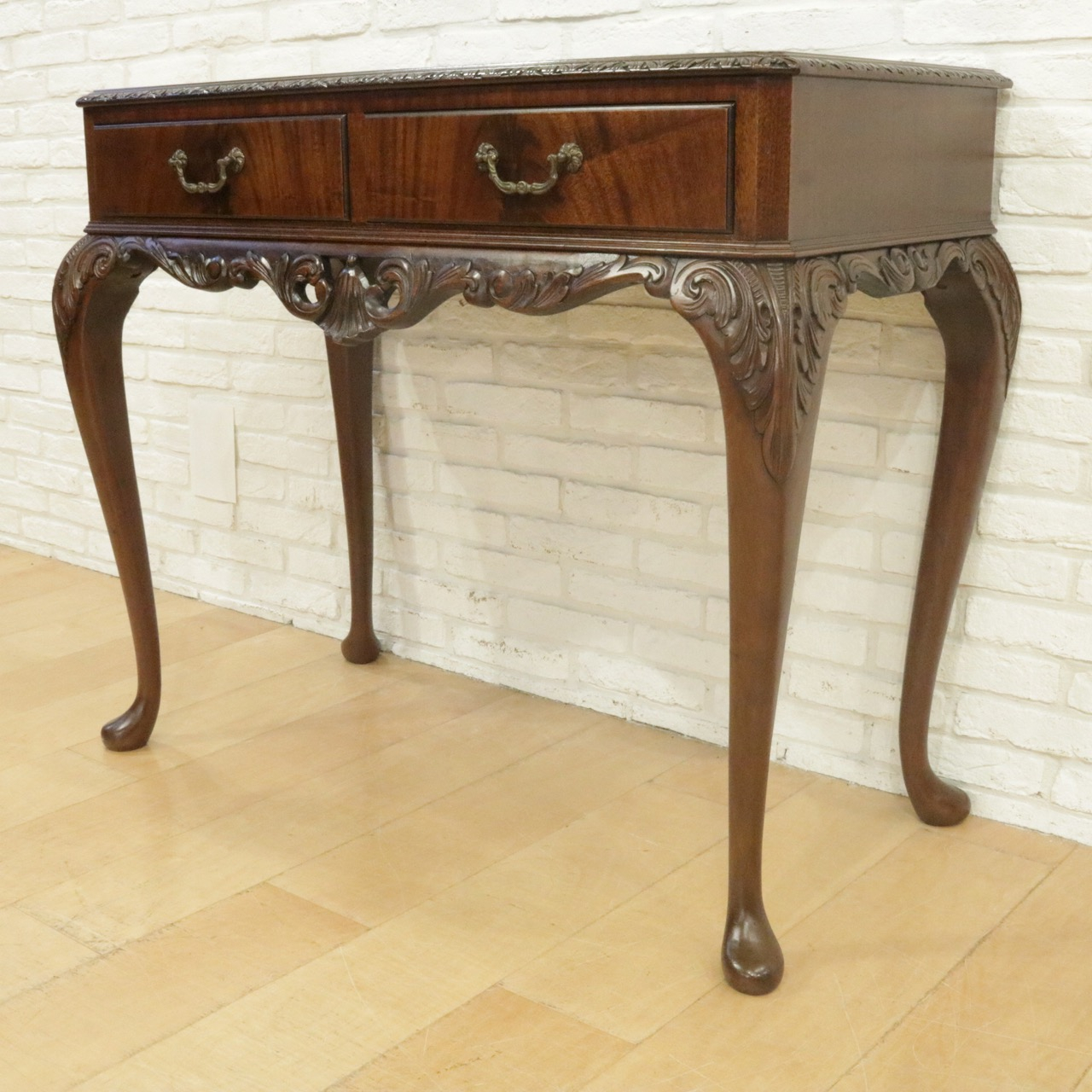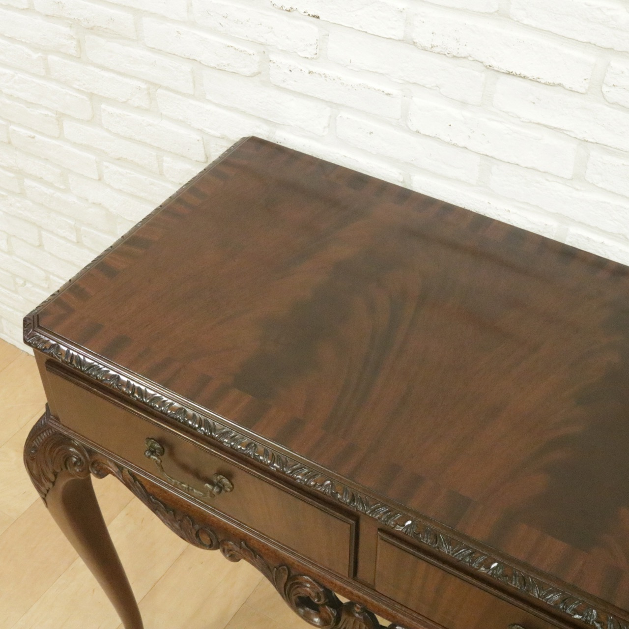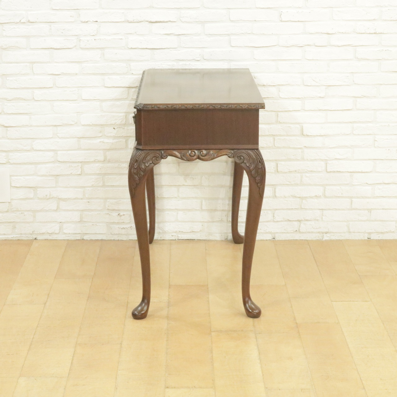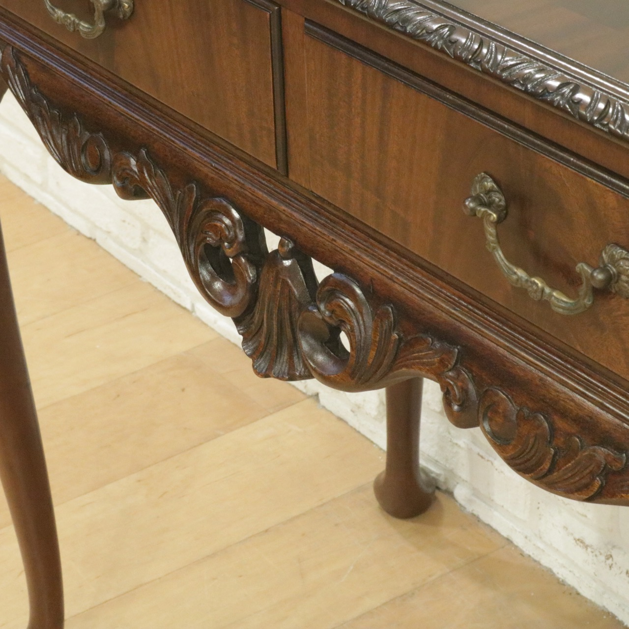 天板縁にはガドルーニングが施され、幕板にはアカンサスの透かし彫りが印象的に配されています。