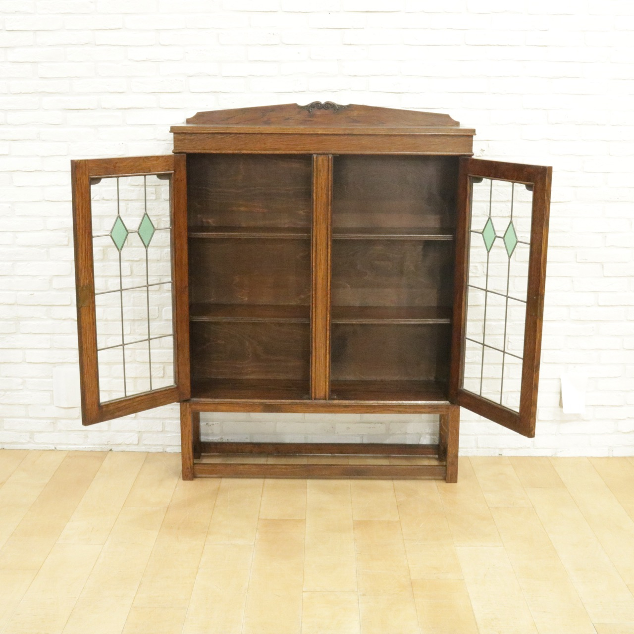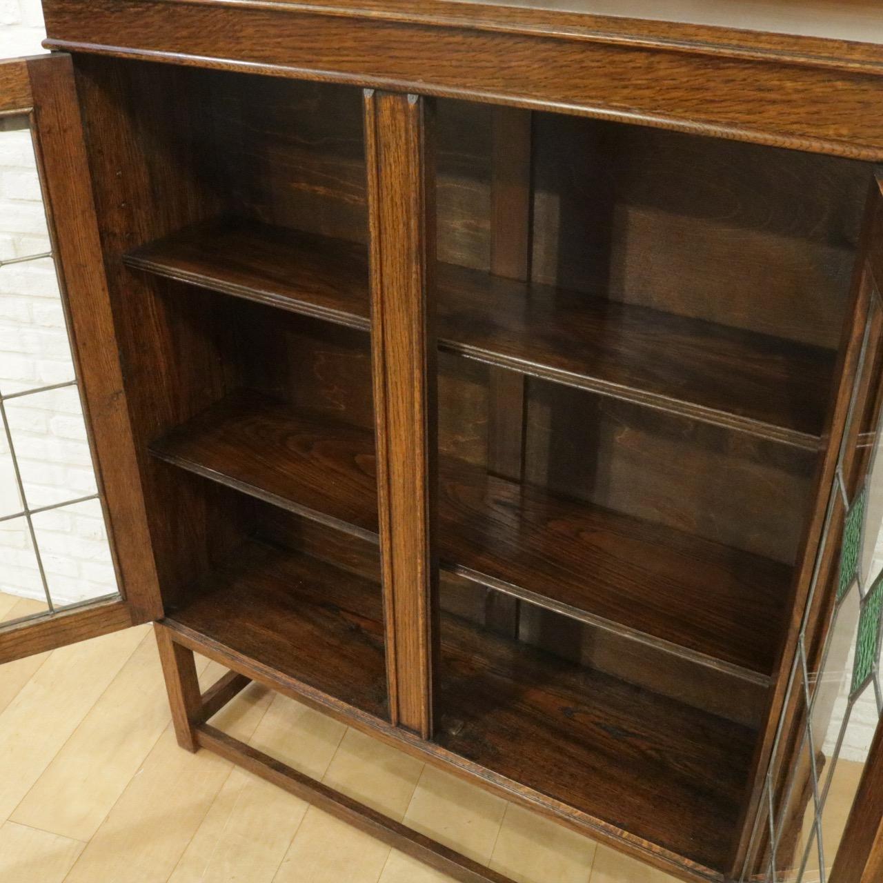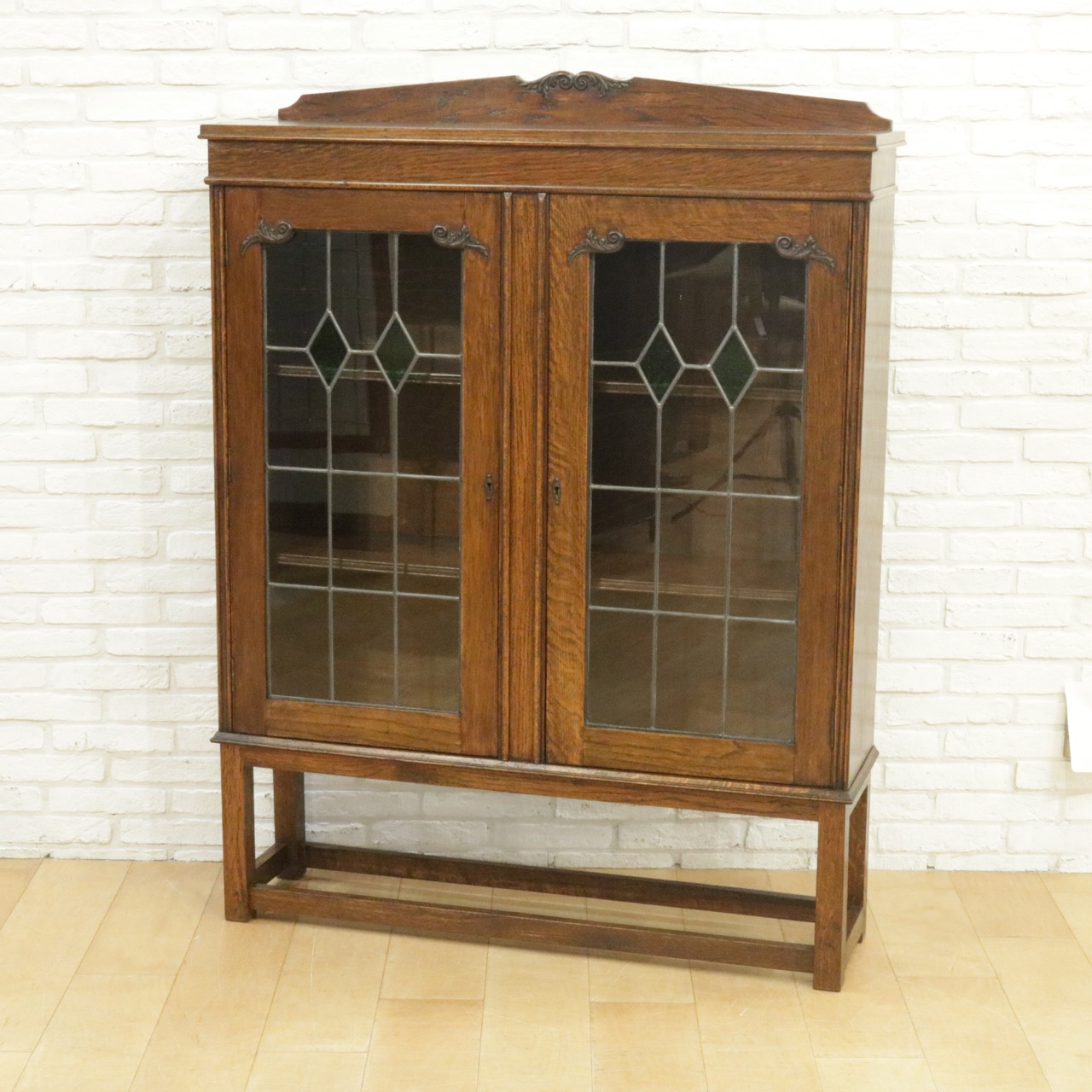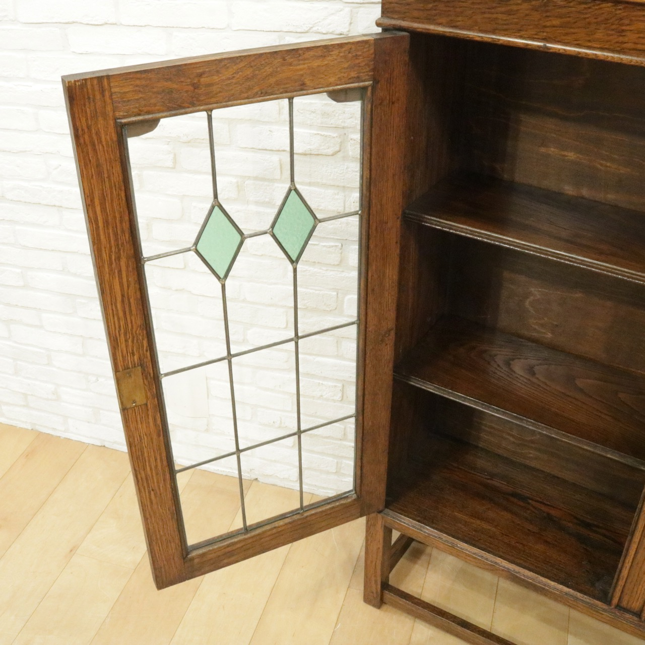 配送料の目安 ▶︎1930年代、オーク材のブックケース 。グリーンのガラスが美しいアンティークらしいステンドグラスの扉に惹かれます。アカンサスの装飾もさり気なくポイントです。