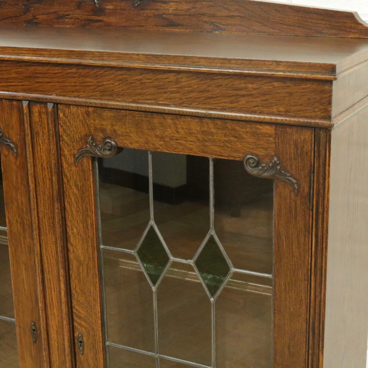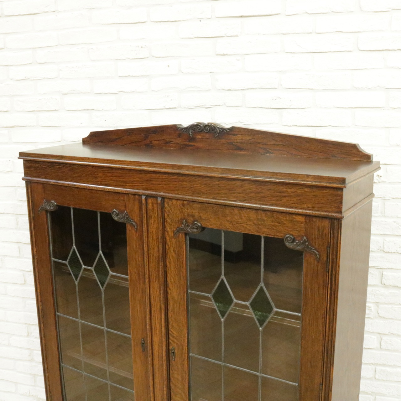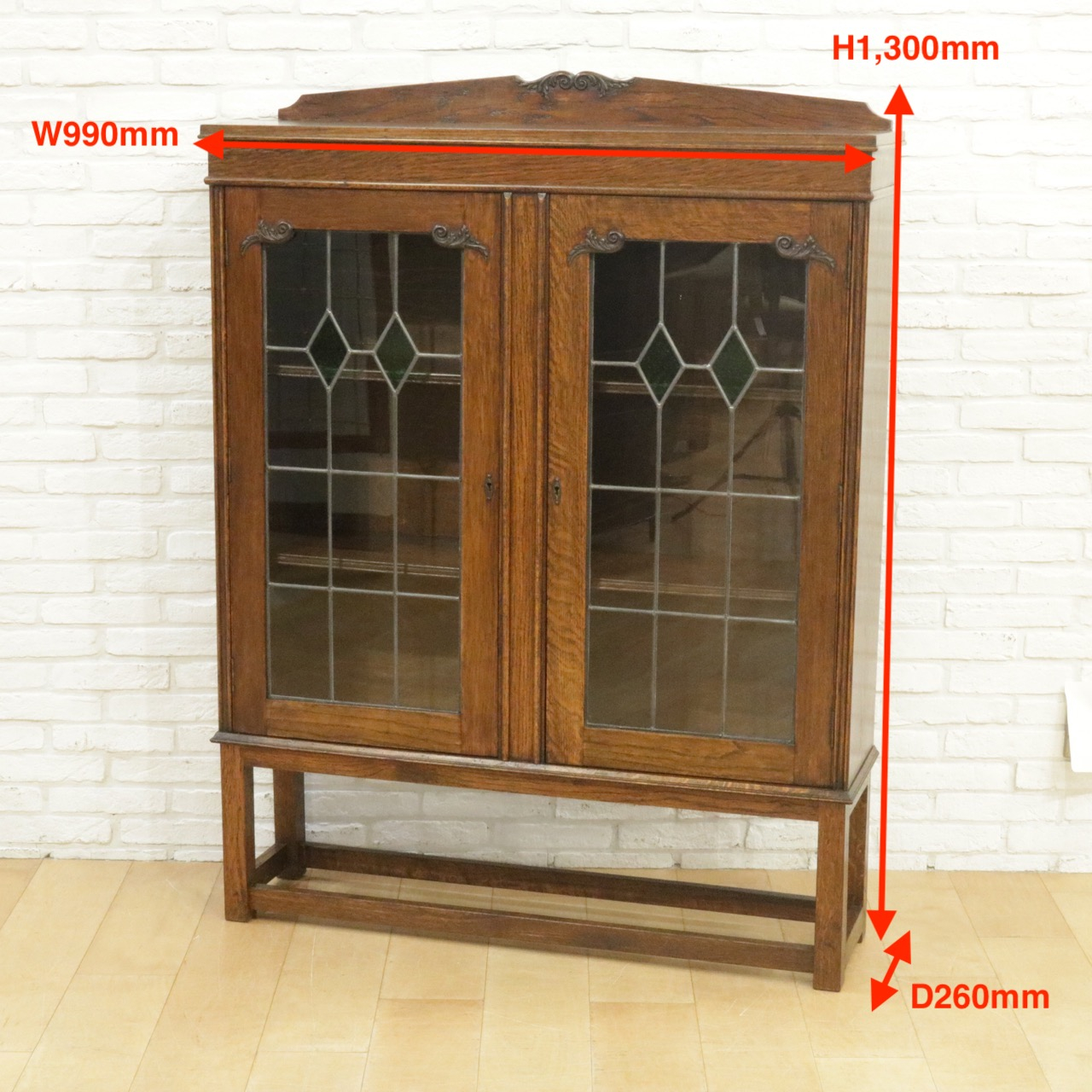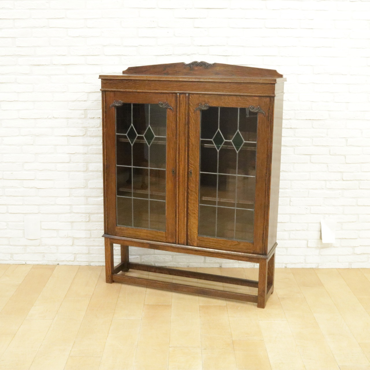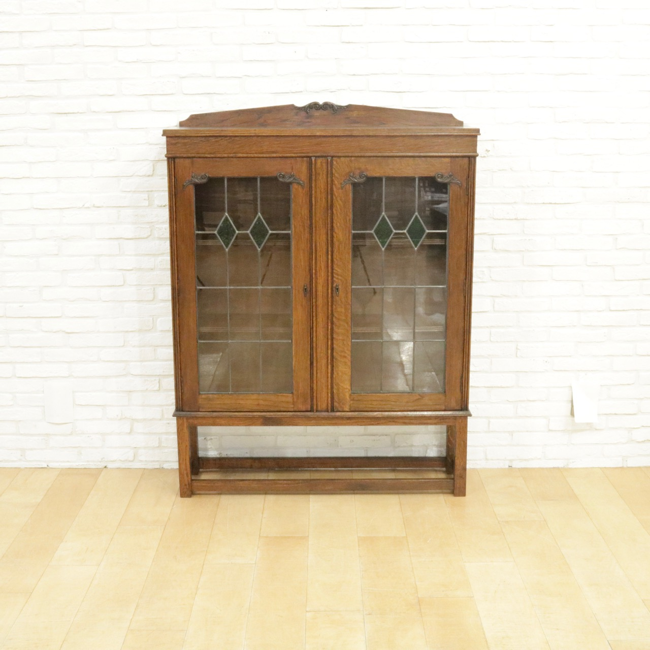配送料の目安 ▶︎1930年代、オーク材のブックケース 。グリーンのガラスが美しいアンティークらしいステンドグラスの扉に惹かれます。アカンサスの装飾もさり気なくポイントです。