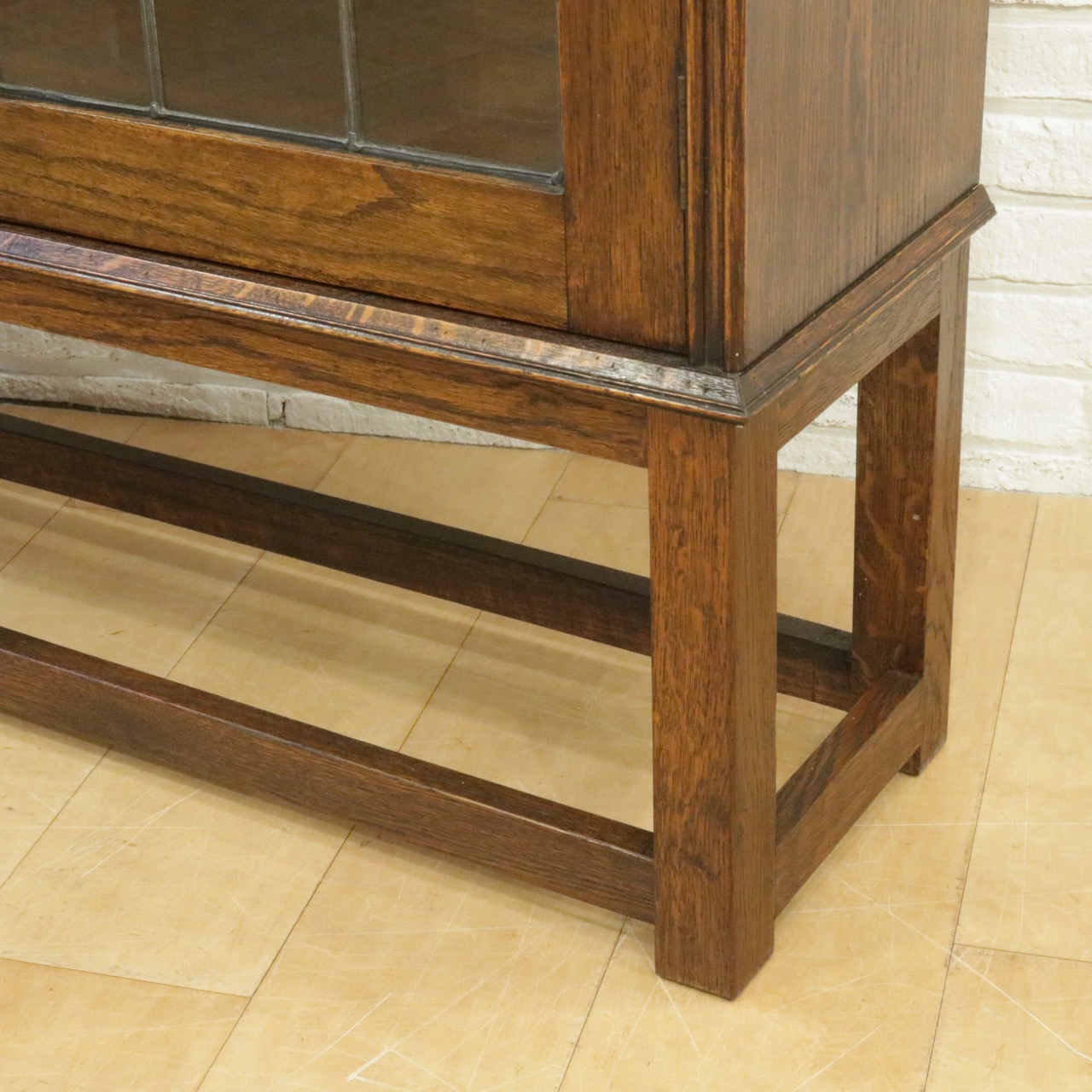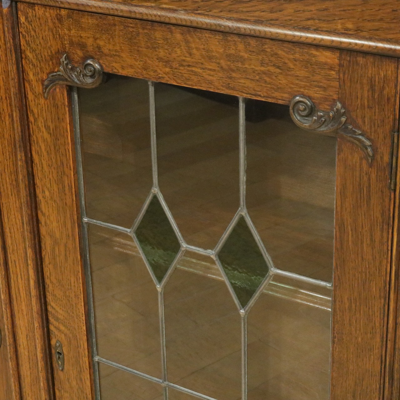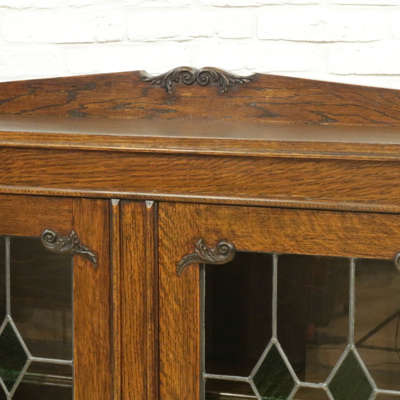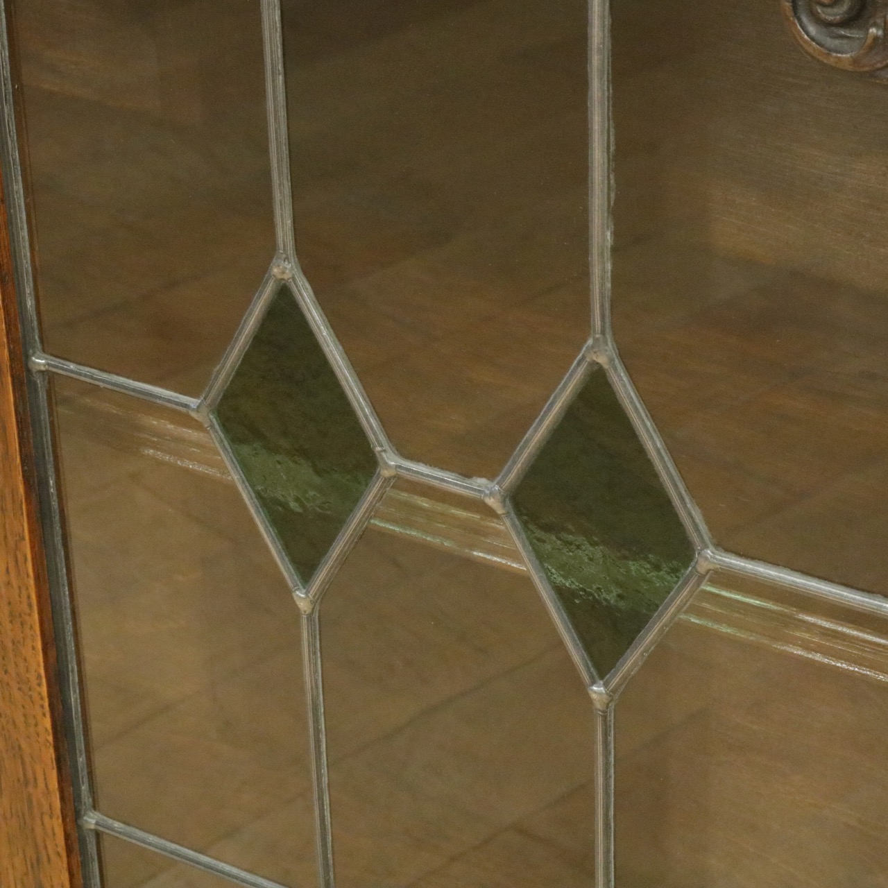 配送料の目安 ▶︎1930年代、オーク材のブックケース 。グリーンのガラスが美しいアンティークらしいステンドグラスの扉に惹かれます。アカンサスの装飾もさり気なくポイントです。