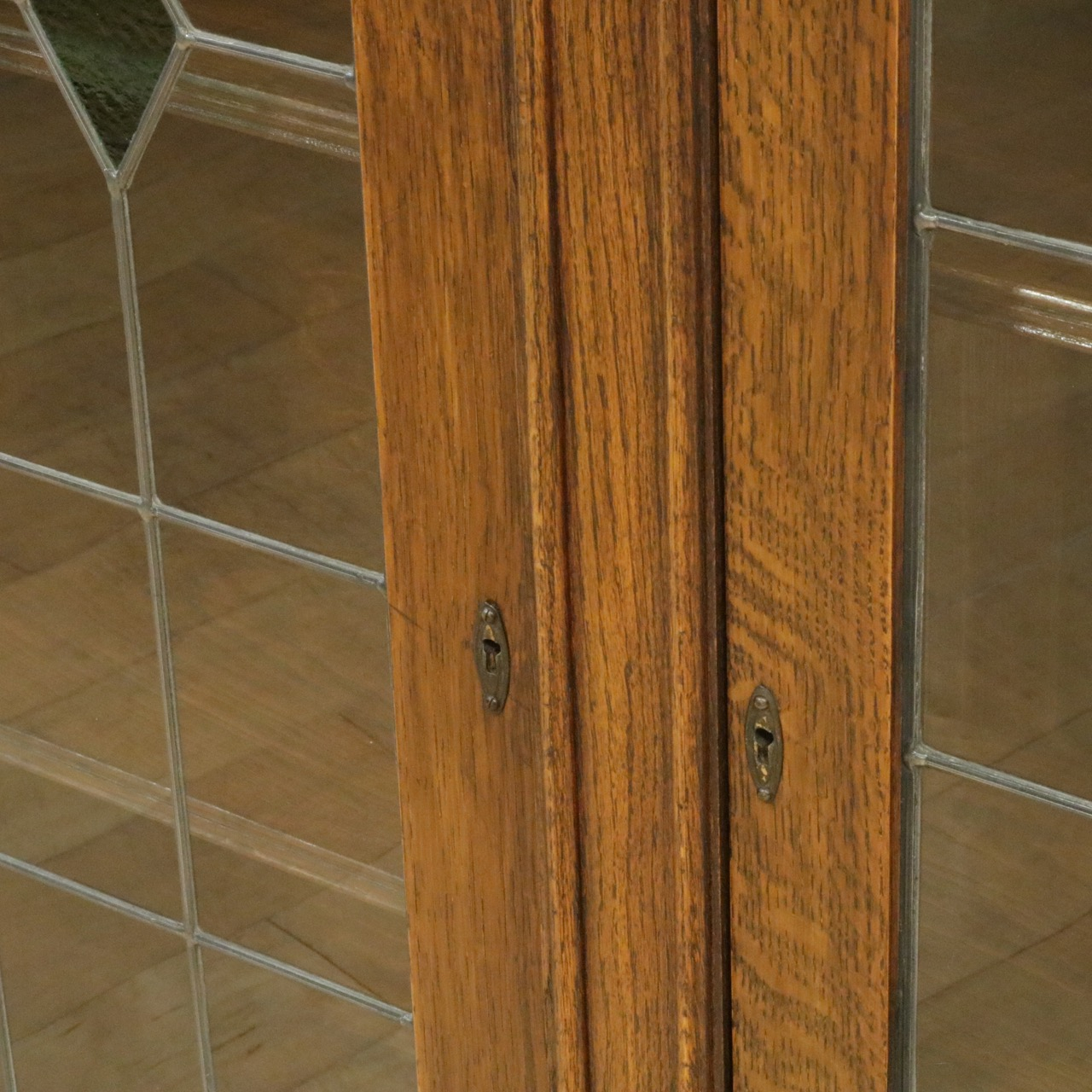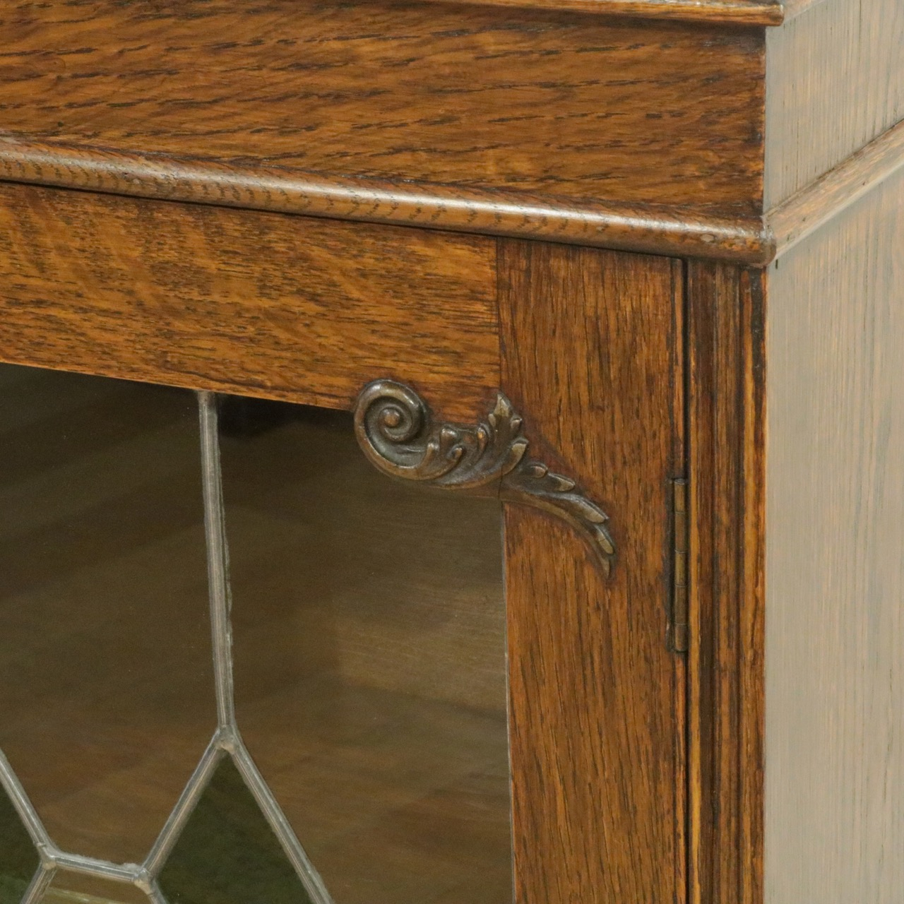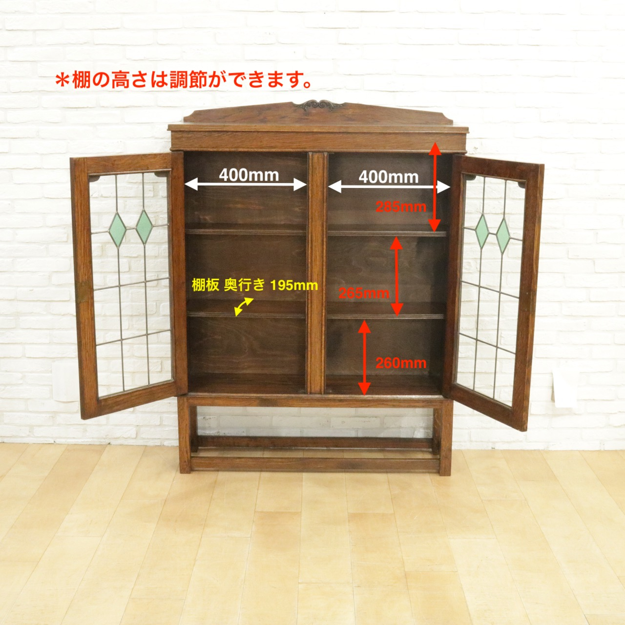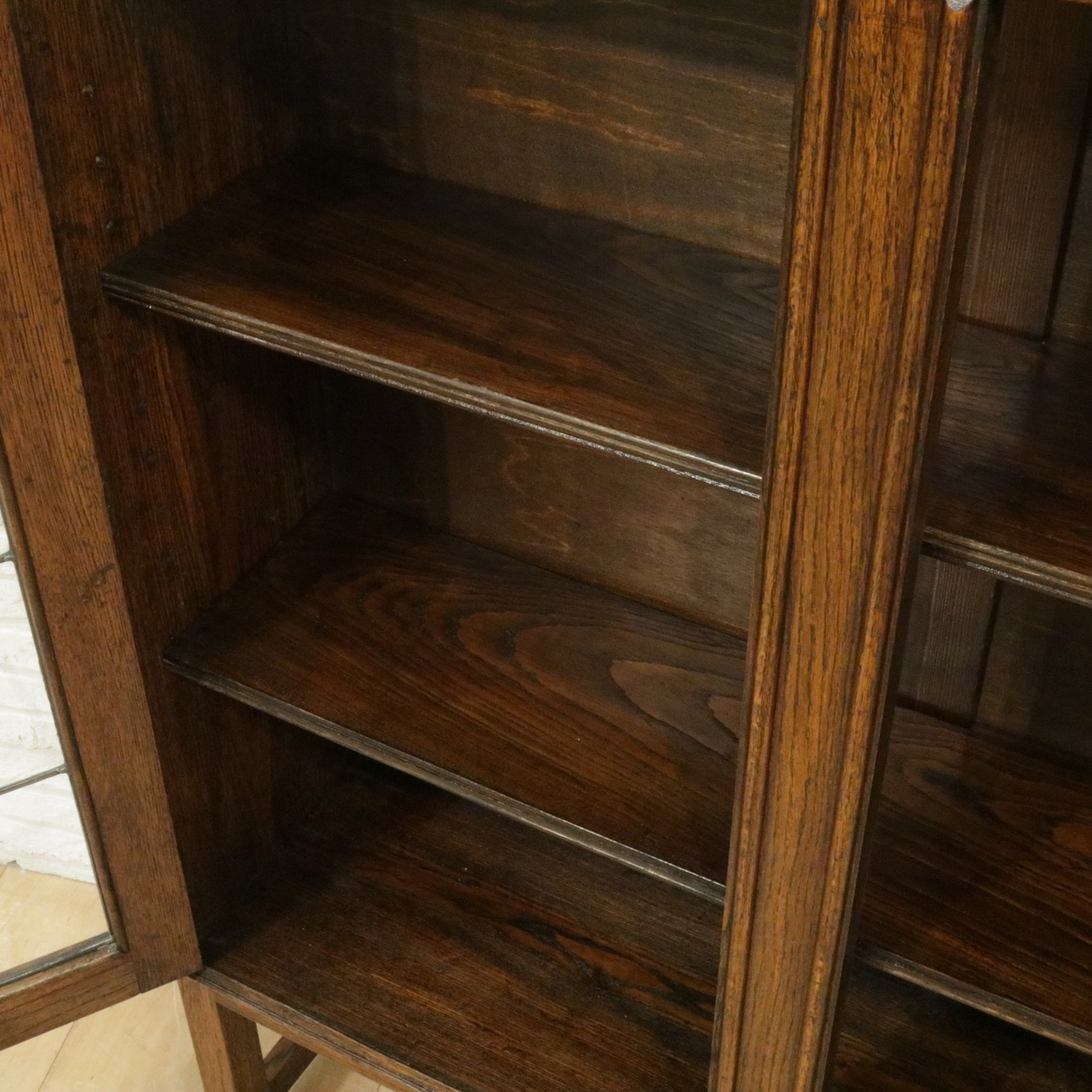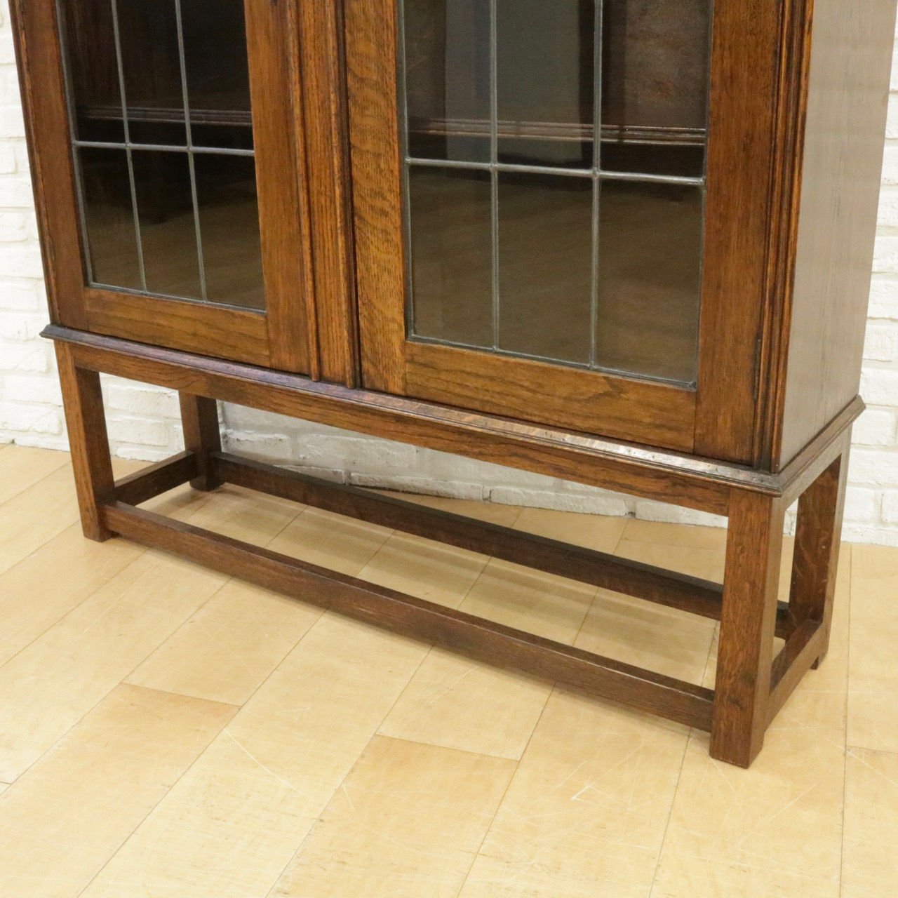 配送料の目安 ▶︎1930年代、オーク材のブックケース 。グリーンのガラスが美しいアンティークらしいステンドグラスの扉に惹かれます。アカンサスの装飾もさり気なくポイントです。
