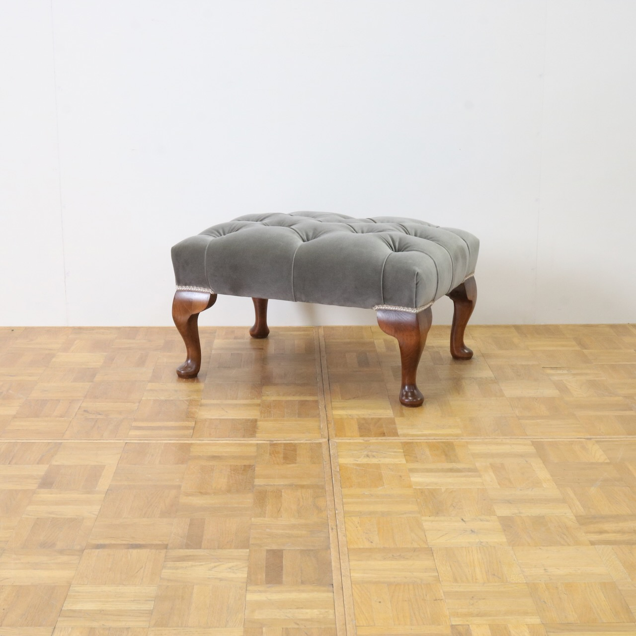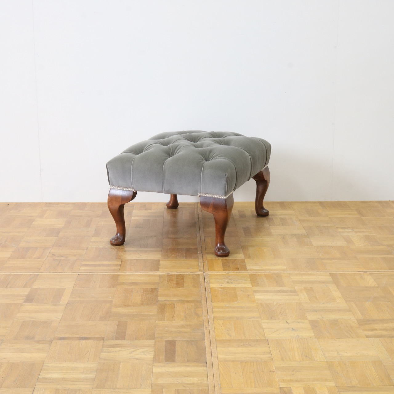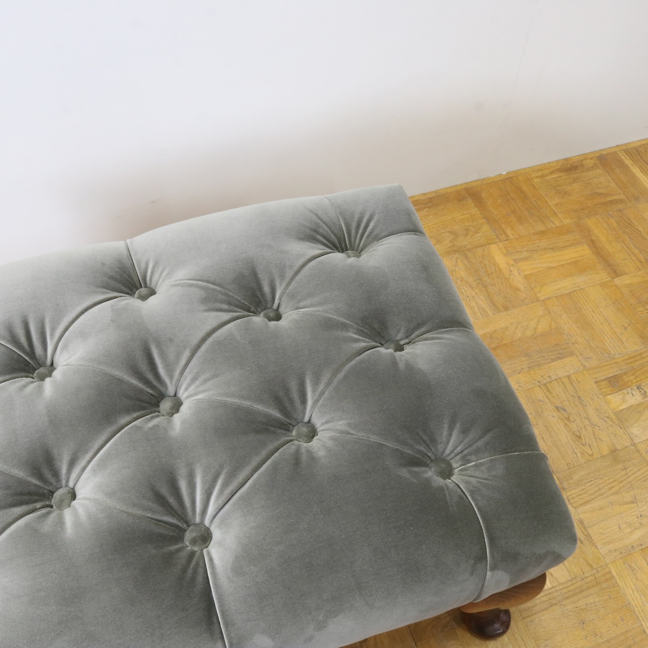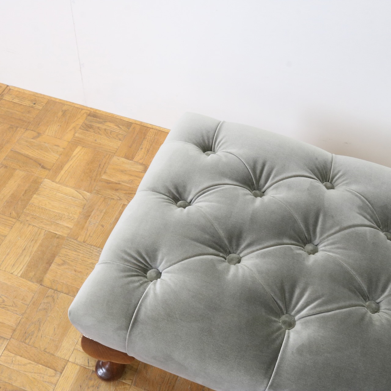 配送料の目安 ▶︎グレー色のベルベット生地が目を引くフットスツール。