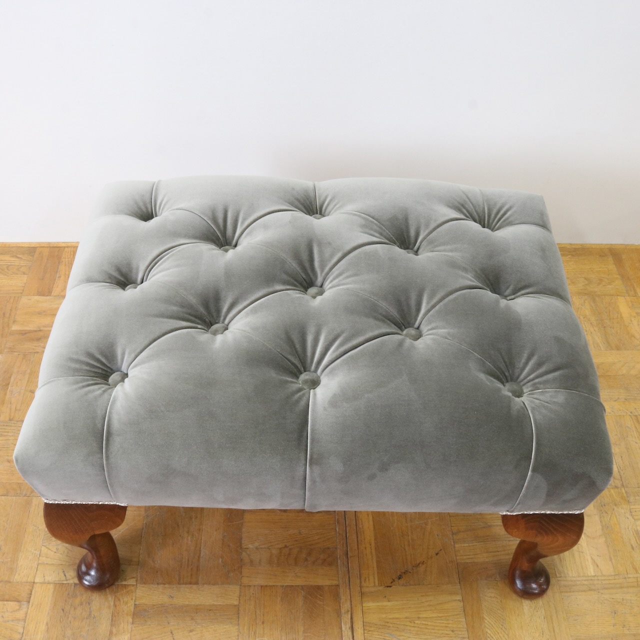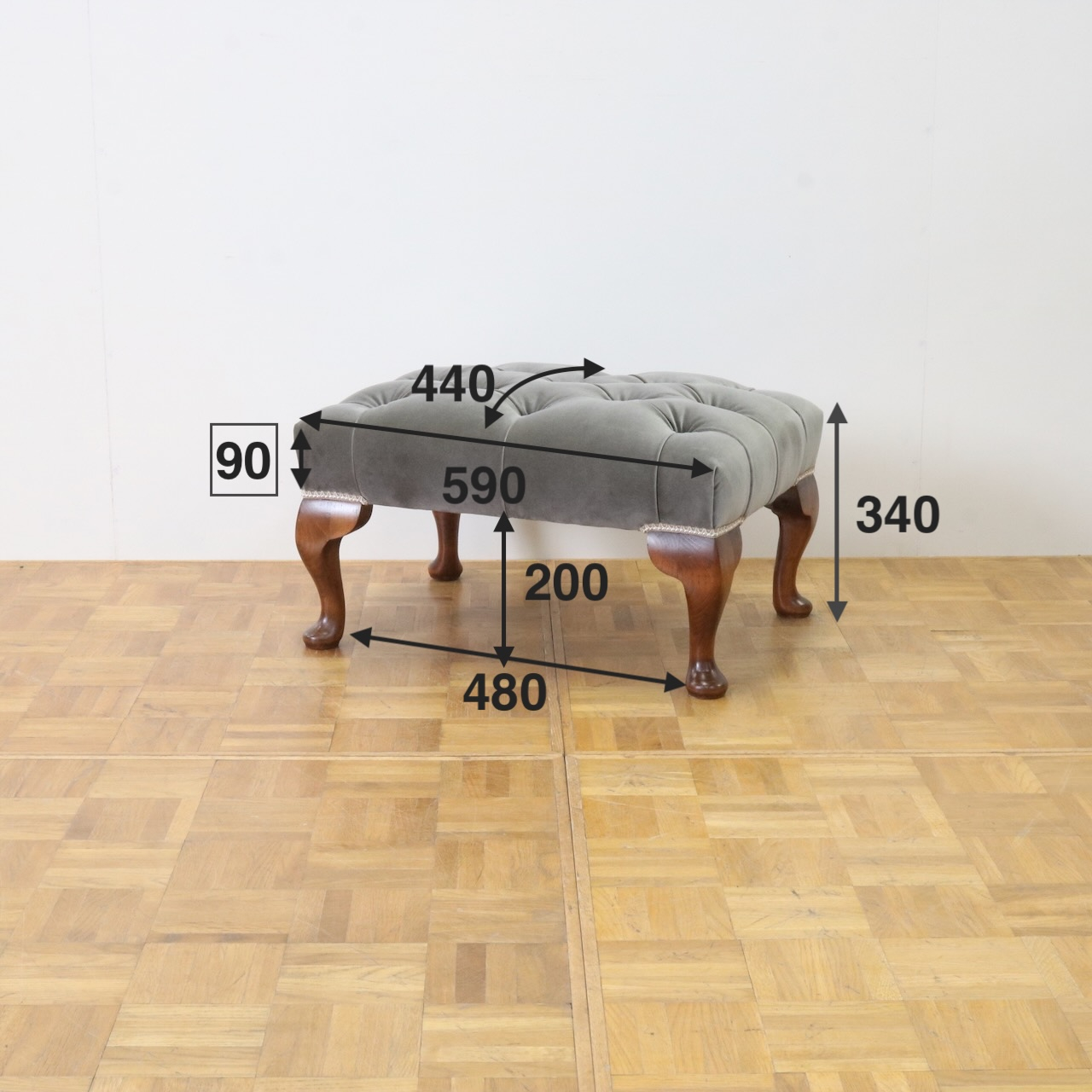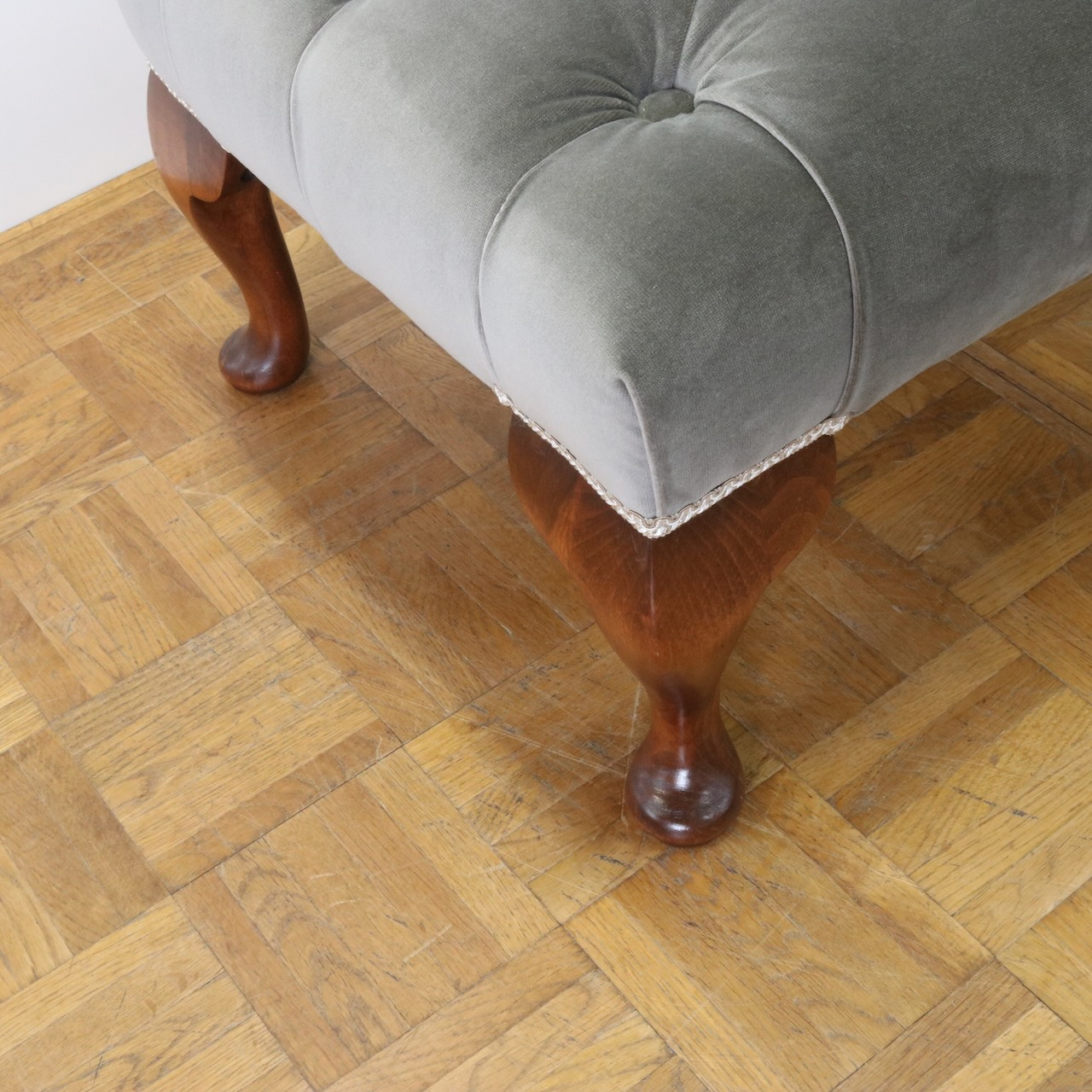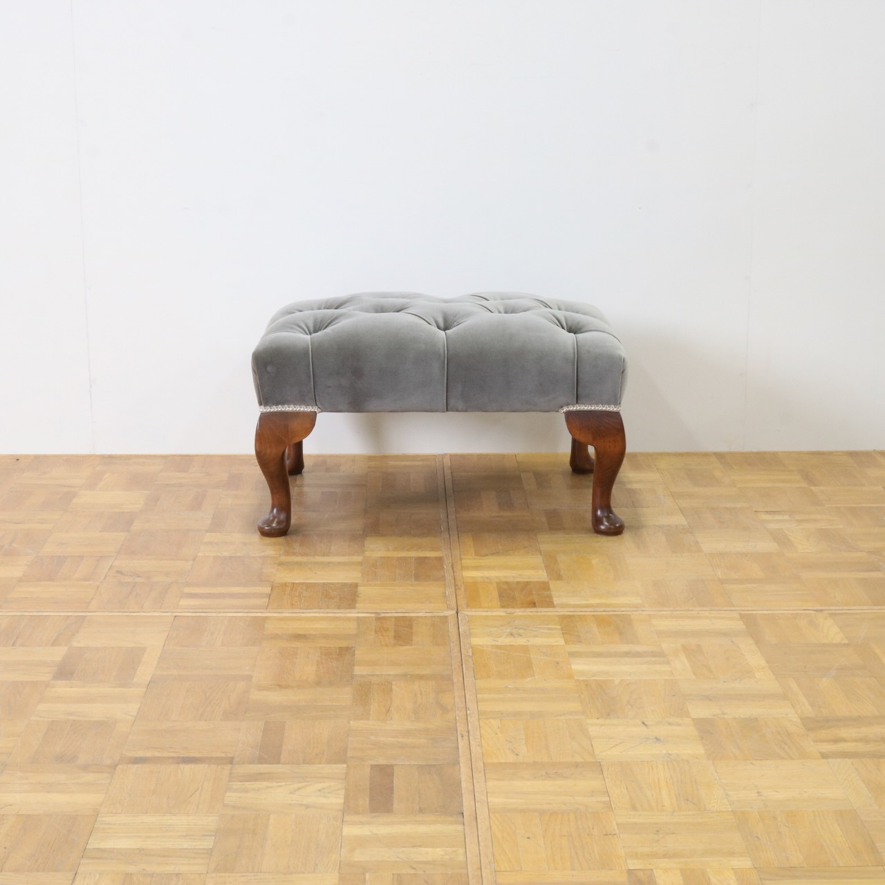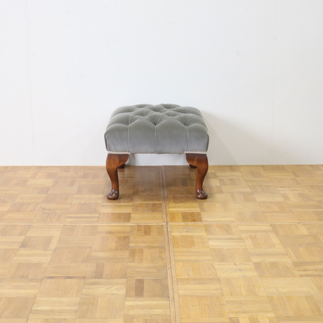 配送料の目安 ▶︎グレー色のベルベット生地が目を引くフットスツール。