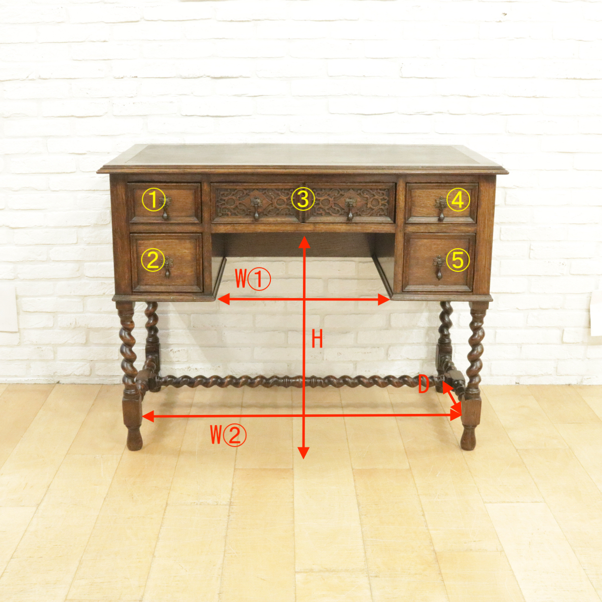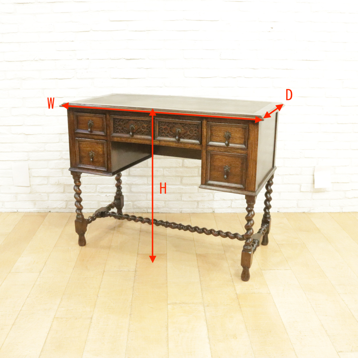 配送料の目安 ▶︎1930年代、オーク材のライティングデスク。引き出しの意匠やツイストレッグなどがアンティークらしい雰囲気を放っています。比較的コンパクトなサイズでご自宅でのお仕事などにも使いやすいお品です。