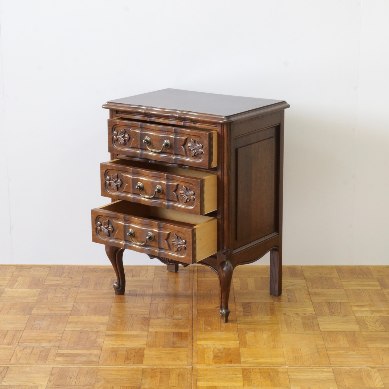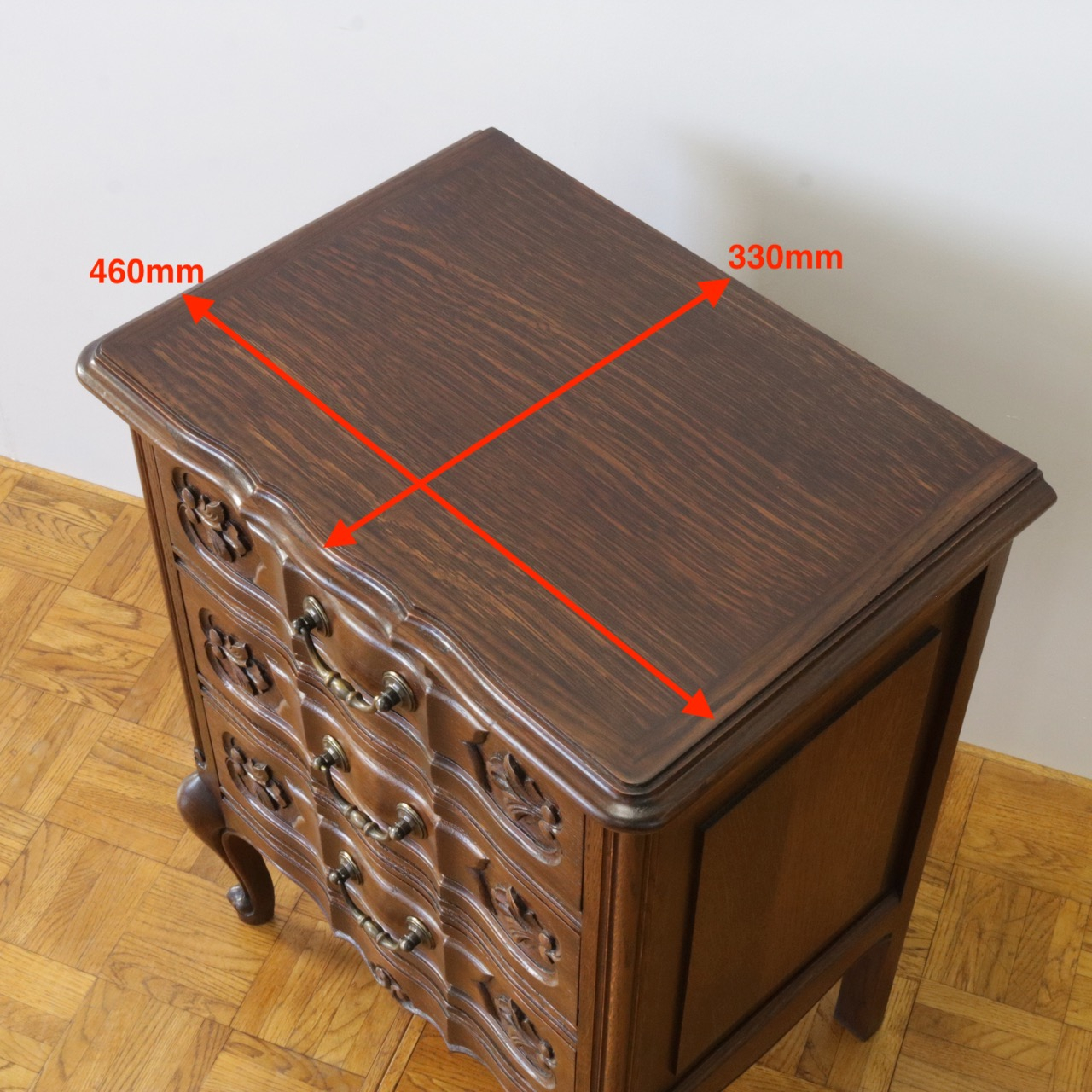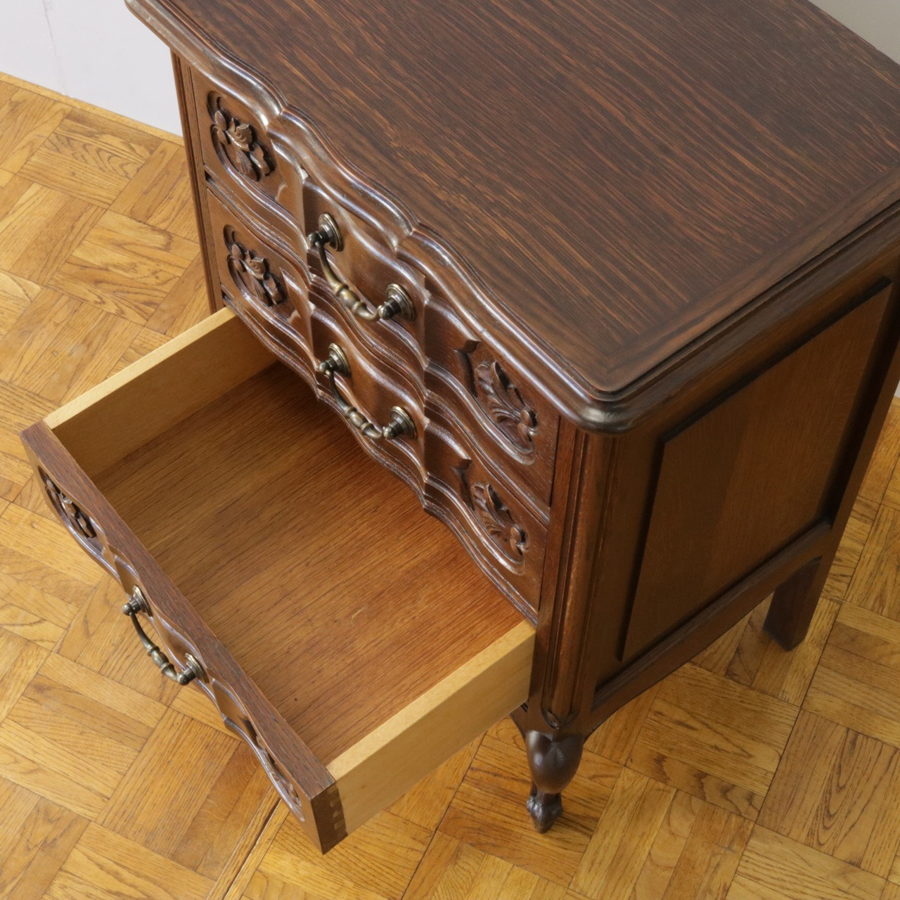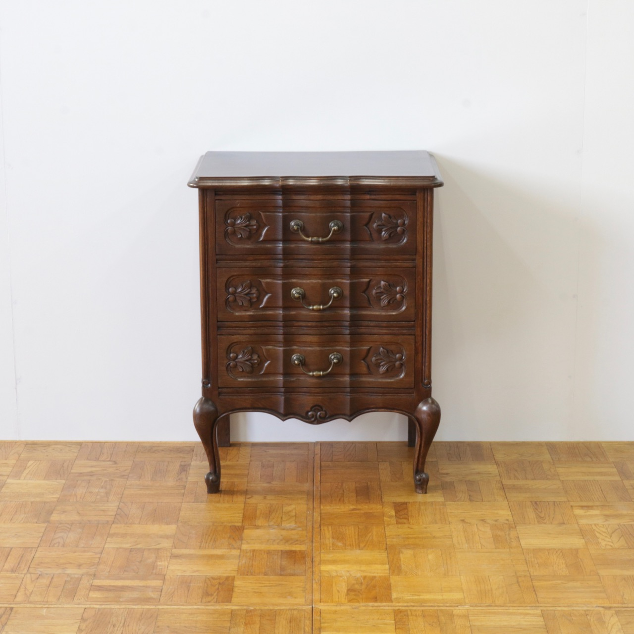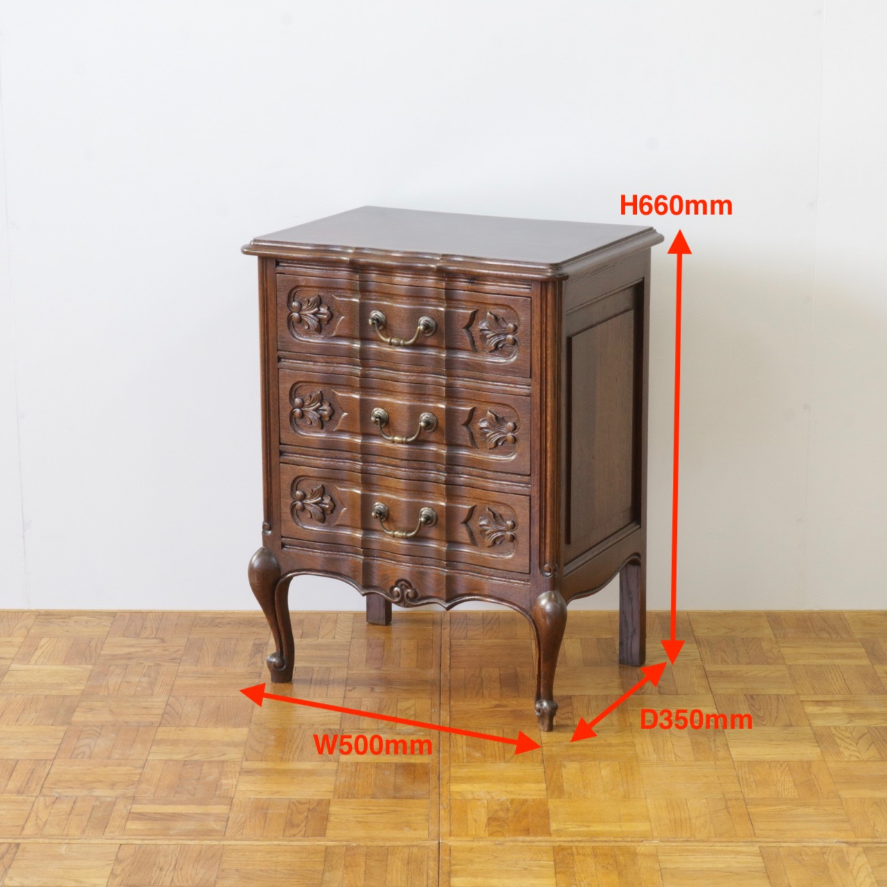 配送料の目安 ▶︎オーク材のチェスト。素朴で優しい風合いに優雅な植物彫刻がアクセントに施されています。ベッドサイドからリビング、玄関先など様々なスペースに取り入れやすいコンパクトサイズも嬉しいポイント。