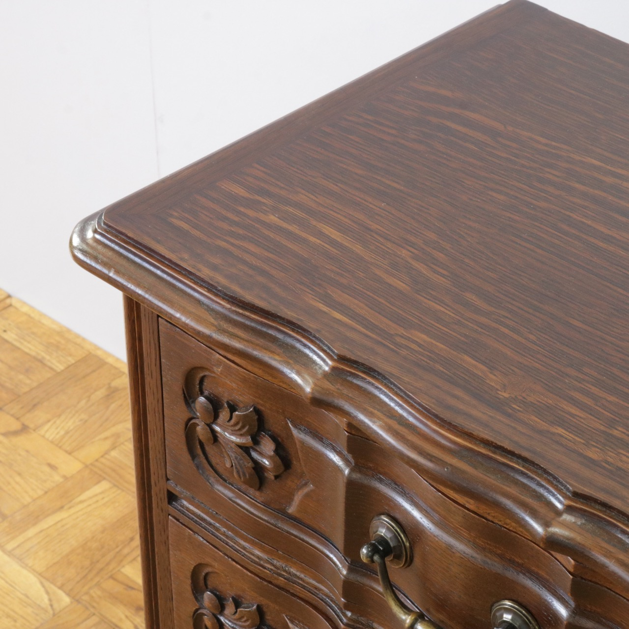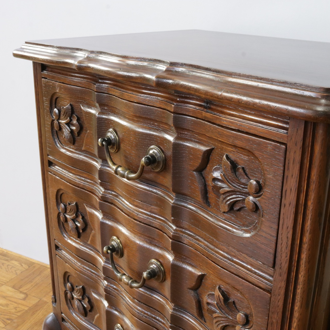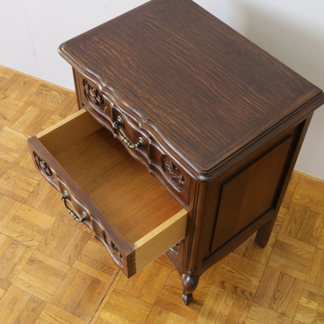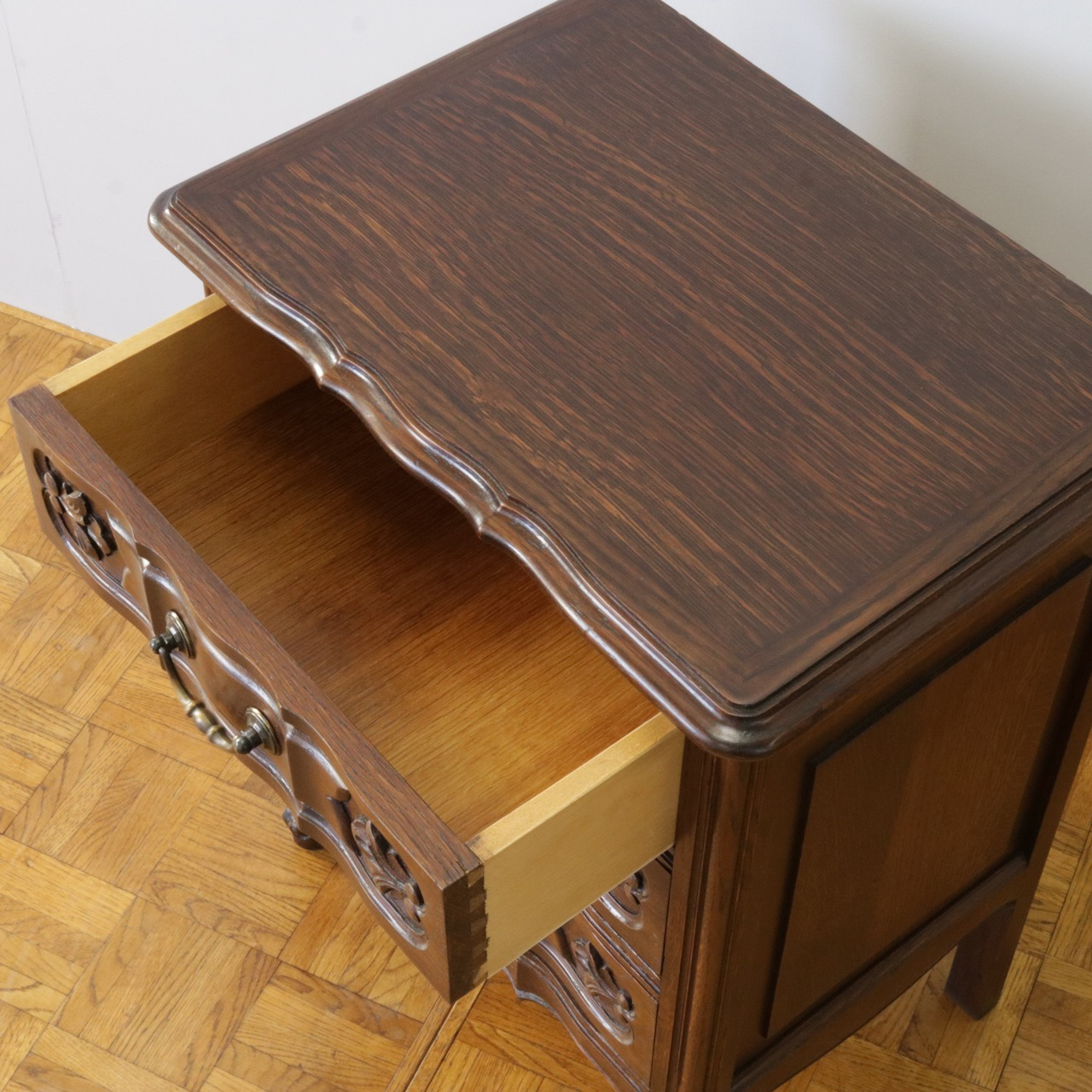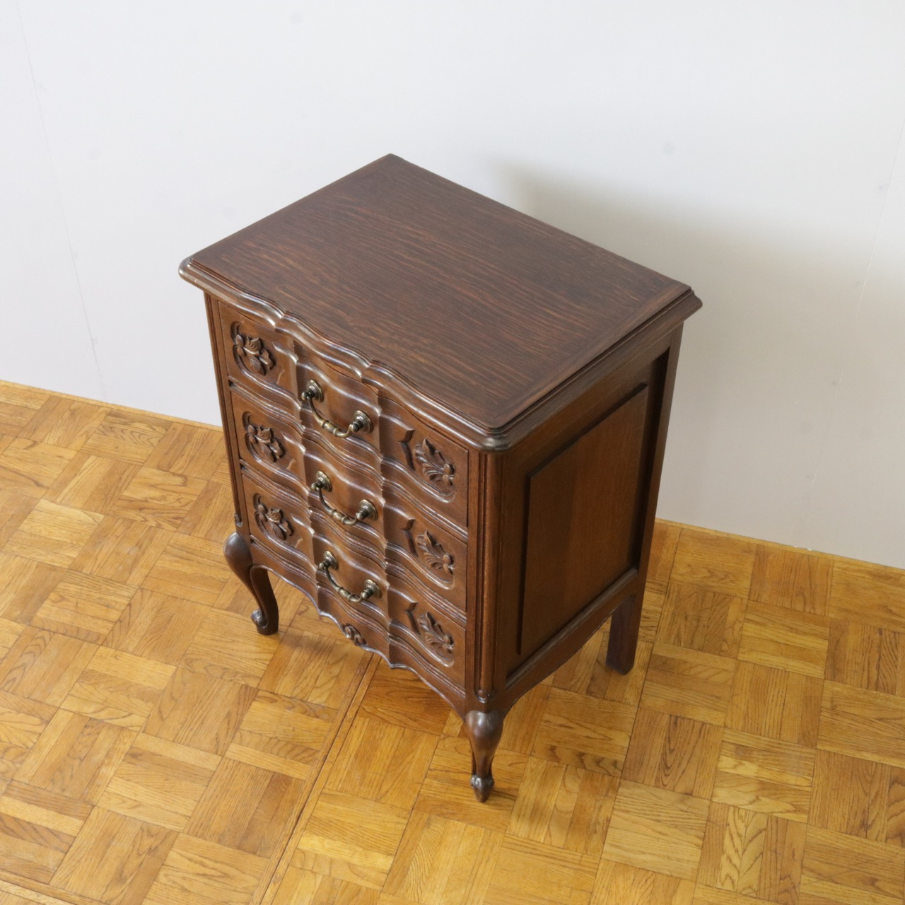 配送料の目安 ▶︎オーク材のチェスト。素朴で優しい風合いに優雅な植物彫刻がアクセントに施されています。ベッドサイドからリビング、玄関先など様々なスペースに取り入れやすいコンパクトサイズも嬉しいポイント。