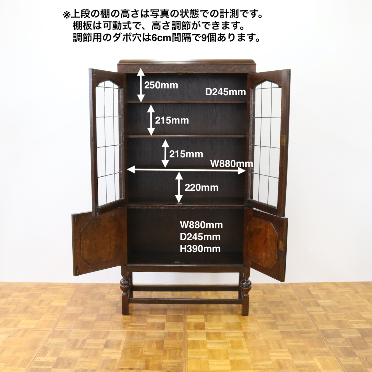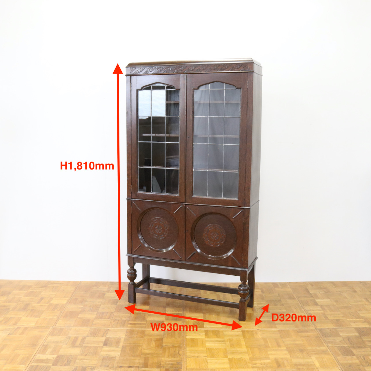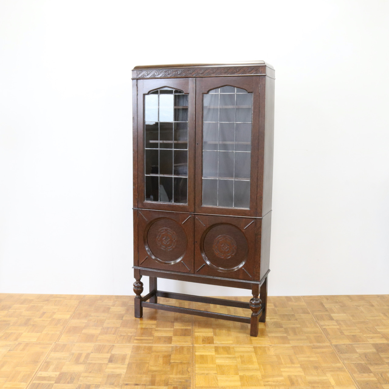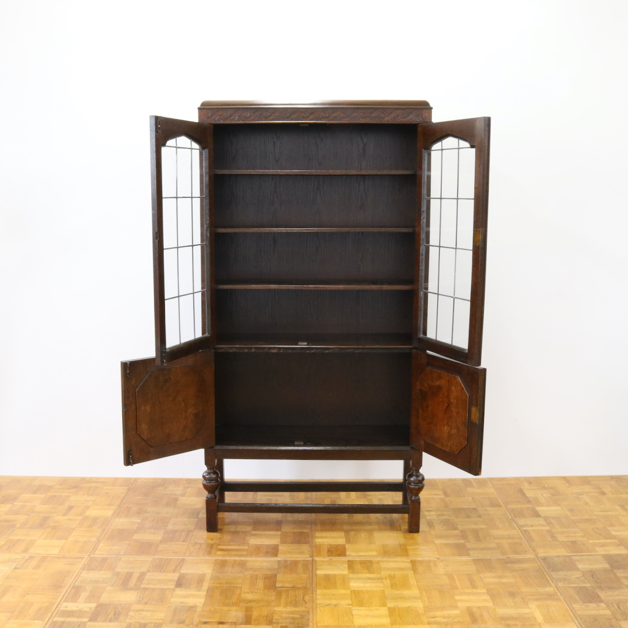 ガラス扉の内側も鉛の枠線が盛り上がり、アンティークらしい表情を見せています。