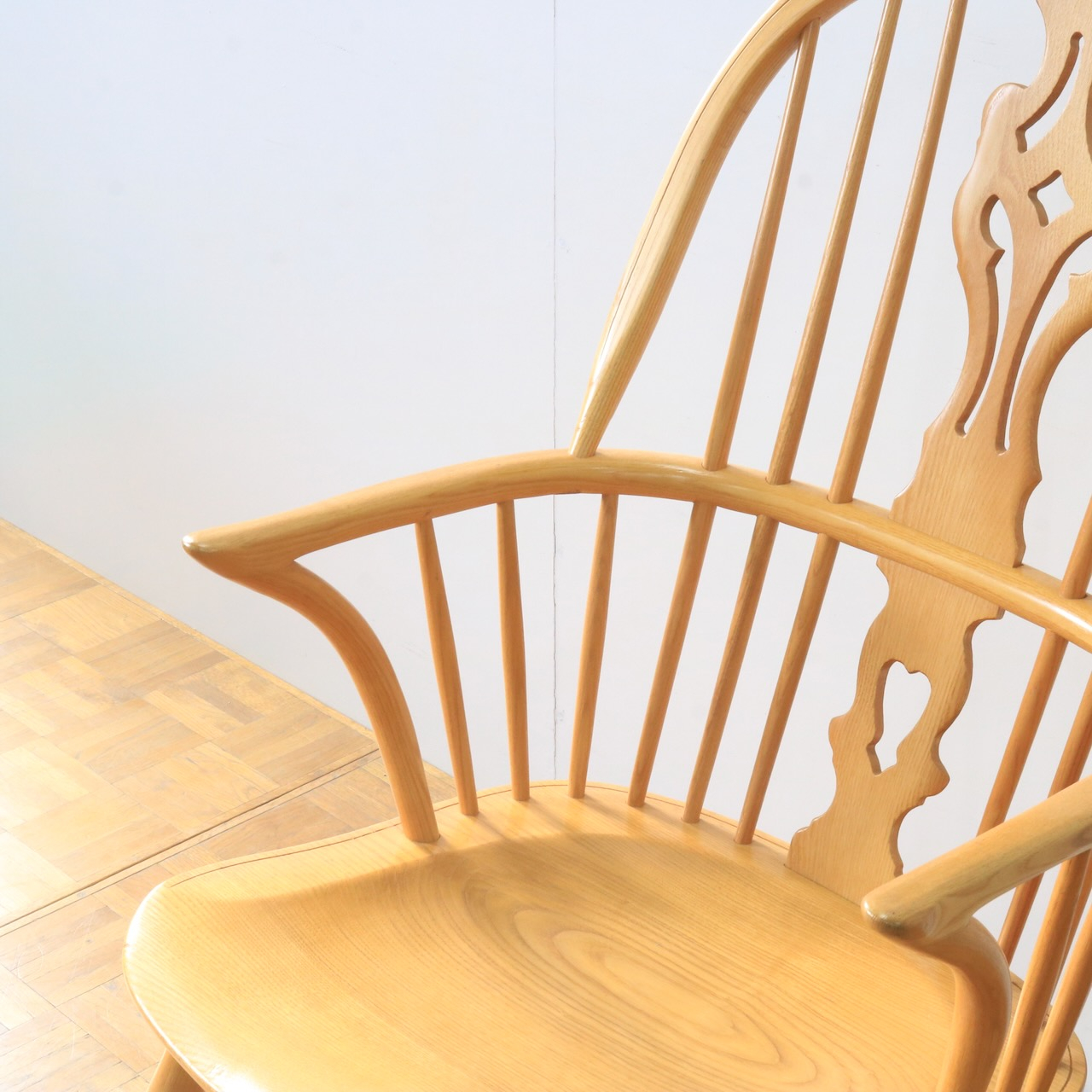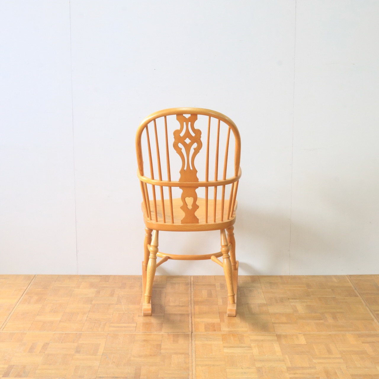 明るい色味で温もりあるアームチェアー。背やアーム、脚を繋ぐストレッチャーなど飽きのこないデザインです。