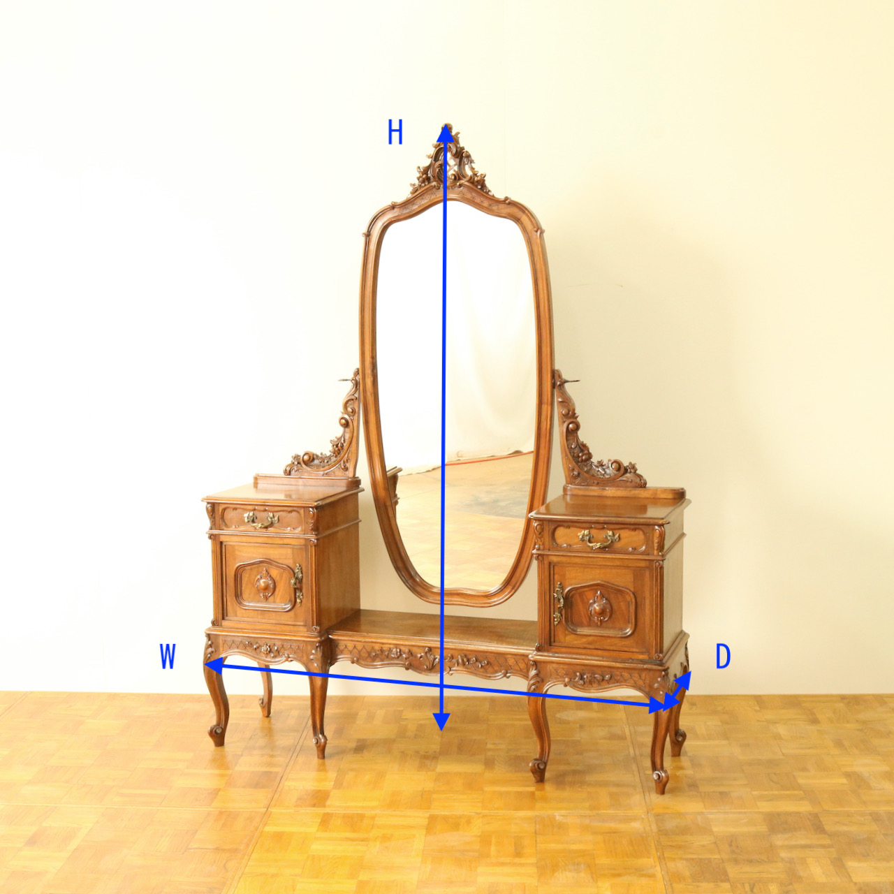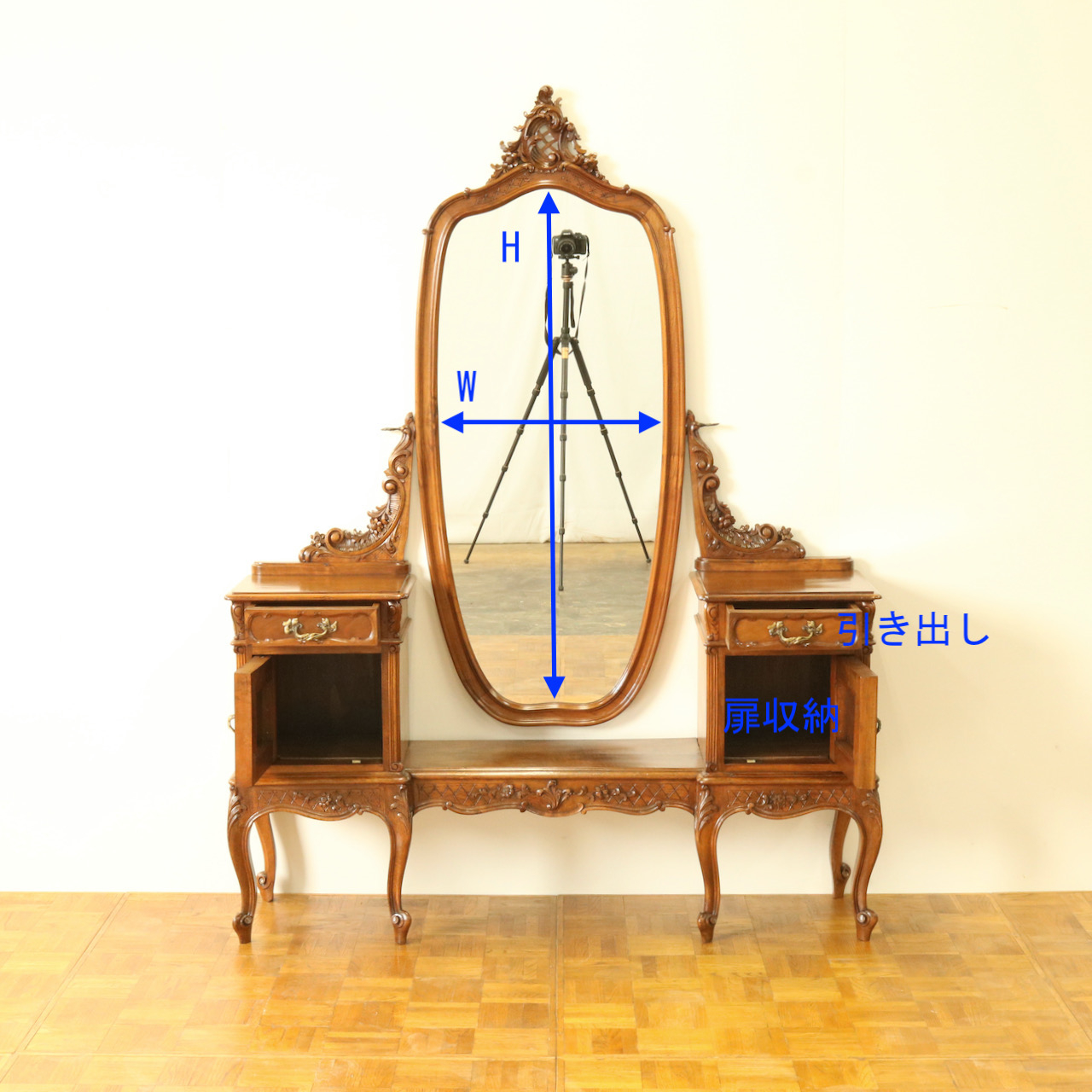 アカンサスのスクロールとロカイユ、フラワーモチーフがミラーサイドに添います。