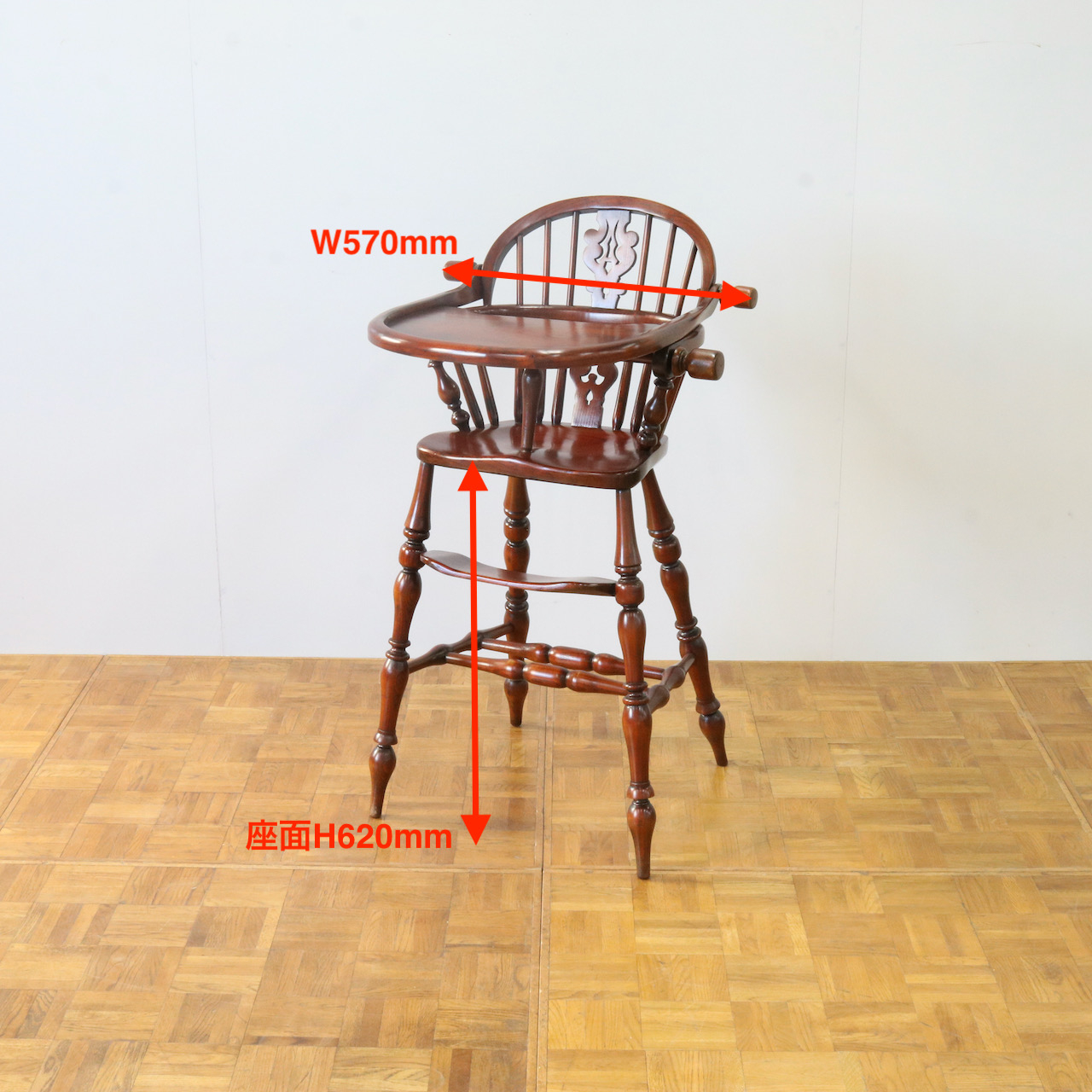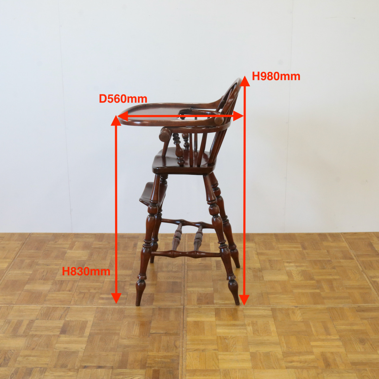 小さなテーブルや転落防止のバーがついています。アンティークならではの木肌のつや感や挽物装飾も魅力的なアイテム。