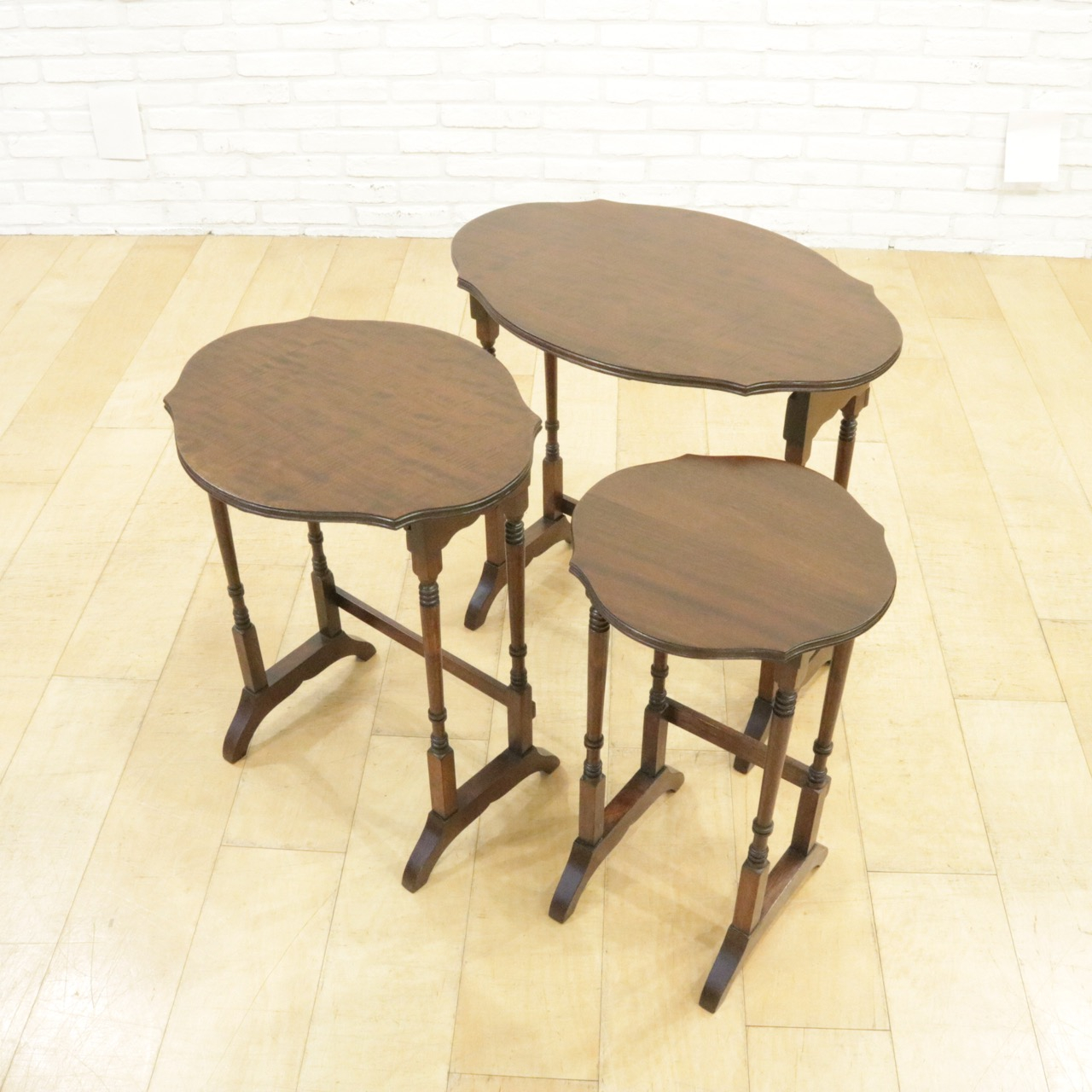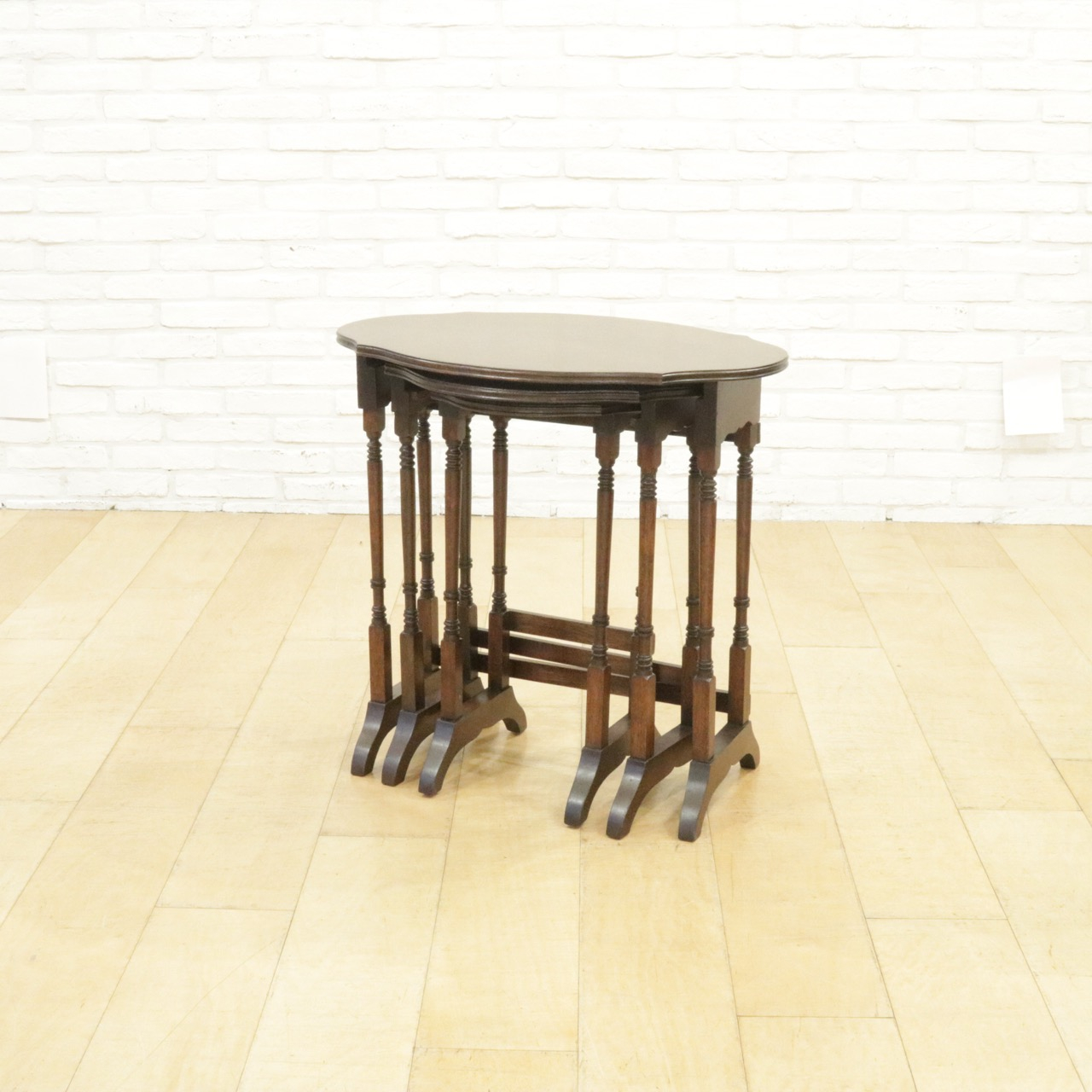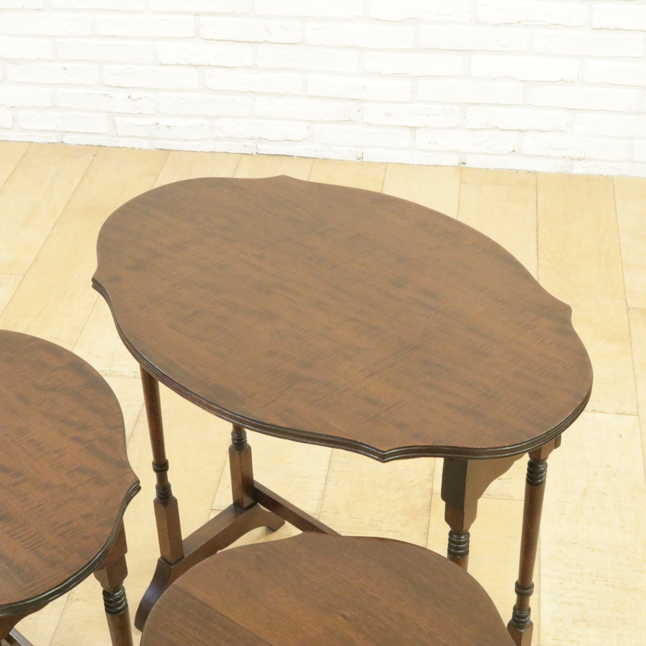シンプルな楕円形ではなく少しアクセントがつけてある天板がかわいらしく、挽物加工の飾りがさりげなく刻まれた繊細な脚も洗練された雰囲気です。3つのテーブルが入れ子になっていて、必要なときにだけ小さなテーブルを取り出しても、それぞれ別の場所で使っても。