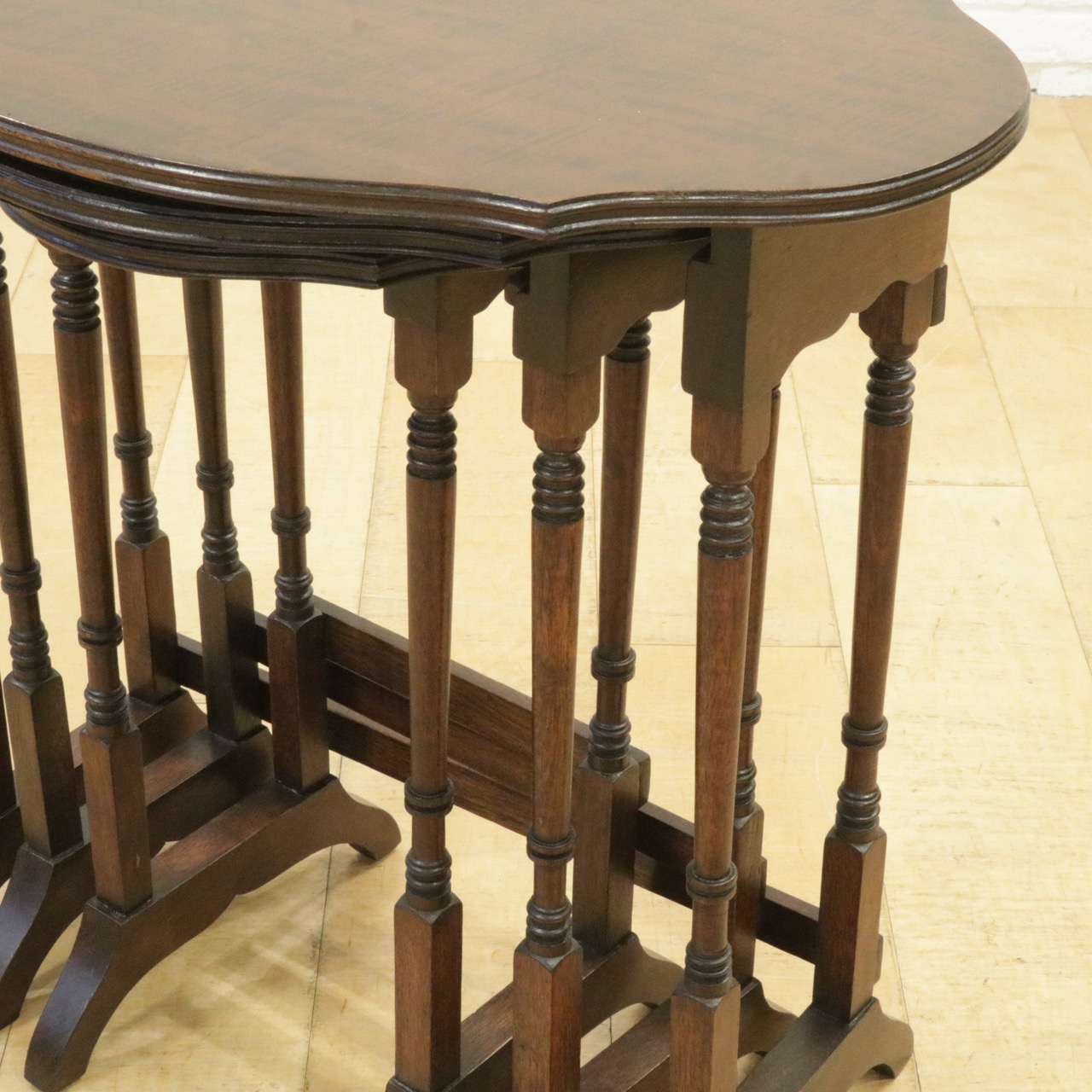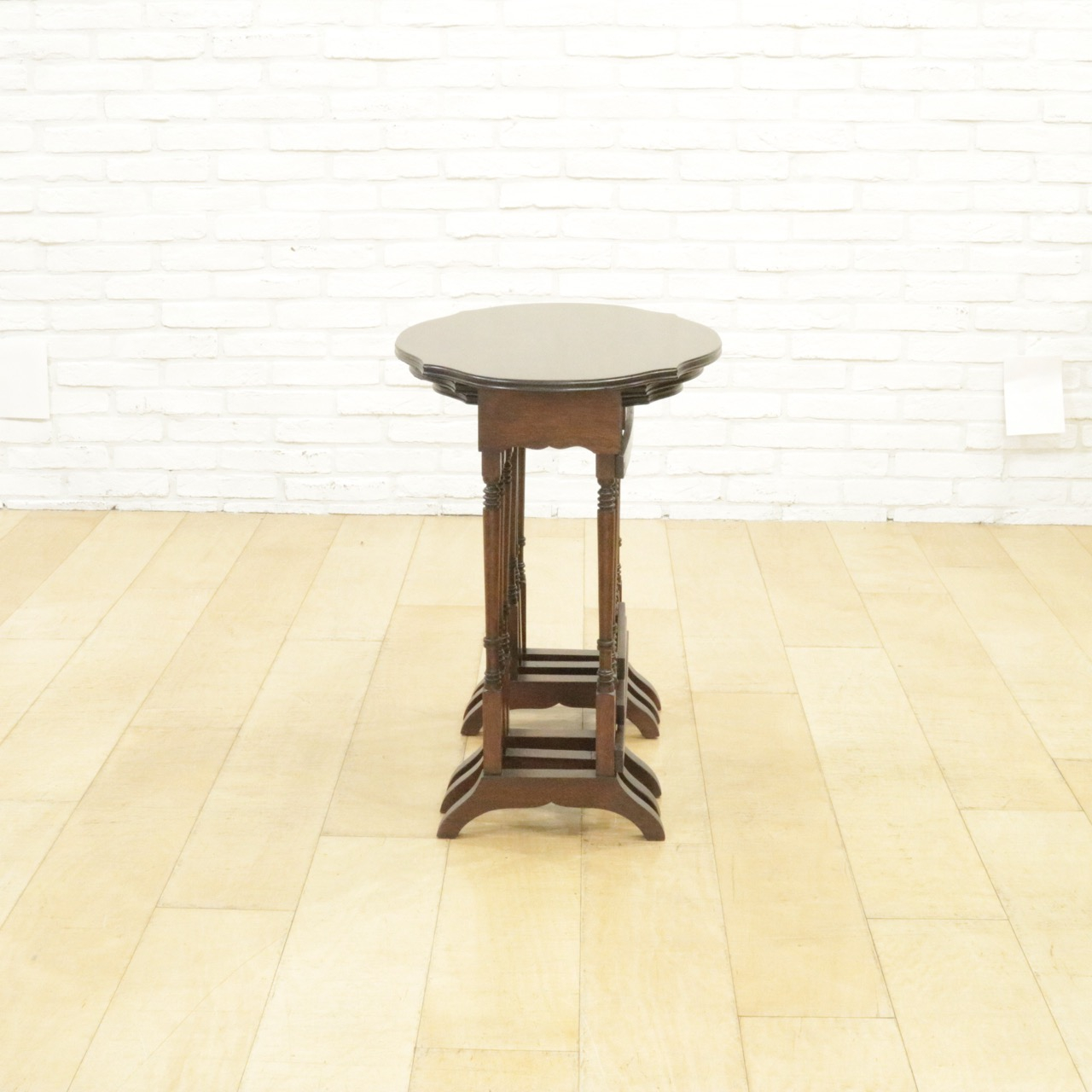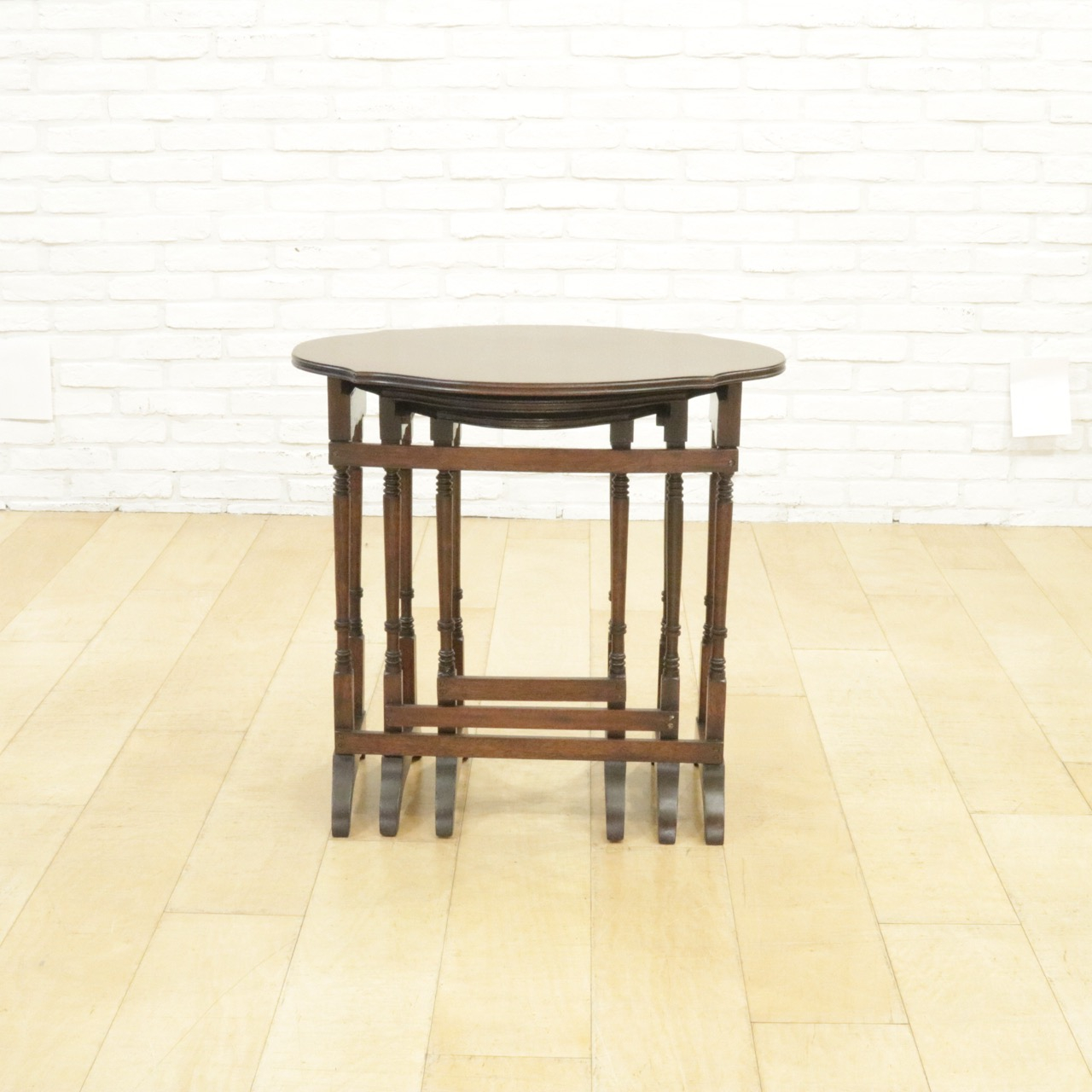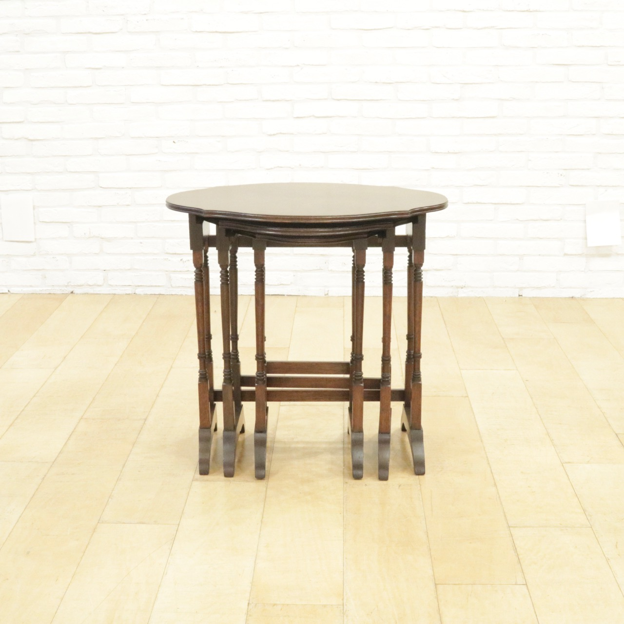 シンプルな楕円形ではなく少しアクセントがつけてある天板がかわいらしく、挽物加工の飾りがさりげなく刻まれた繊細な脚も洗練された雰囲気です。3つのテーブルが入れ子になっていて、必要なときにだけ小さなテーブルを取り出しても、それぞれ別の場所で使っても。