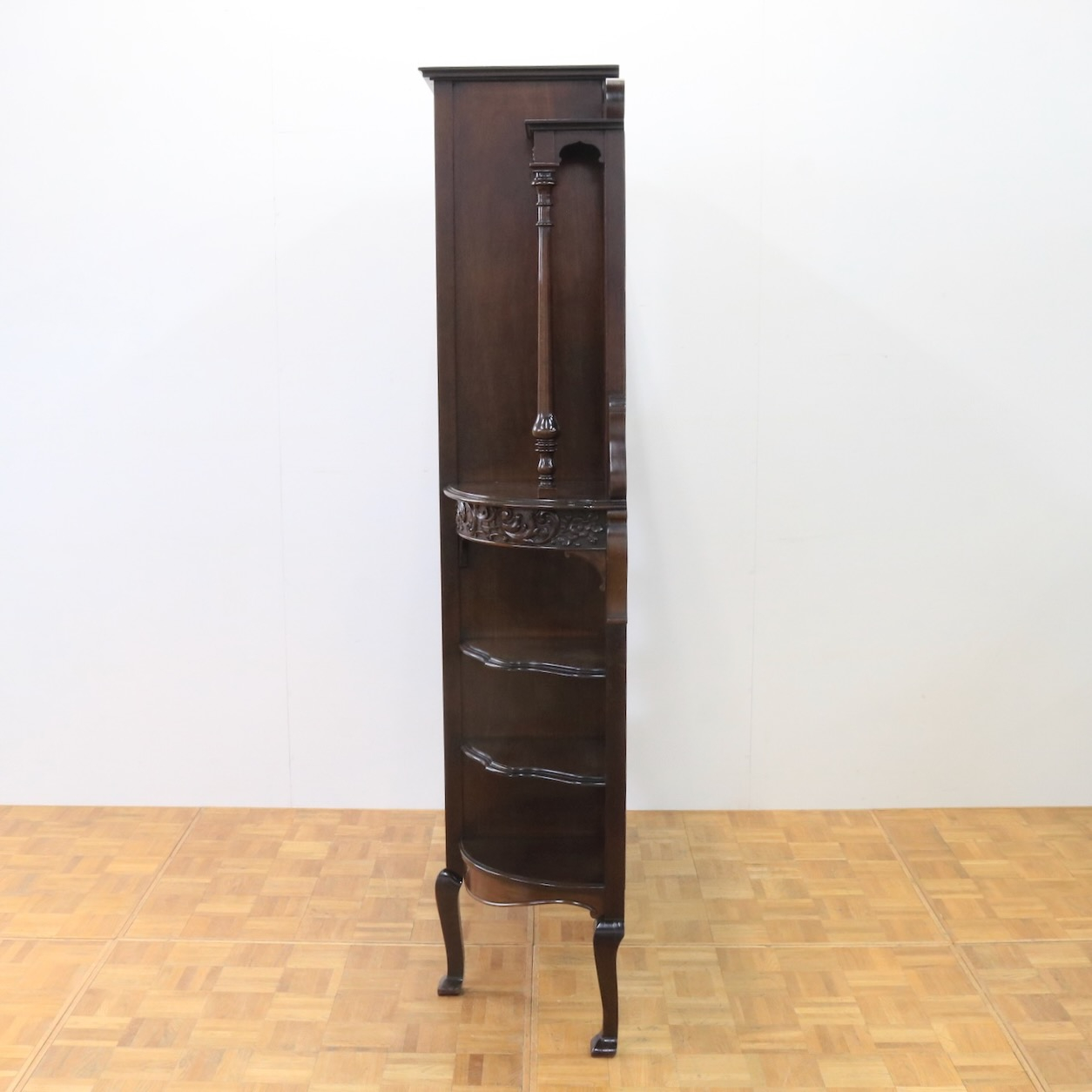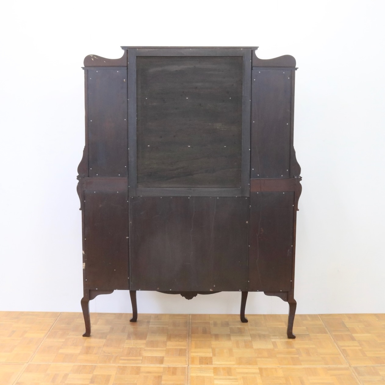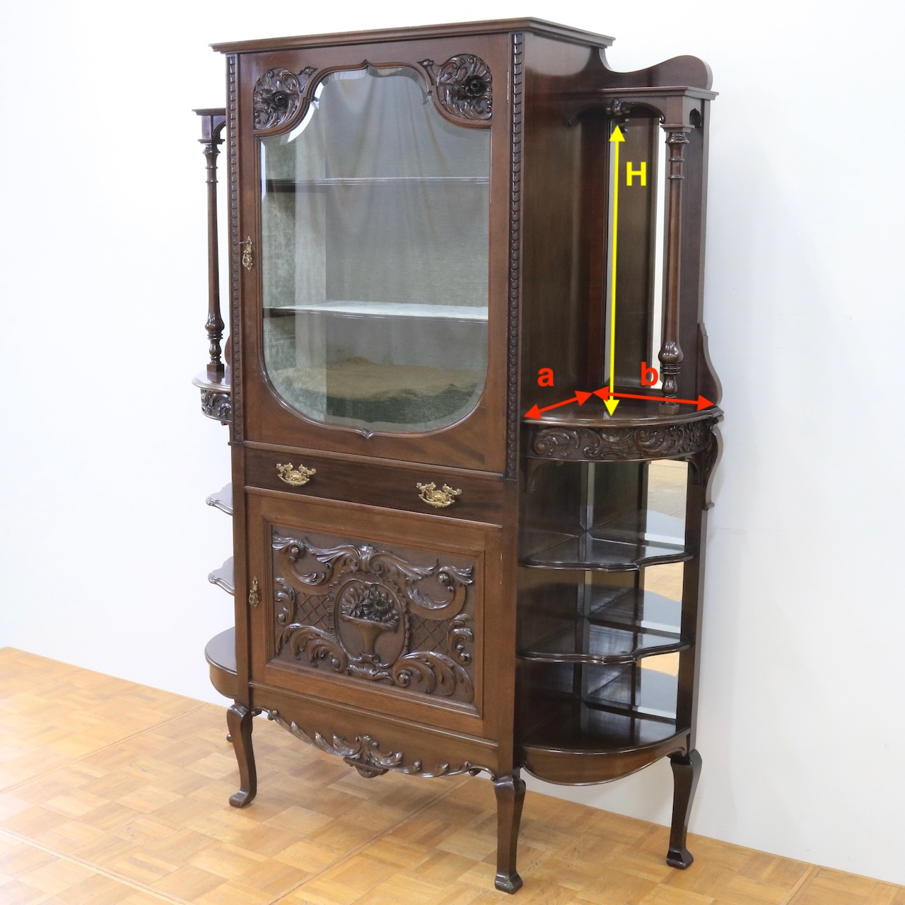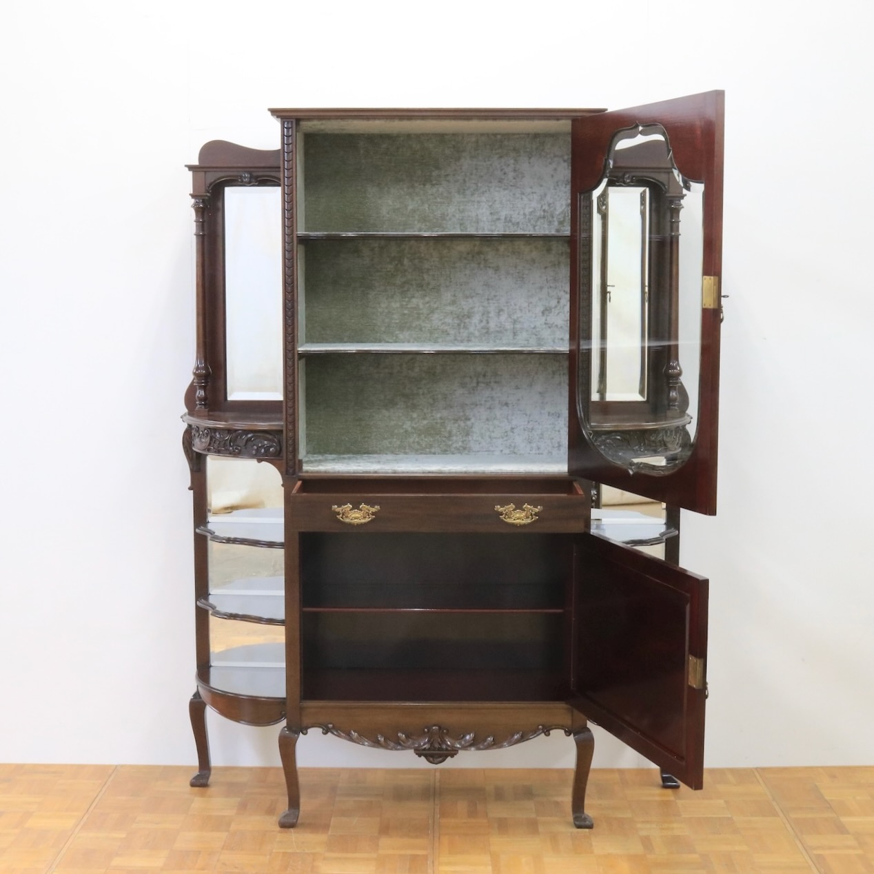 1910年代、マホガニーのパーラーキャビネット。各所に贅沢に施された彫刻に目を見張ります。リビングのメインに相応しい華やかな佇まい。扉収納とオープン棚の組み合わせで、飾り方のバリエーションも豊かです。