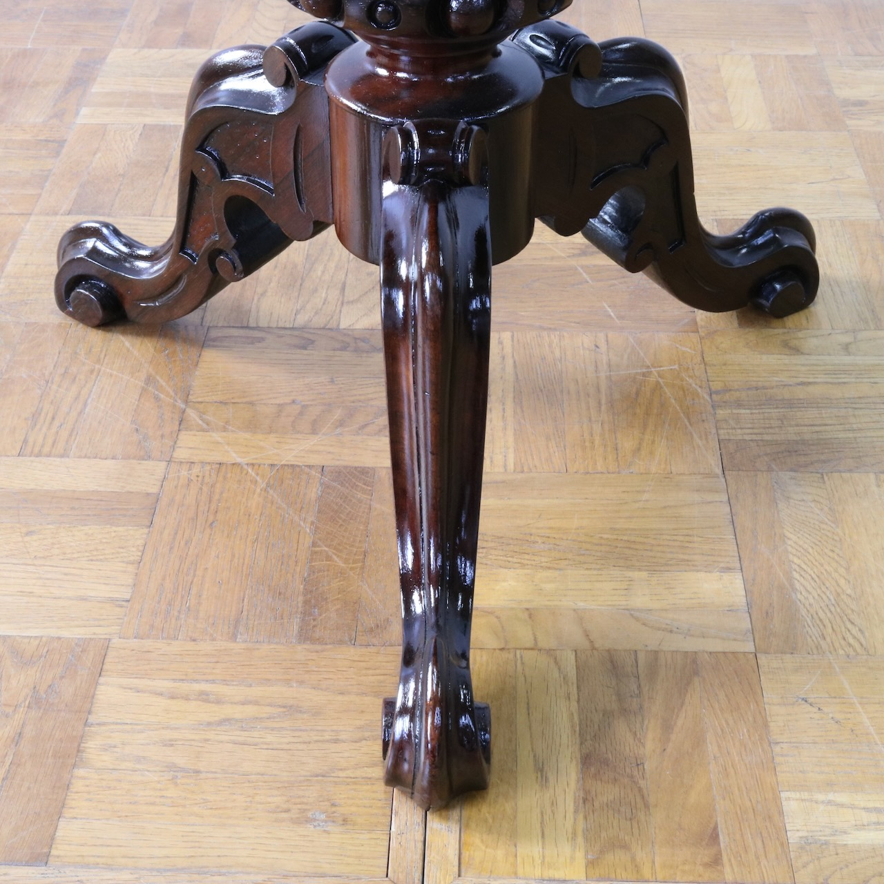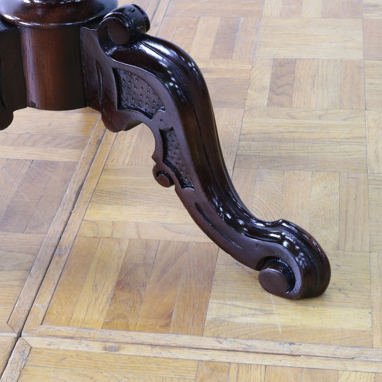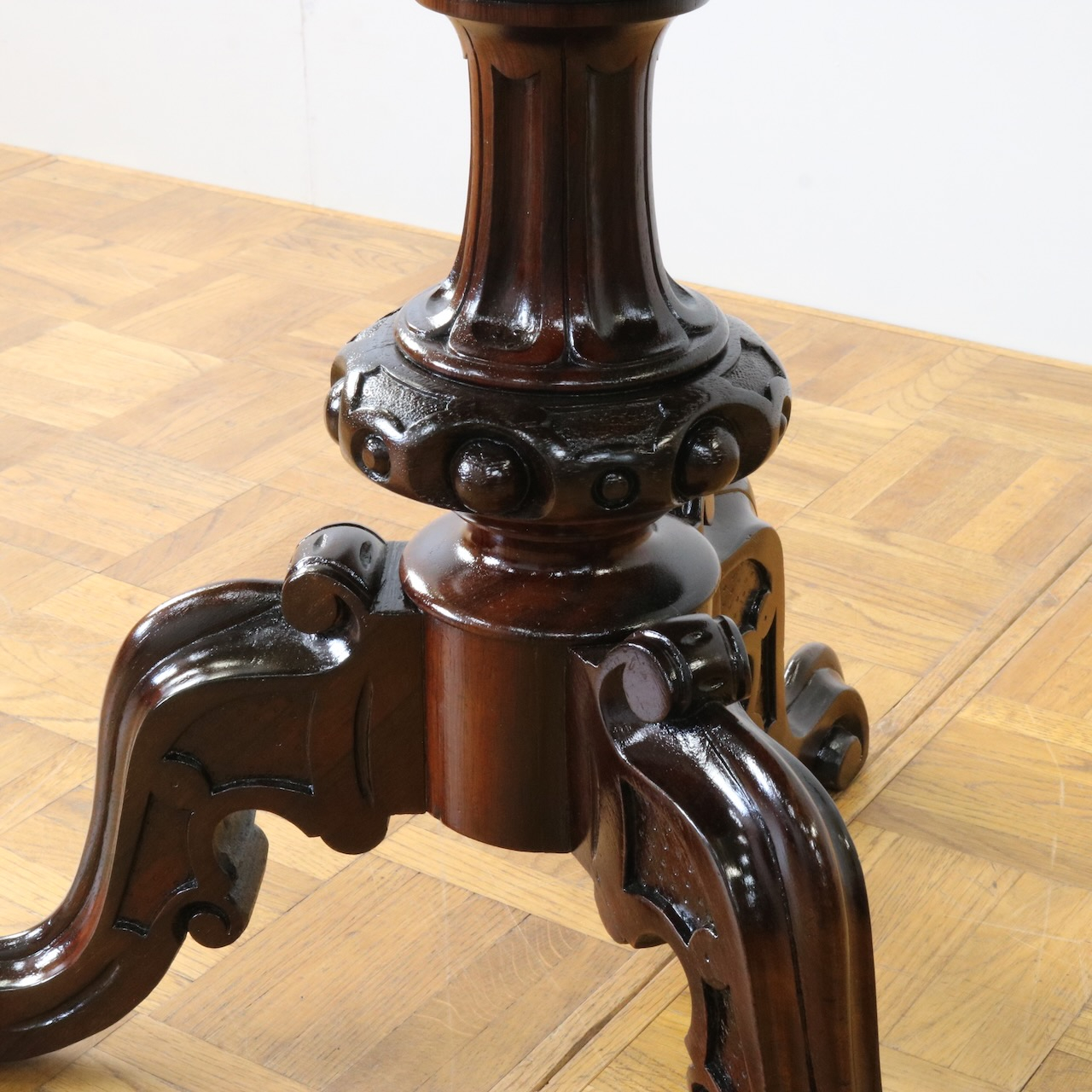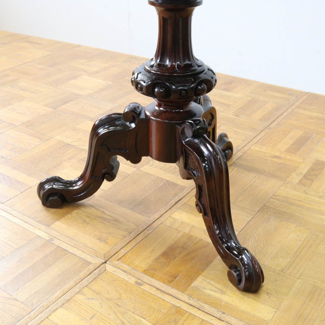 全体に美しく彫刻装飾が施されたトライポッドの脚部。ヴィクトリアン期らしい華やかさです。