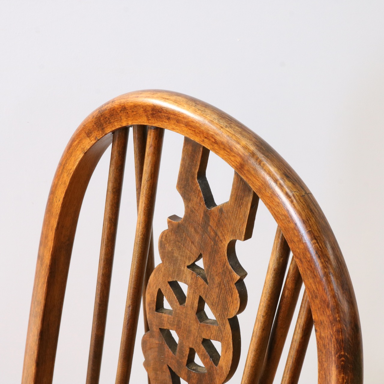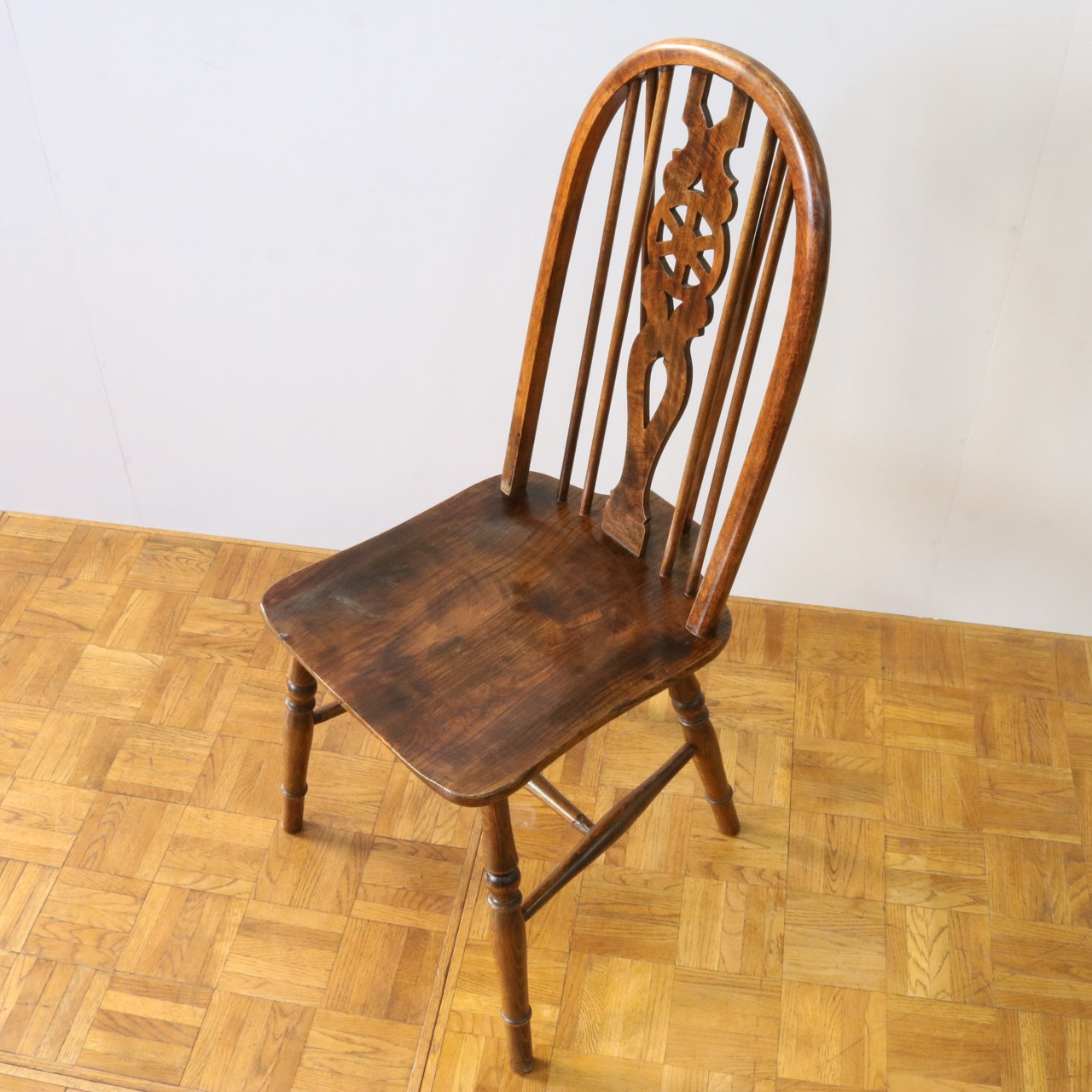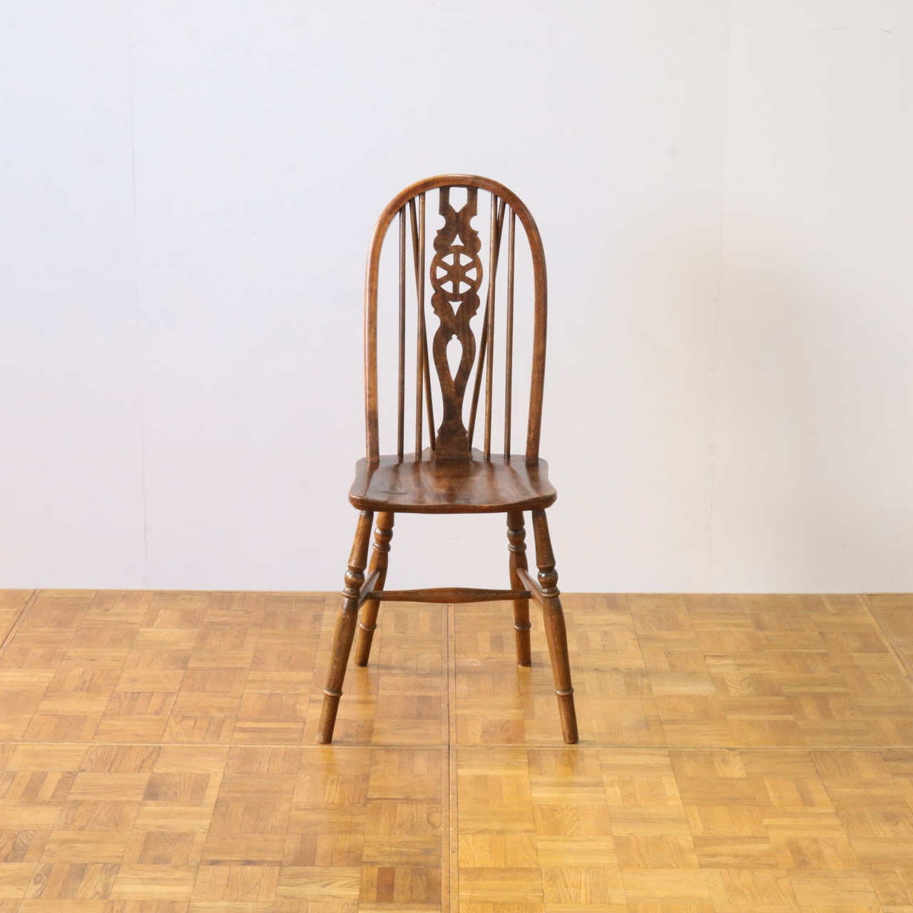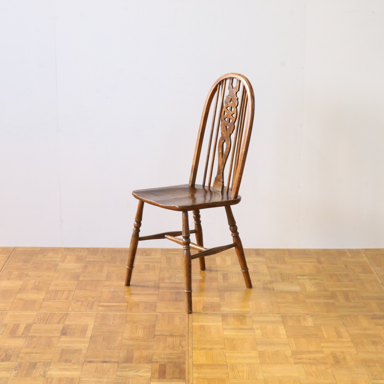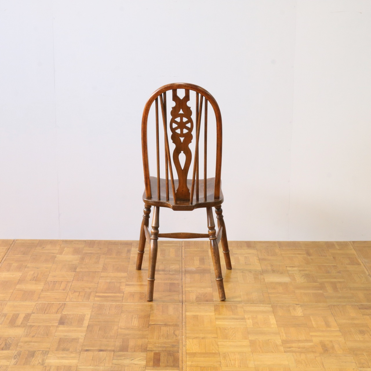 配送料の目安 ▶︎中央に車輪のようなモチーフが配されたビーチ材のスピンドルチェアー。