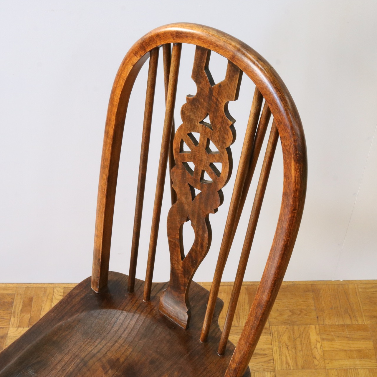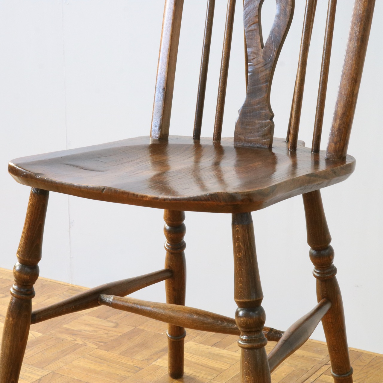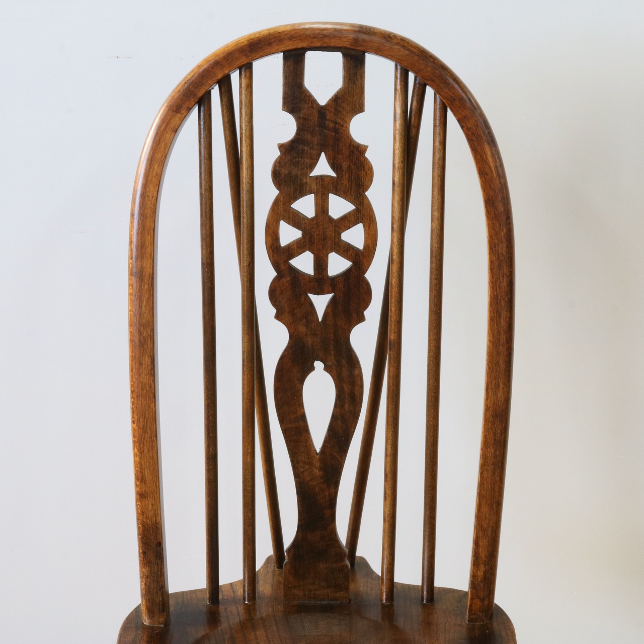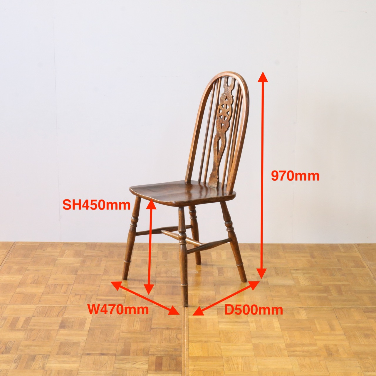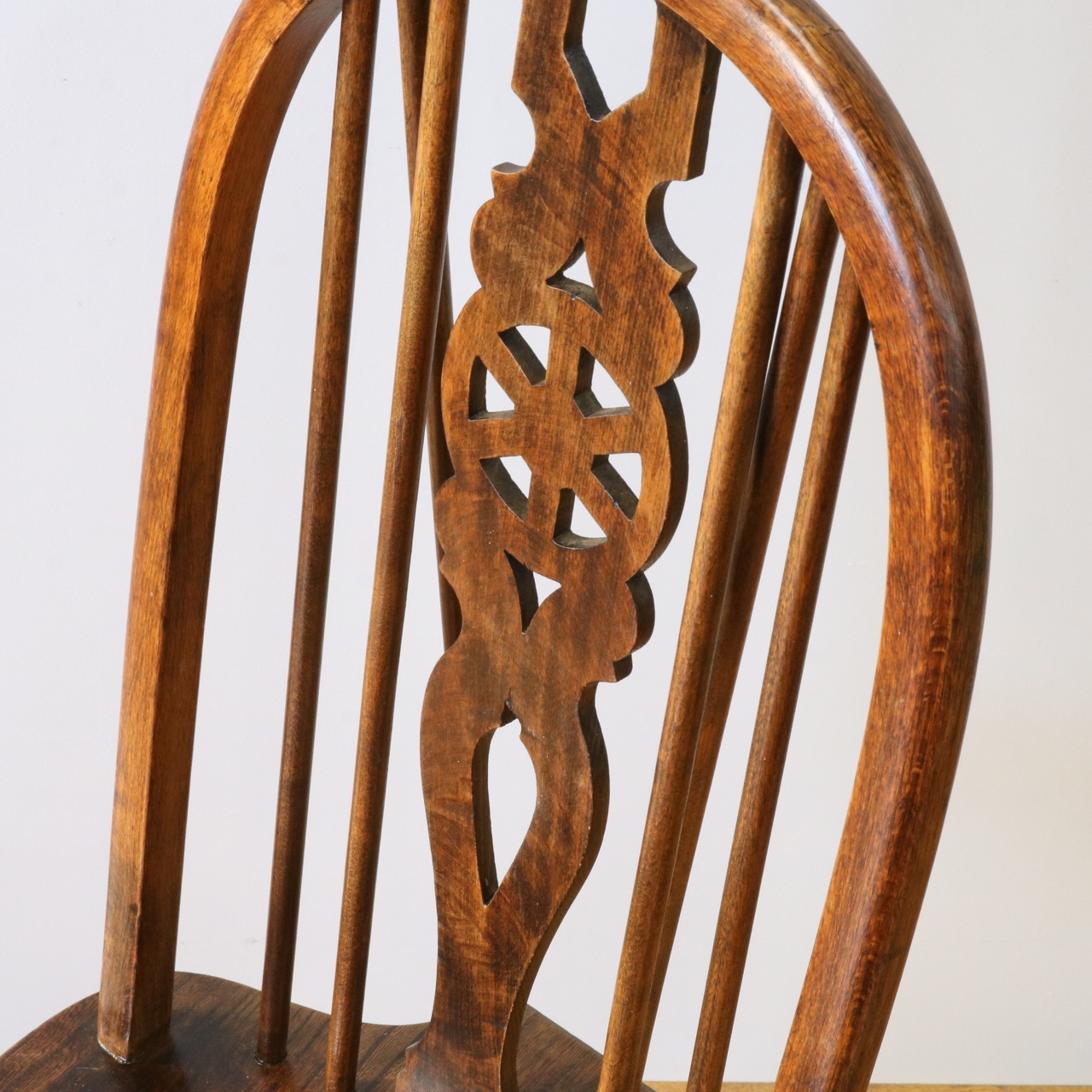 配送料の目安 ▶︎中央に車輪のようなモチーフが配されたビーチ材のスピンドルチェアー。