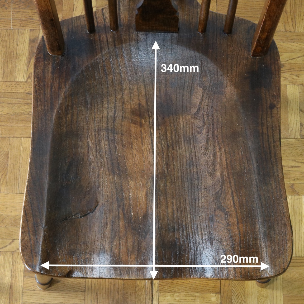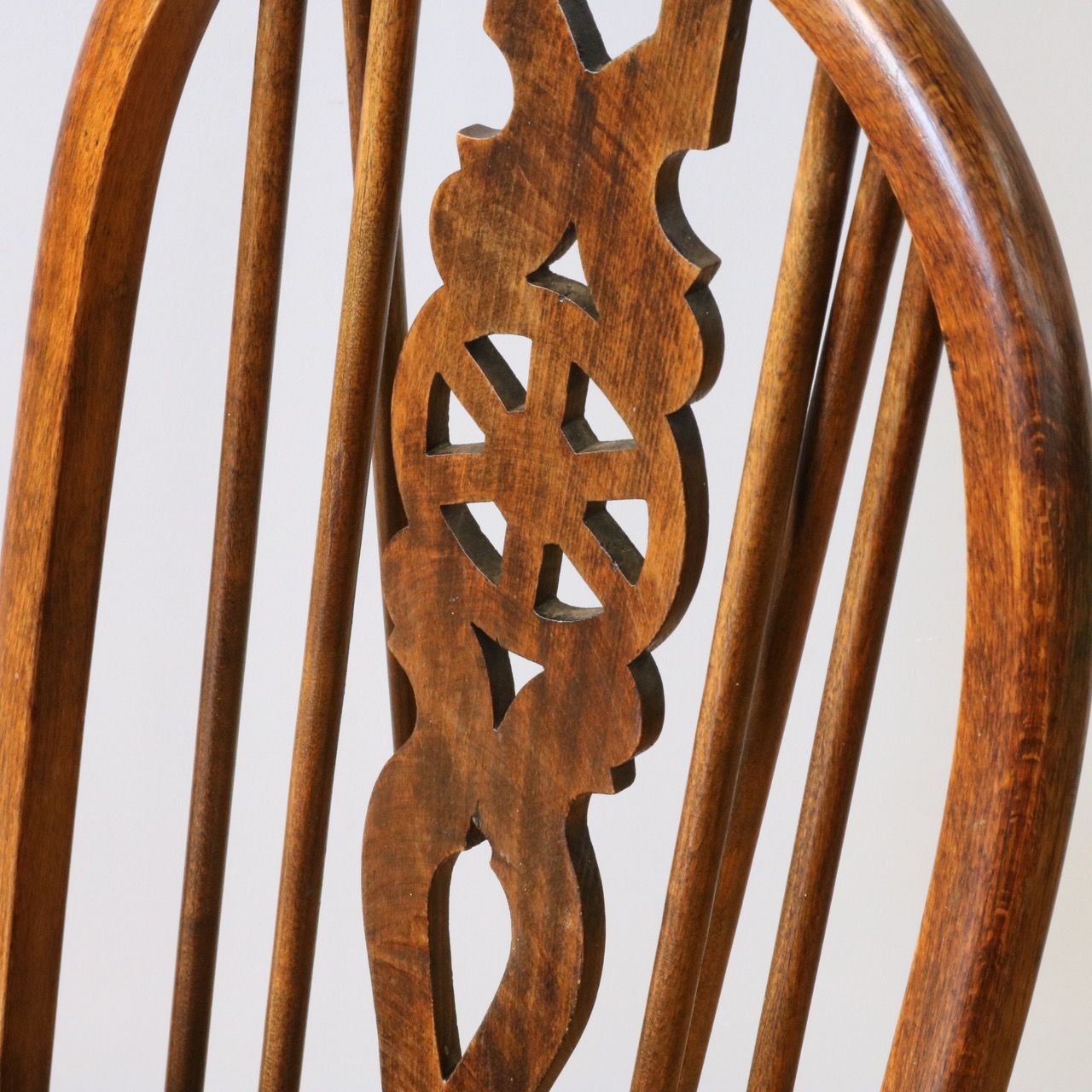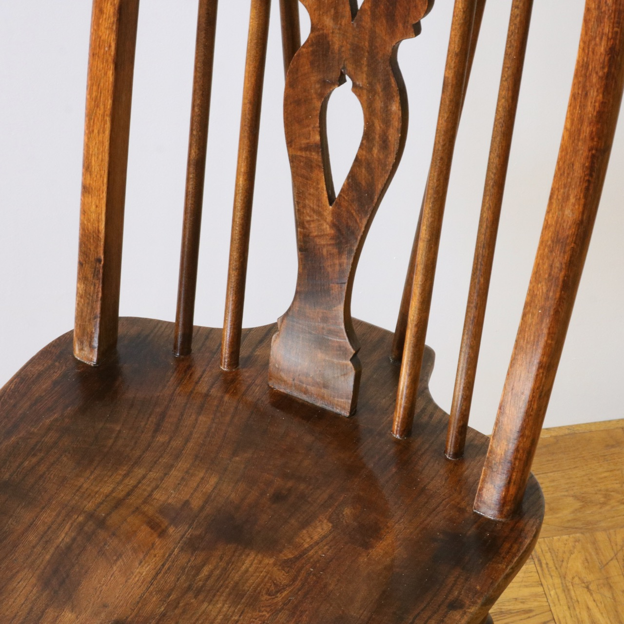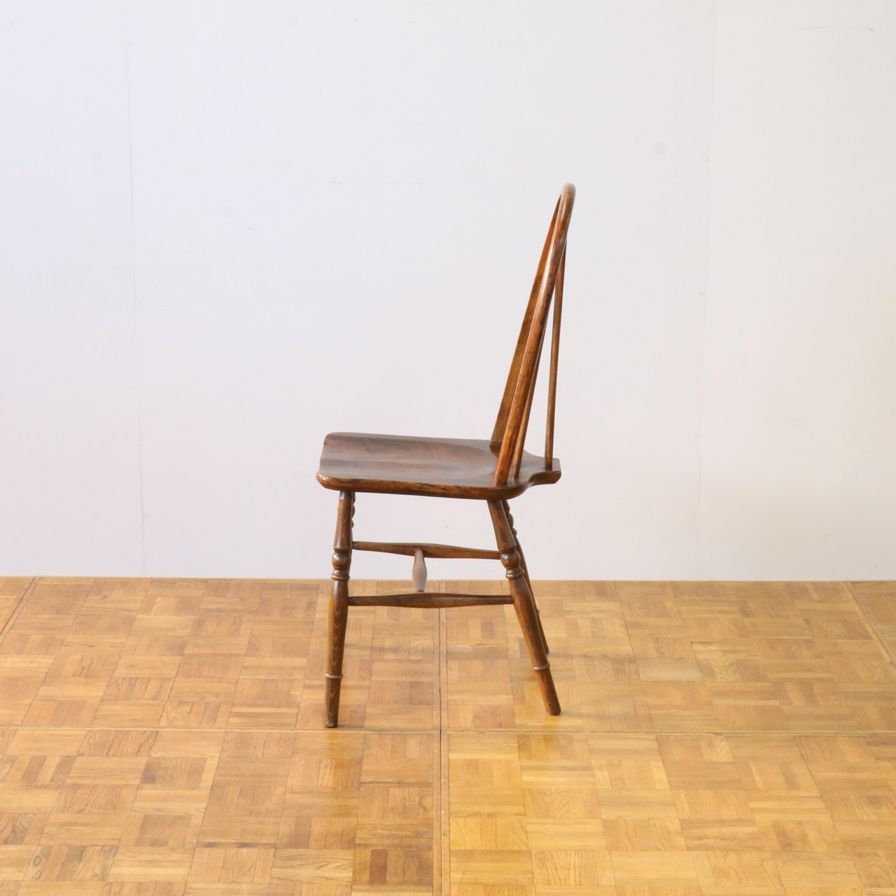 配送料の目安 ▶︎中央に車輪のようなモチーフが配されたビーチ材のスピンドルチェアー。