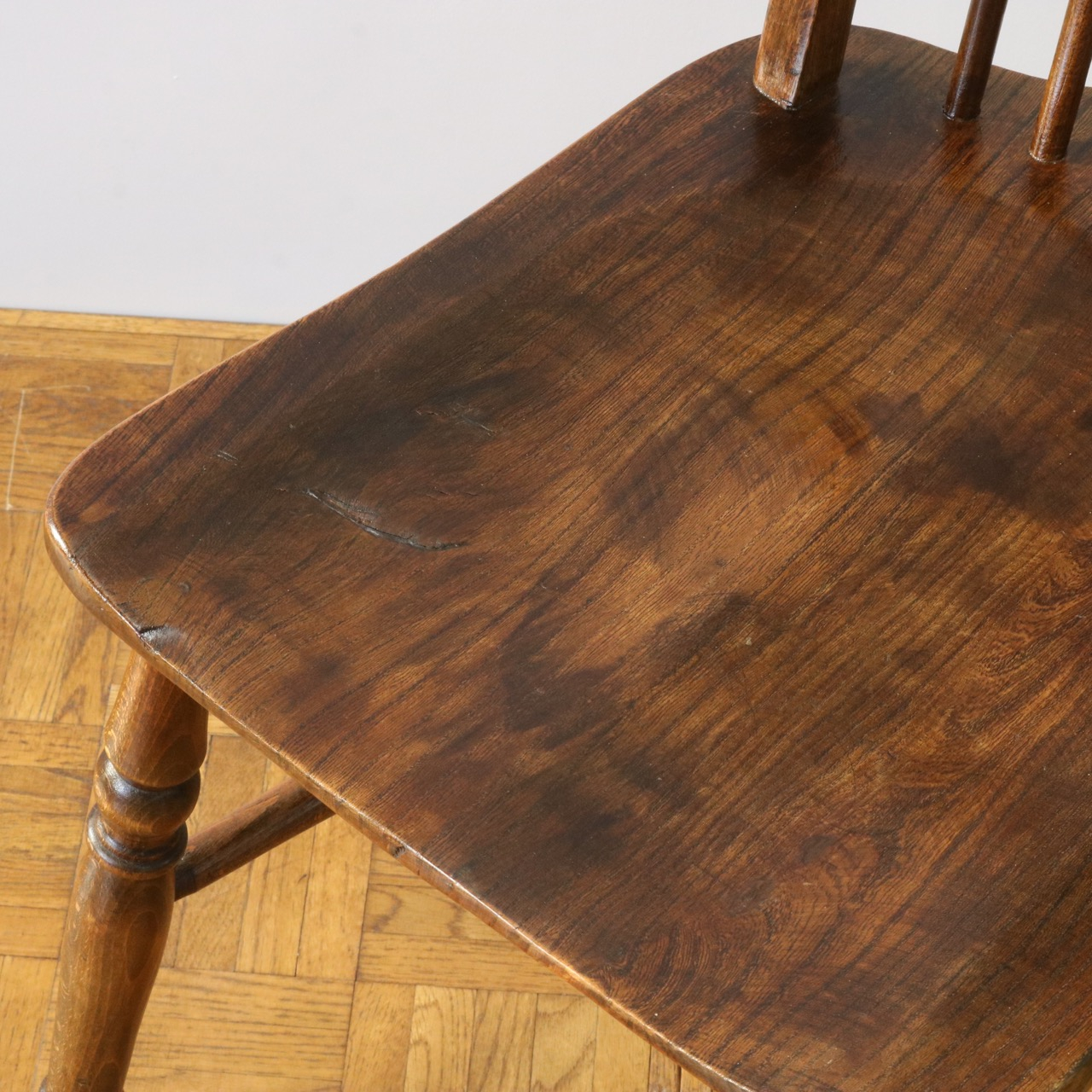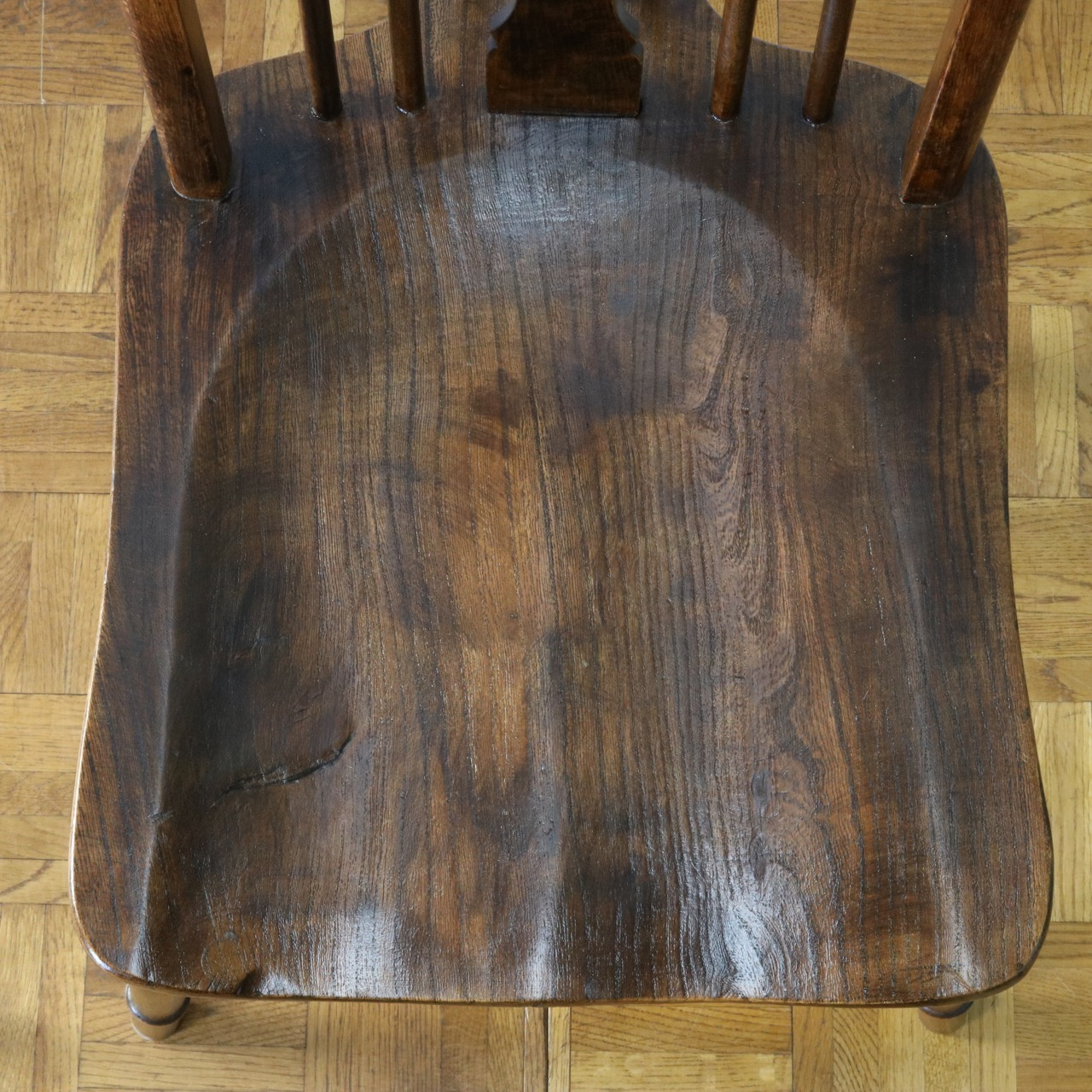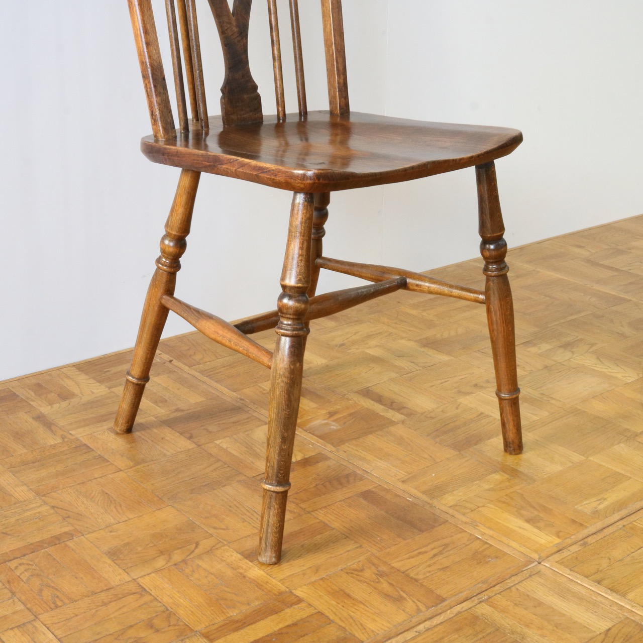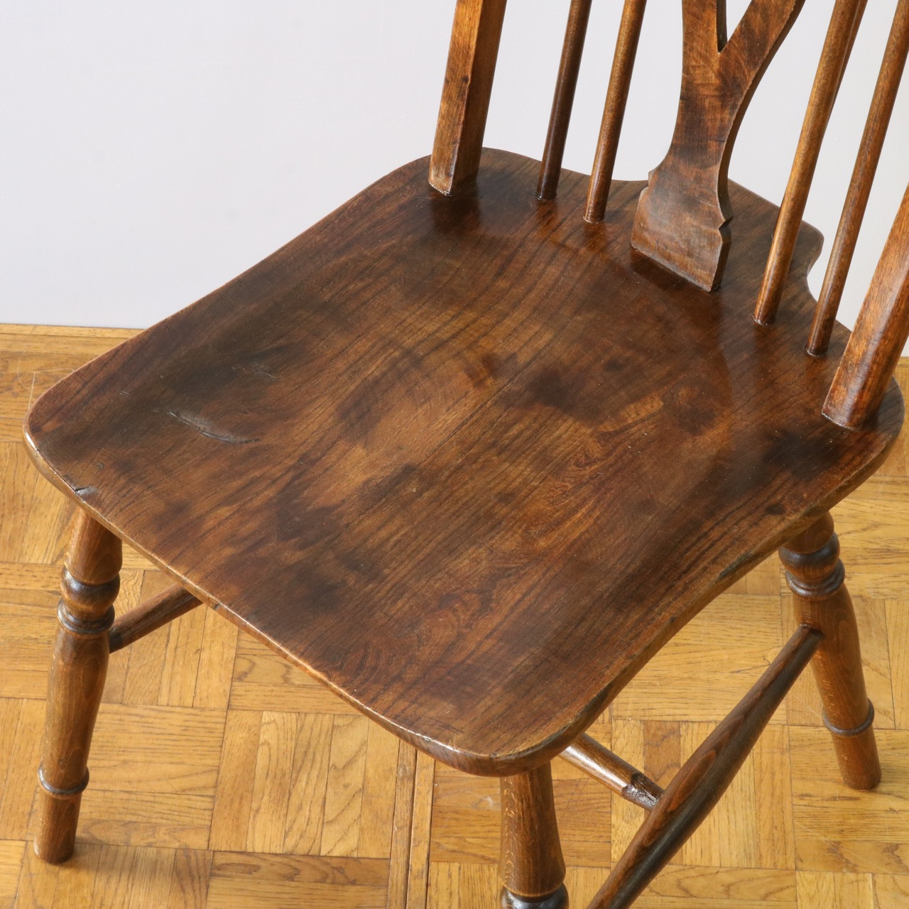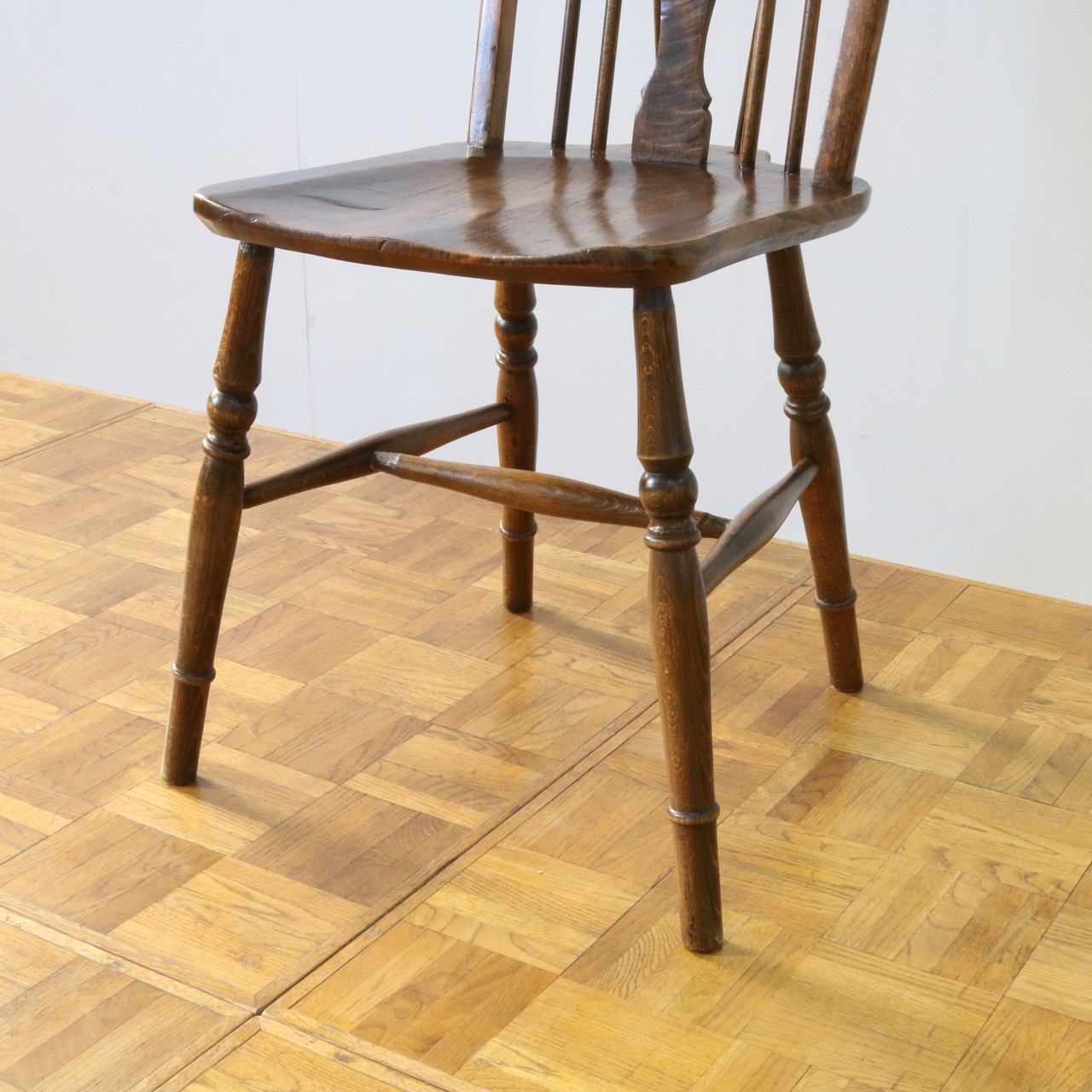 配送料の目安 ▶︎中央に車輪のようなモチーフが配されたビーチ材のスピンドルチェアー。