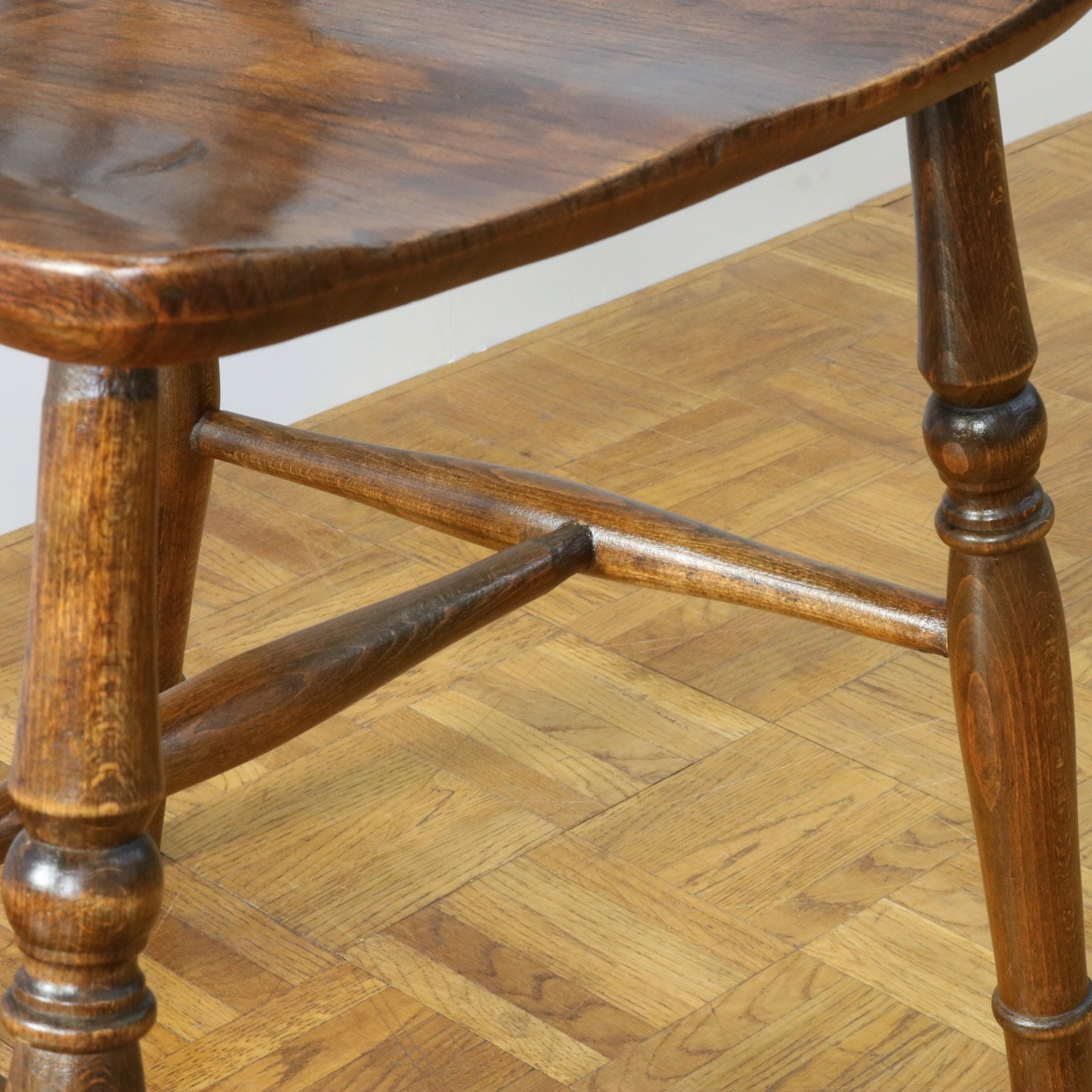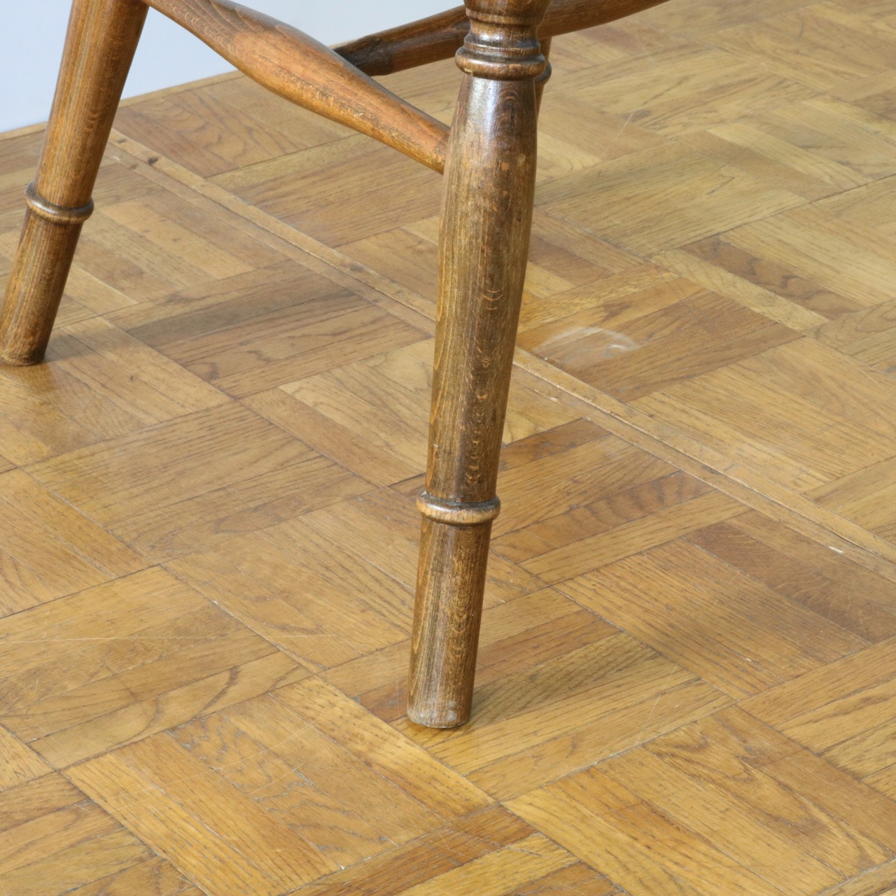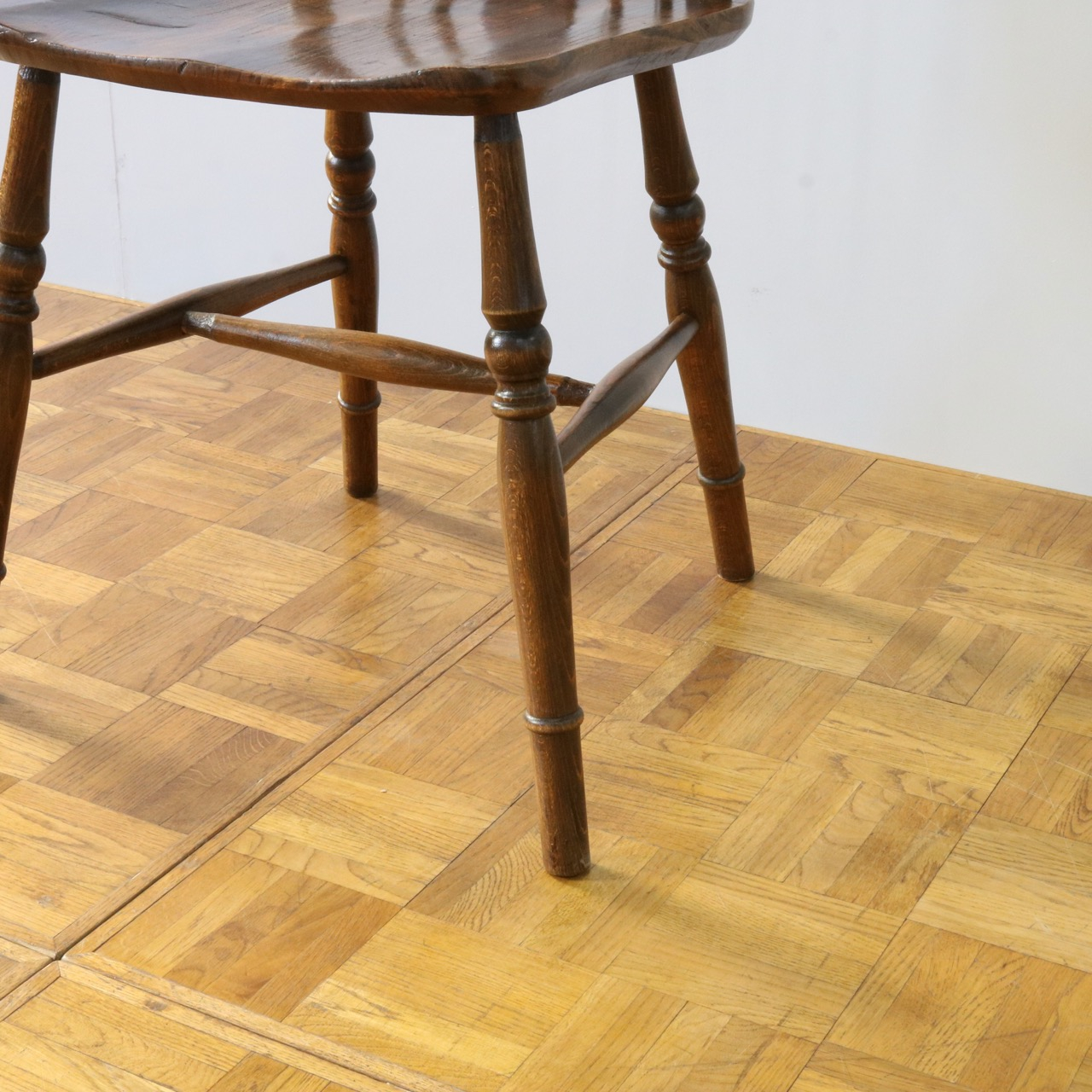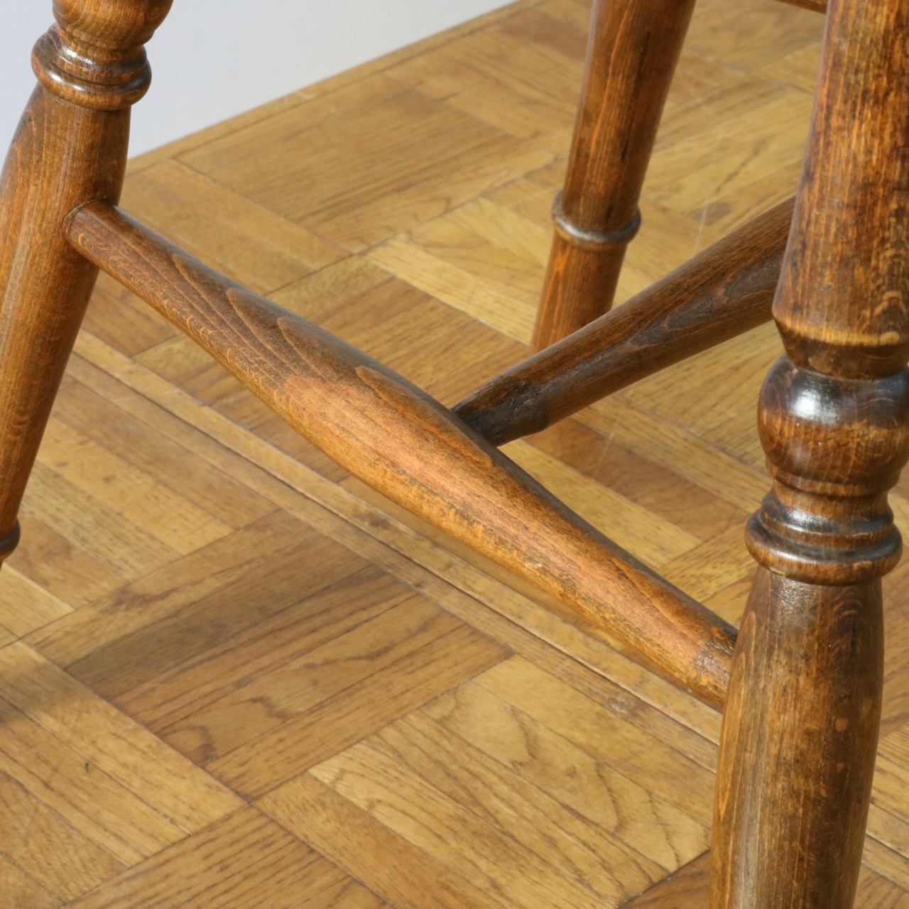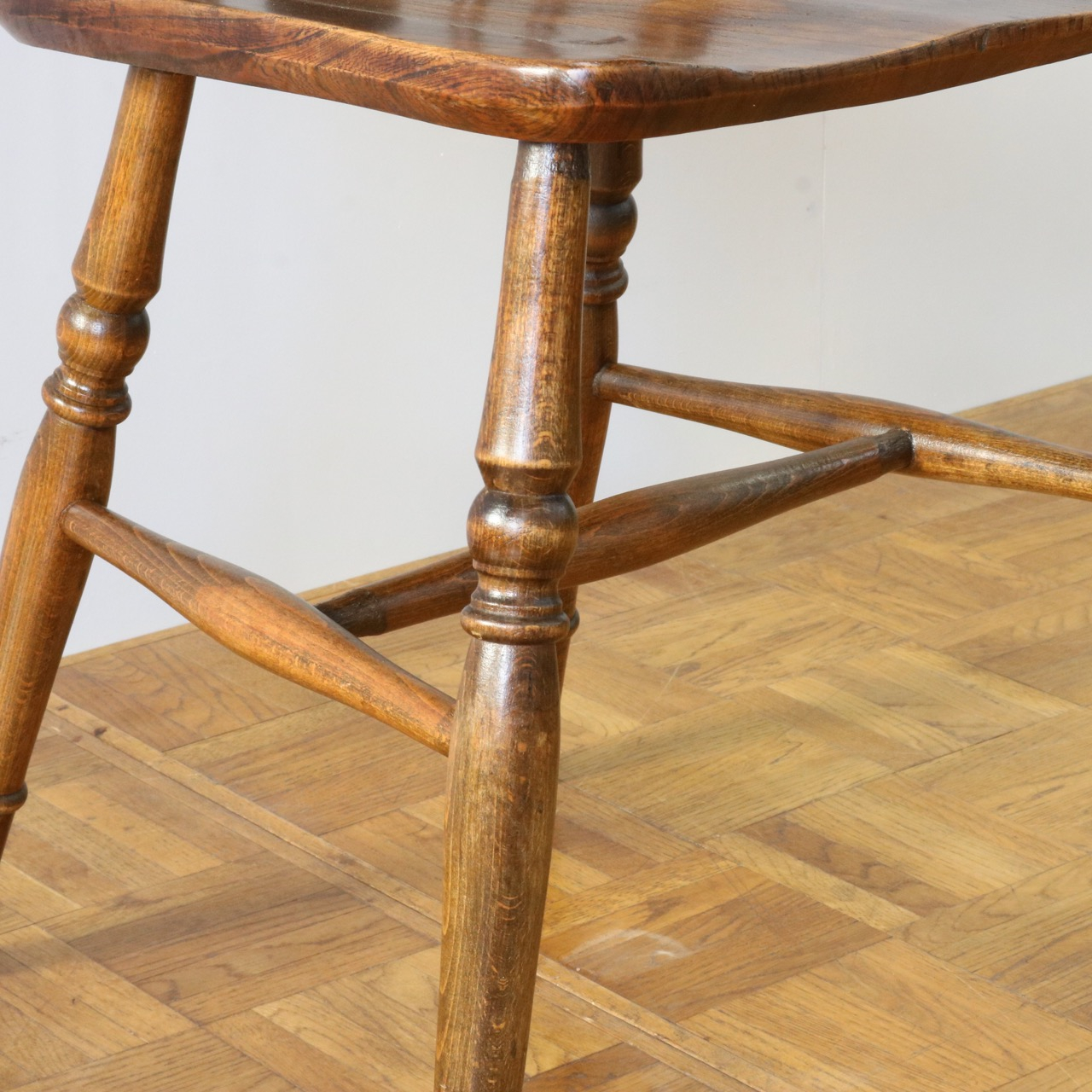 配送料の目安 ▶︎中央に車輪のようなモチーフが配されたビーチ材のスピンドルチェアー。
