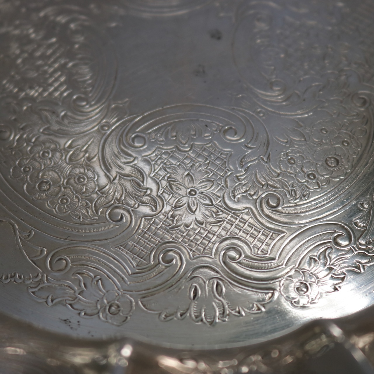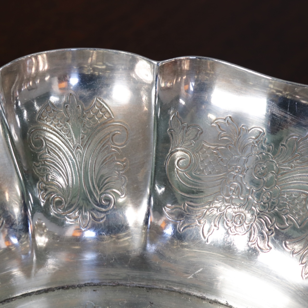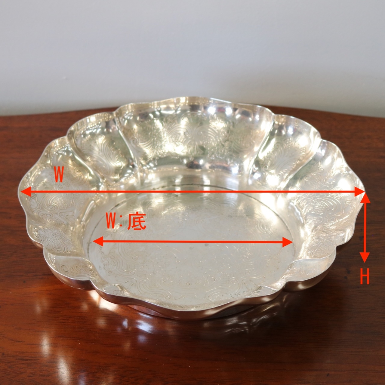 シルバープレートのボウル。フリルの縁と繊細な柄が優美なデザイン。ティータイムのお菓子を入れたり、深さがあるので小物を飾ったりしてお使いいただけます。