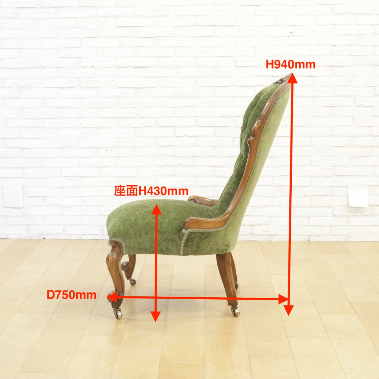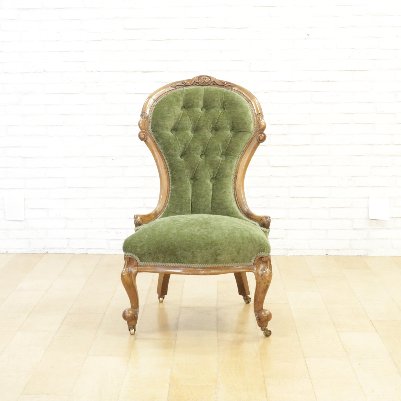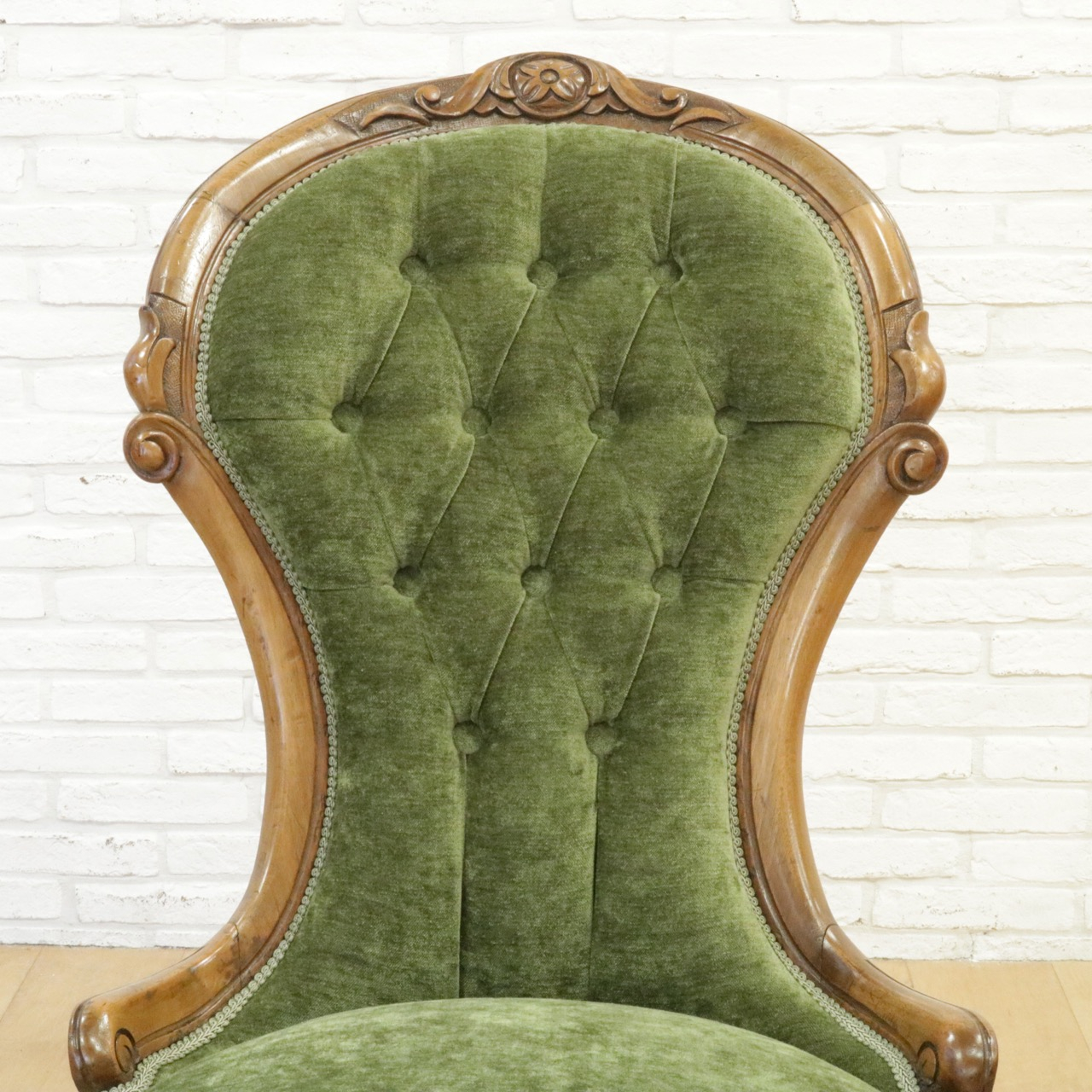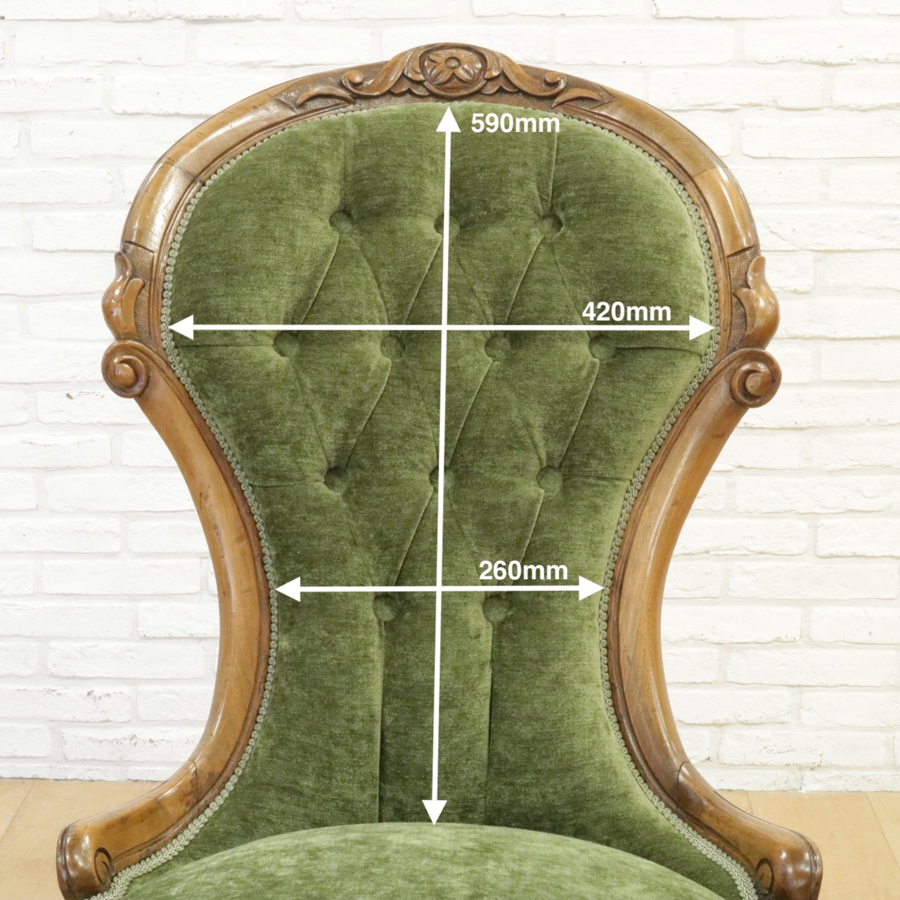 お花やスクロールなどヴィクトリアンらしい華やかな意匠が施された美しい佇まいのチェアーです。