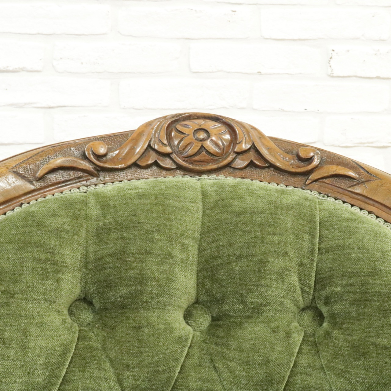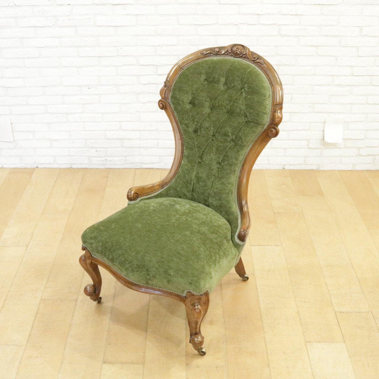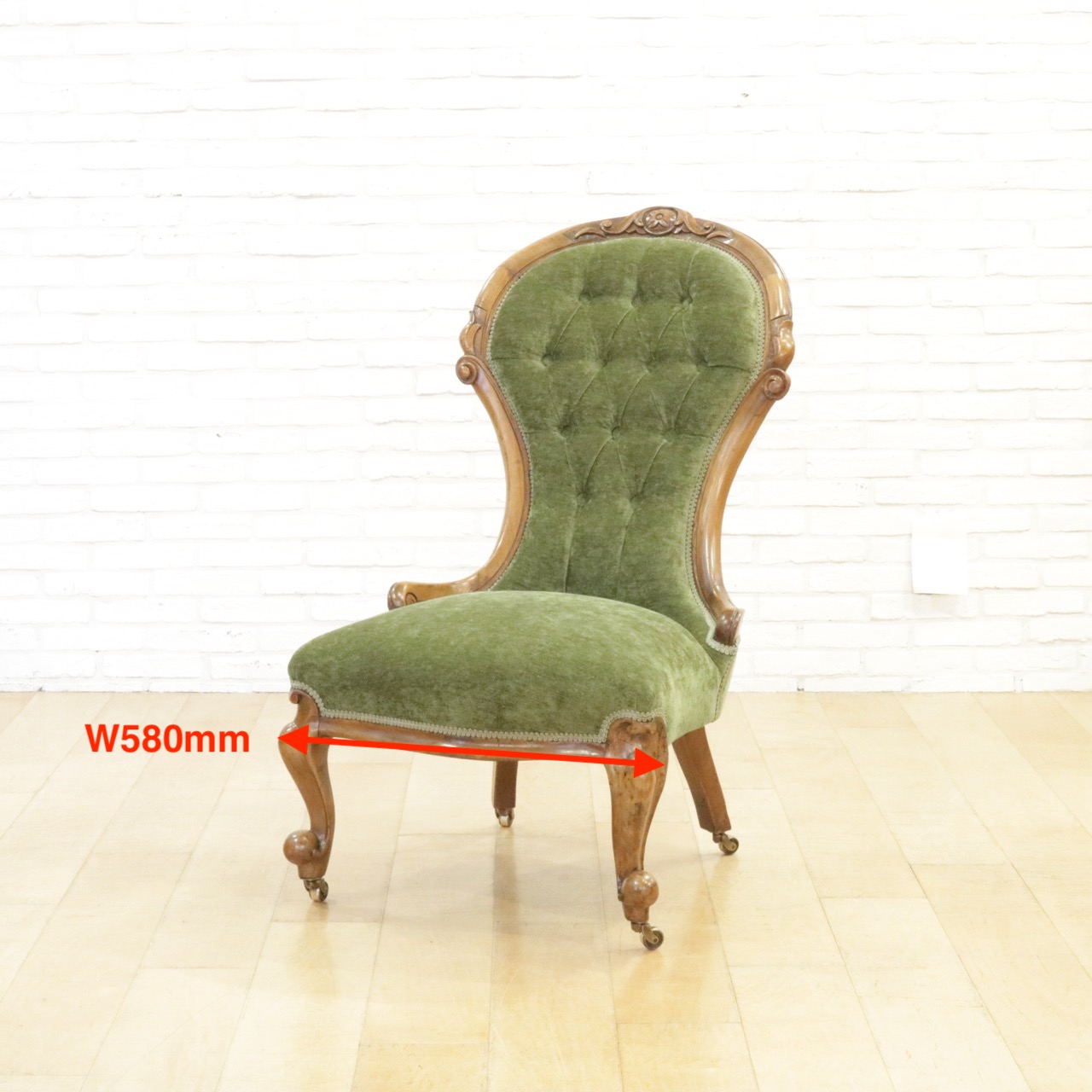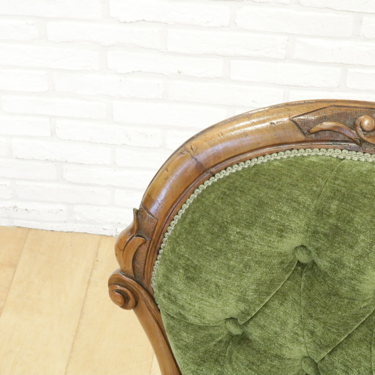 お花やスクロールなどヴィクトリアンらしい華やかな意匠が施された美しい佇まいのチェアーです。