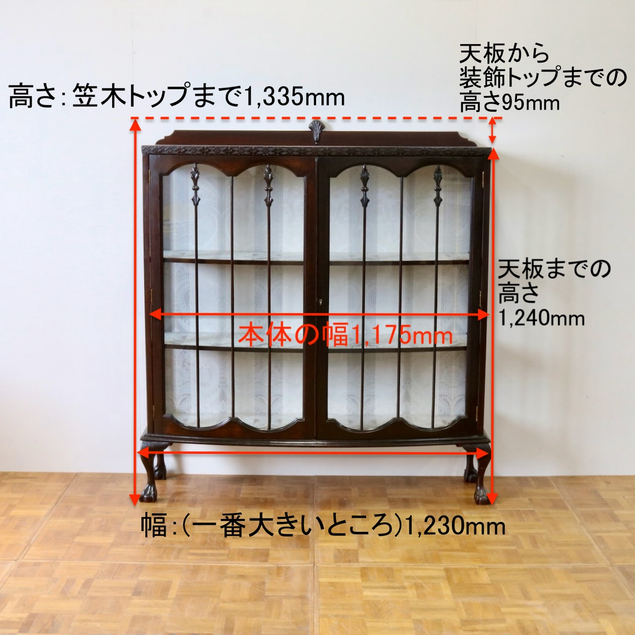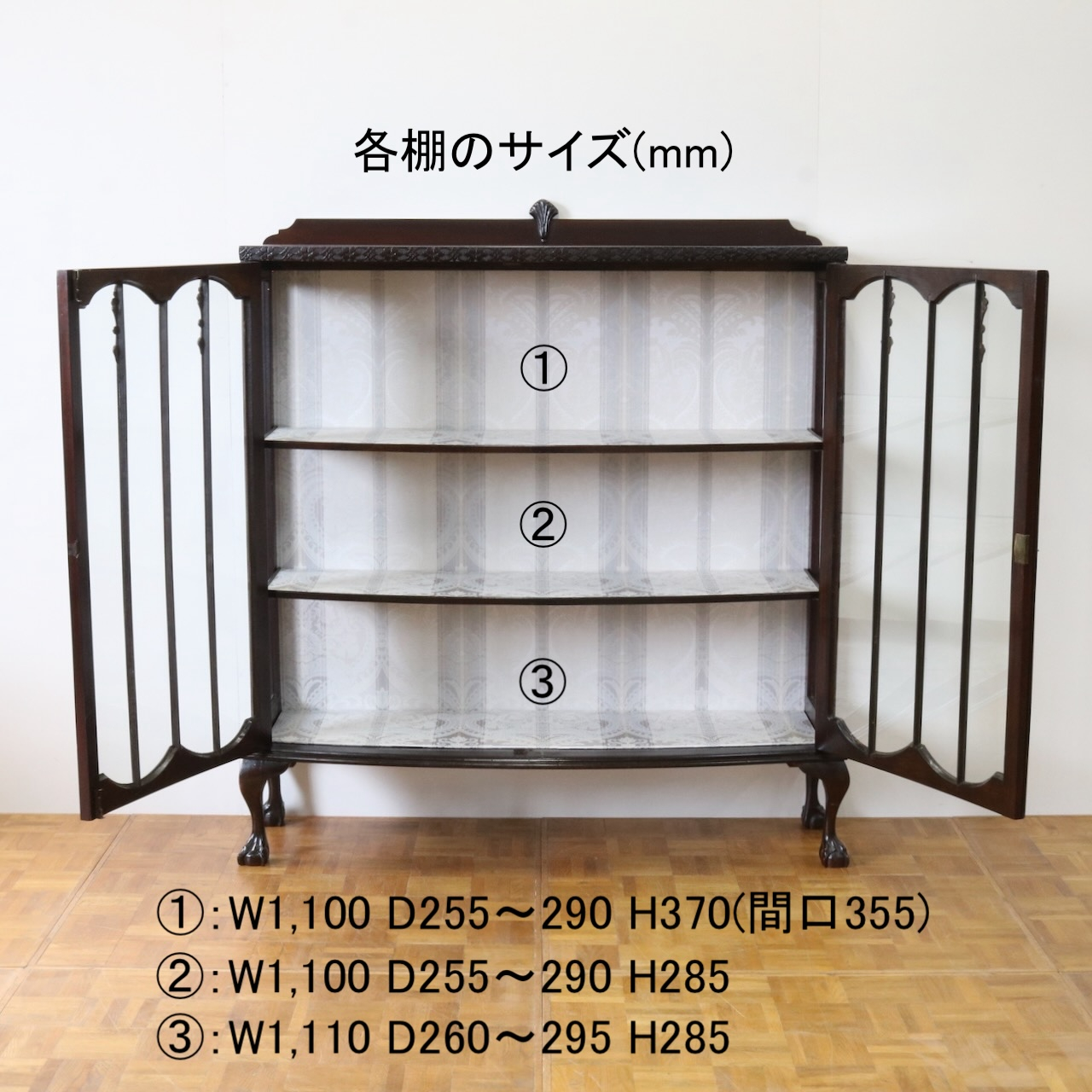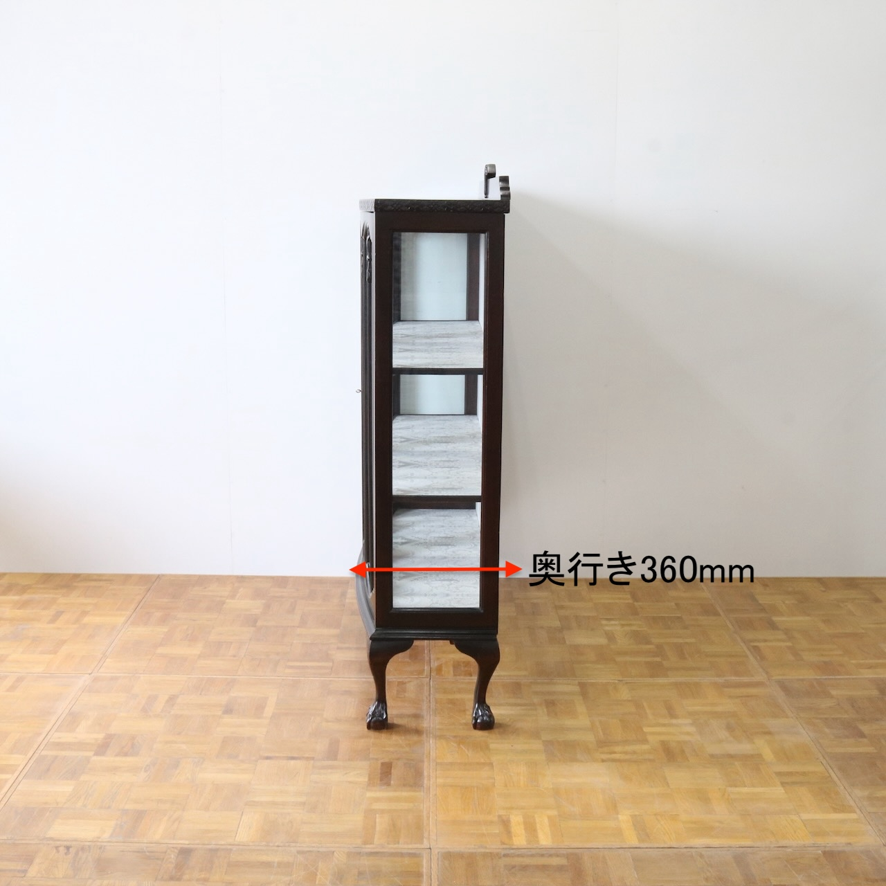 配送料の目安 ▶︎1930年代、マホガニーのグラスキャビネット 。植物を模した幾何学模様やボールアンドクロウの脚元などクラシックで華やかなデザインがリビングを彩ります。