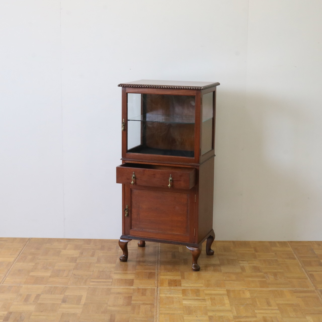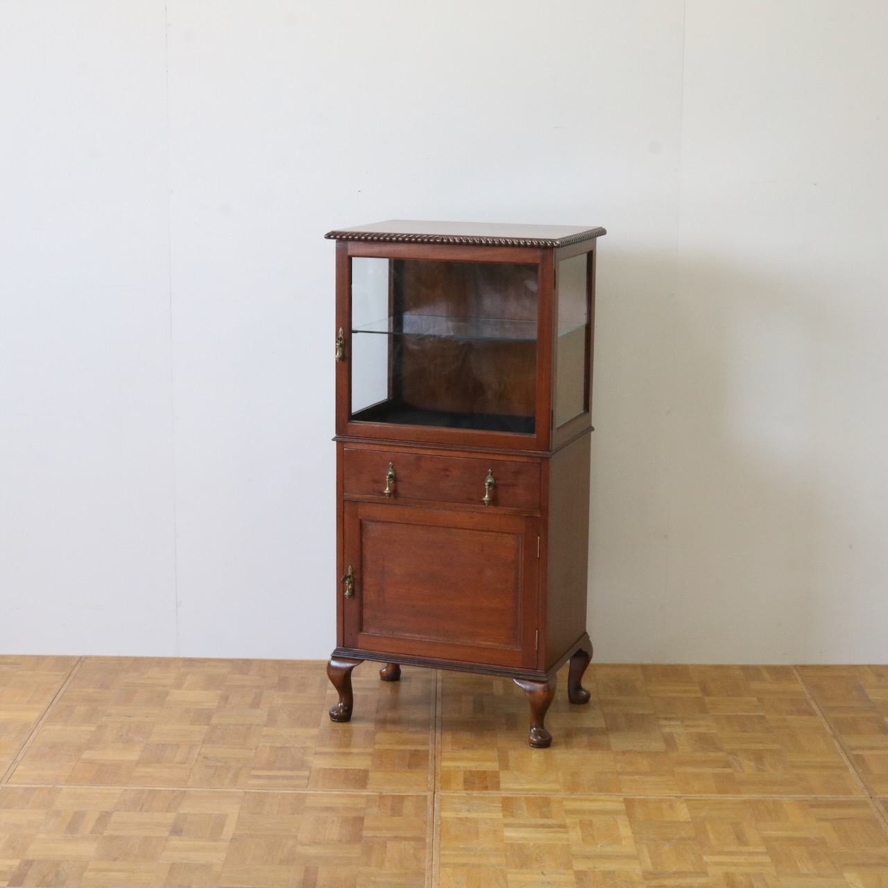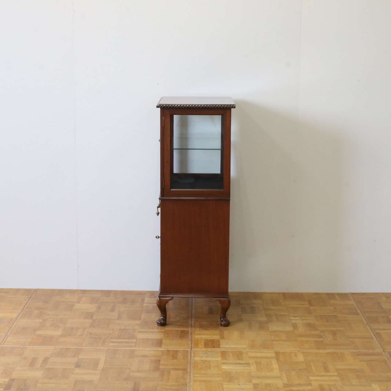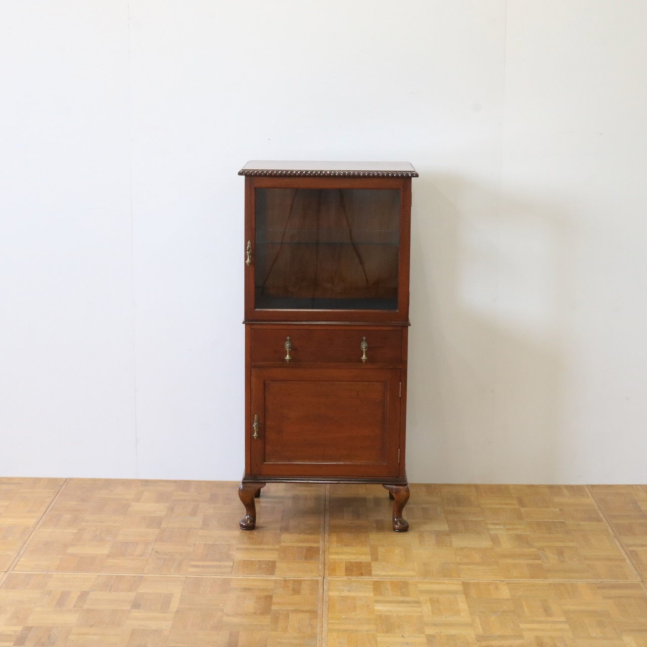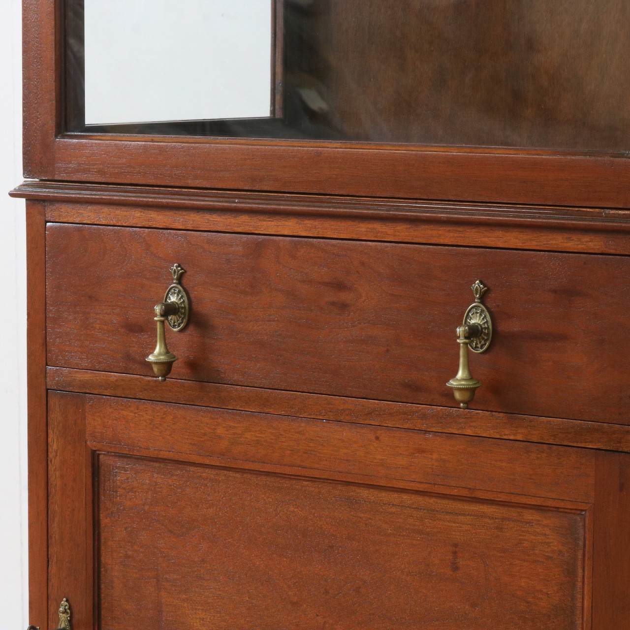 天板の縁や引き手金具など、随所にアンティークらしい意匠が伺えるキャビネットです。