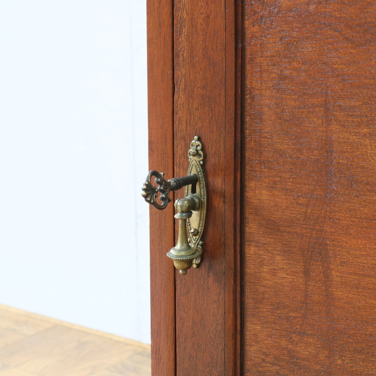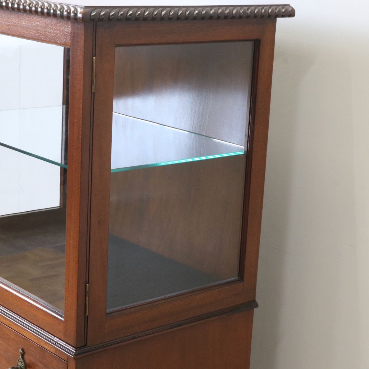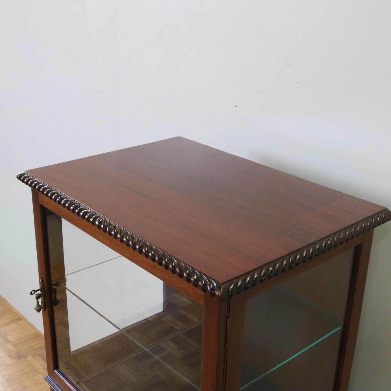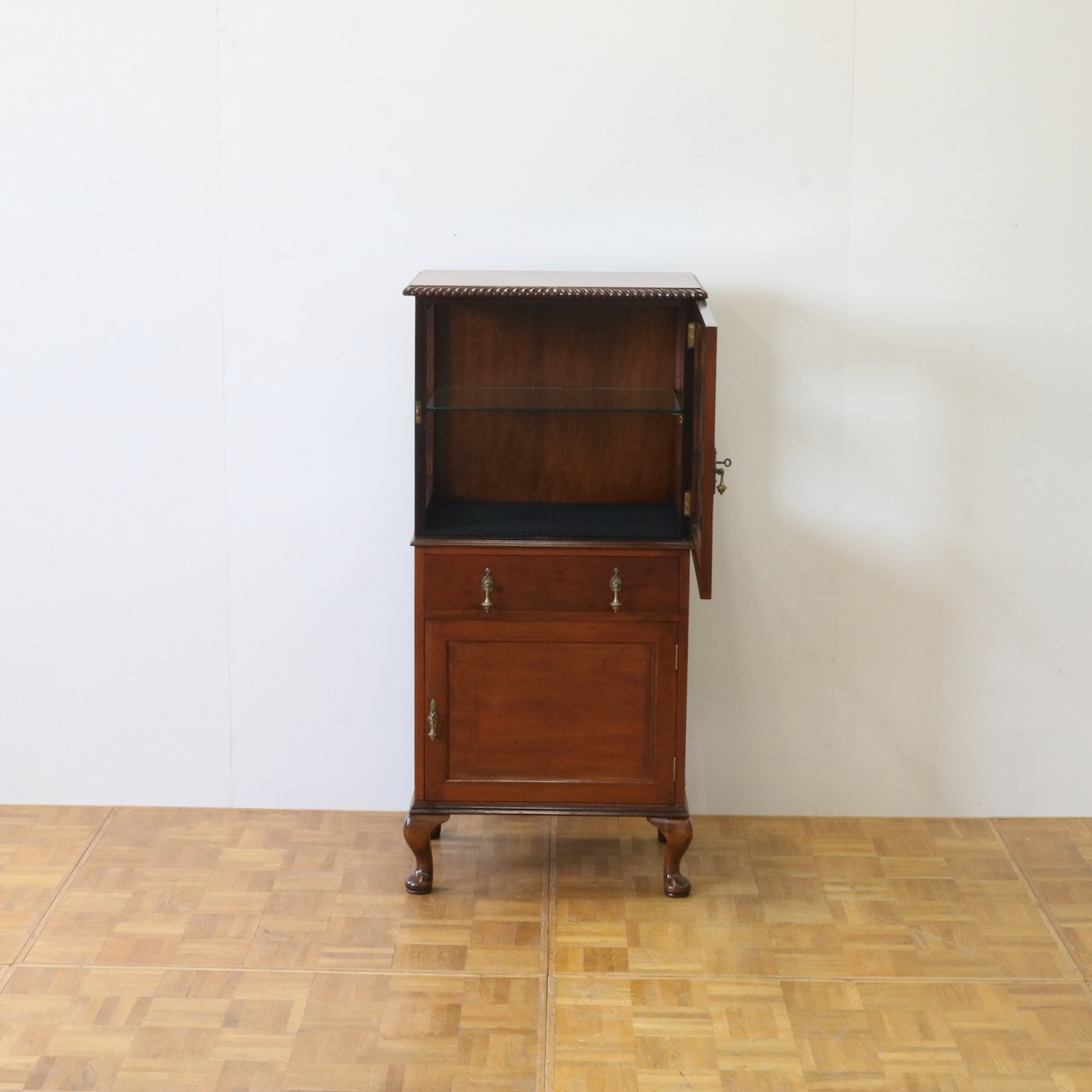 天板の縁や引き手金具など、随所にアンティークらしい意匠が伺えるキャビネットです。