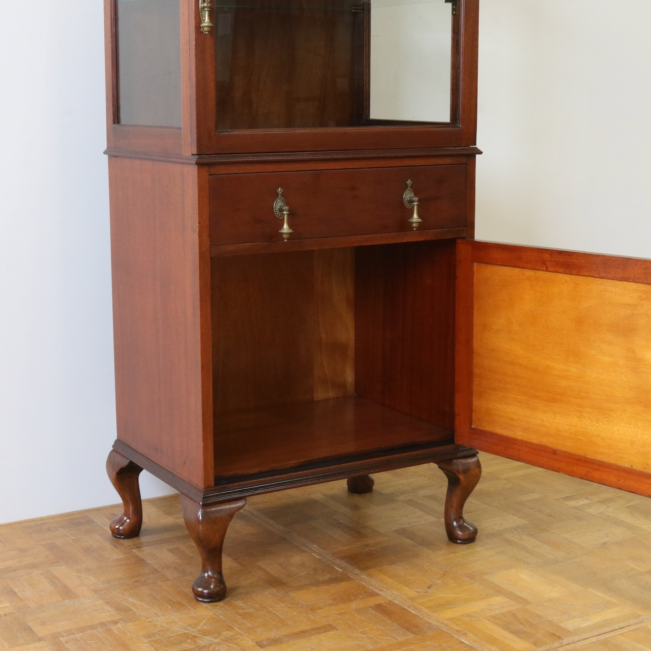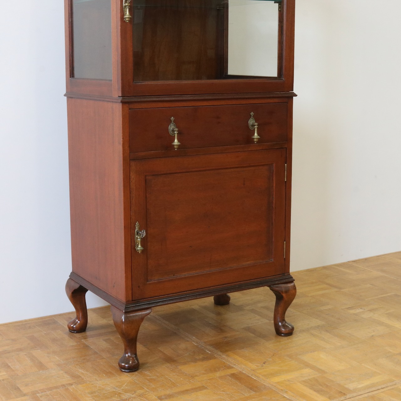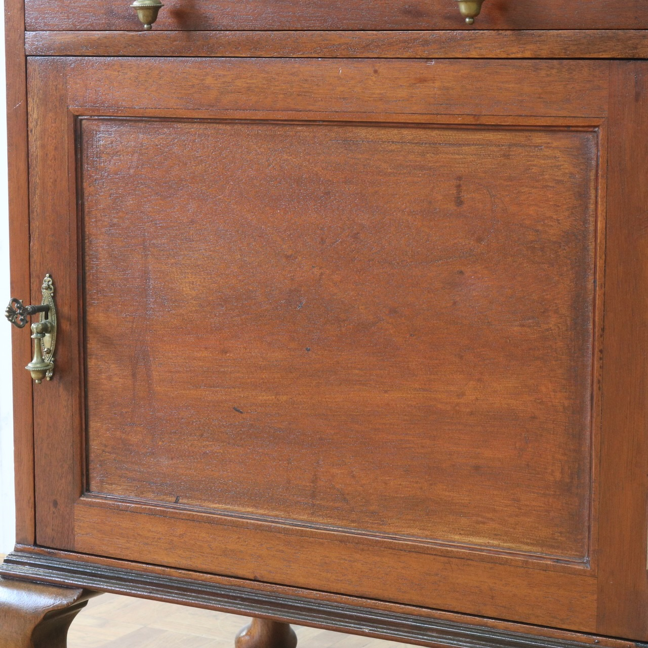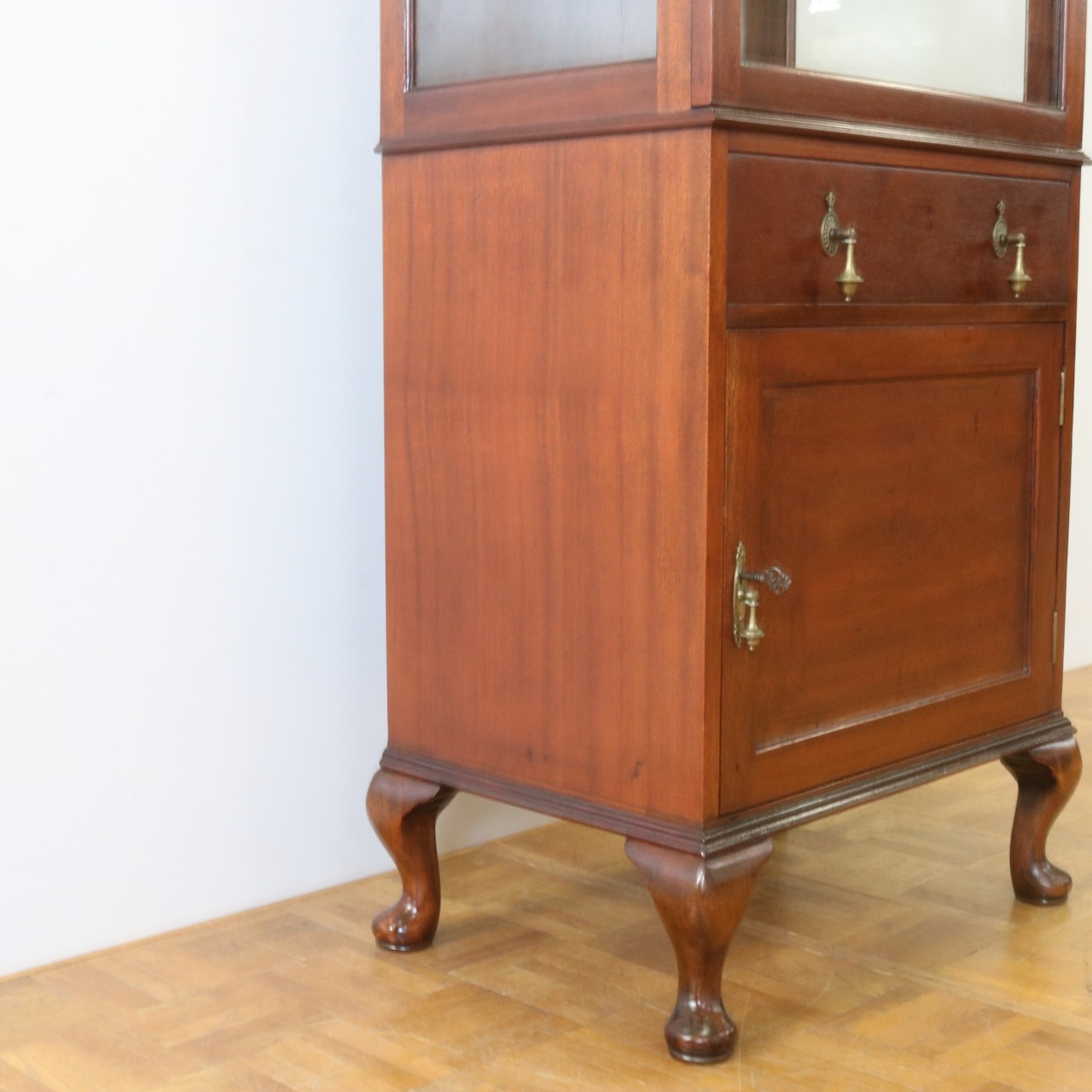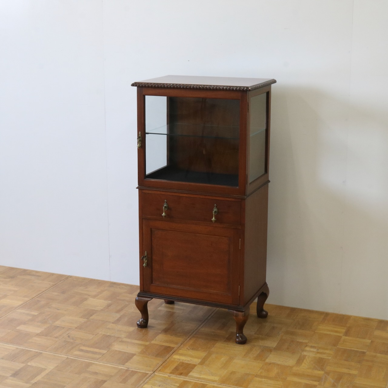 天板の縁や引き手金具など、随所にアンティークらしい意匠が伺えるキャビネットです。