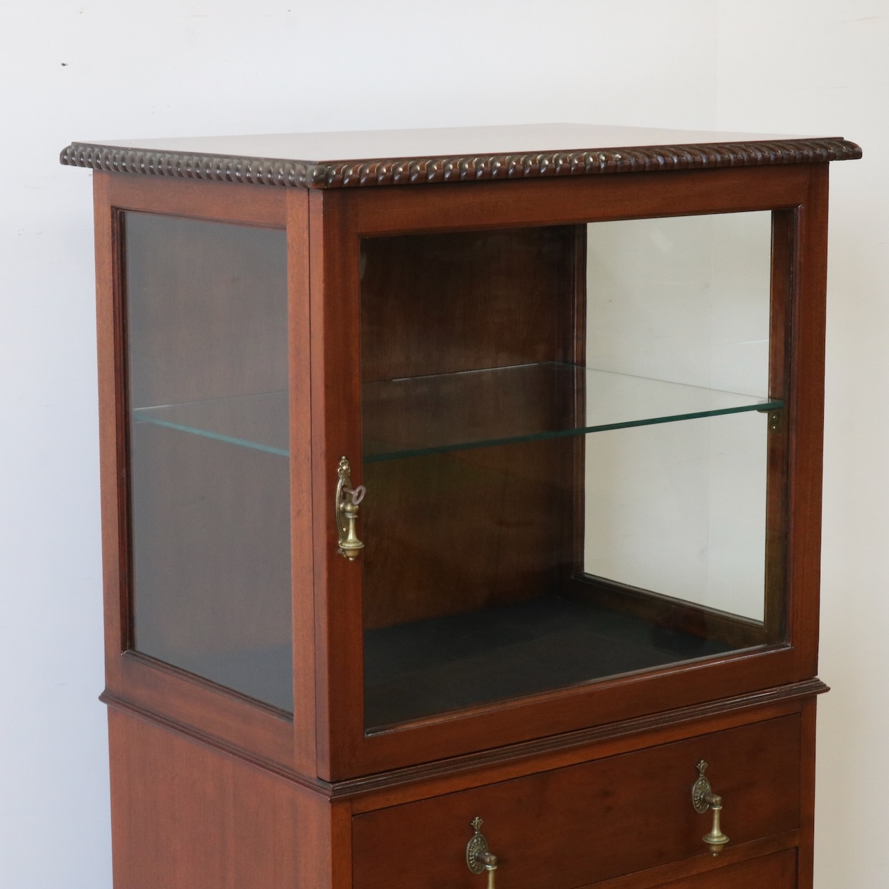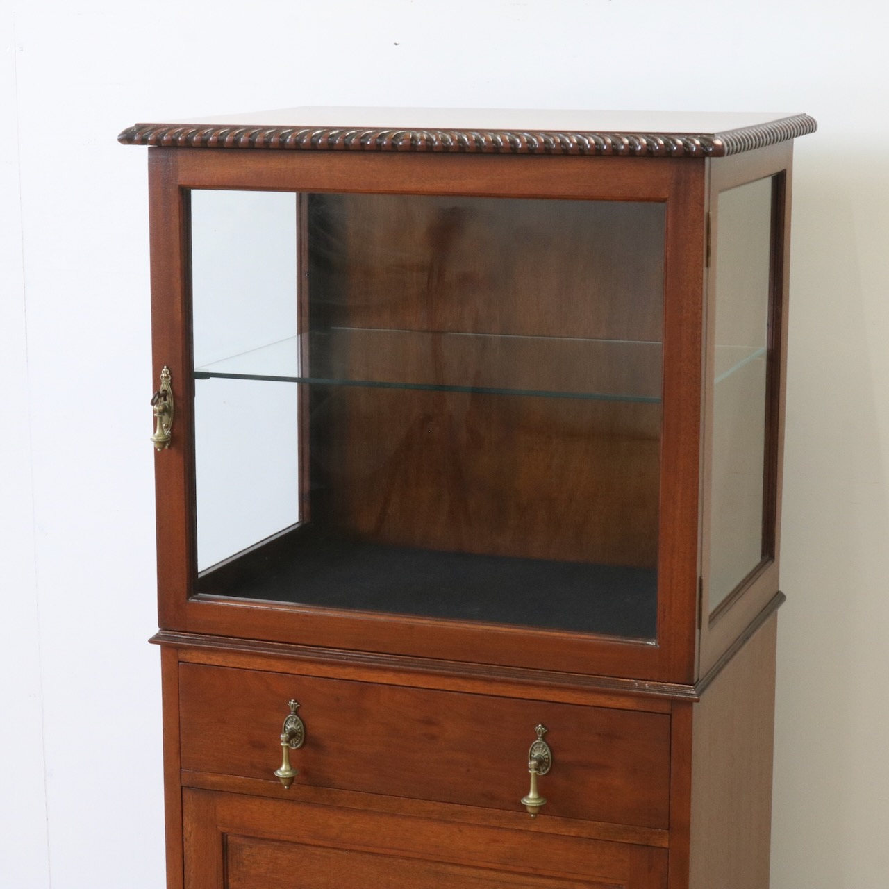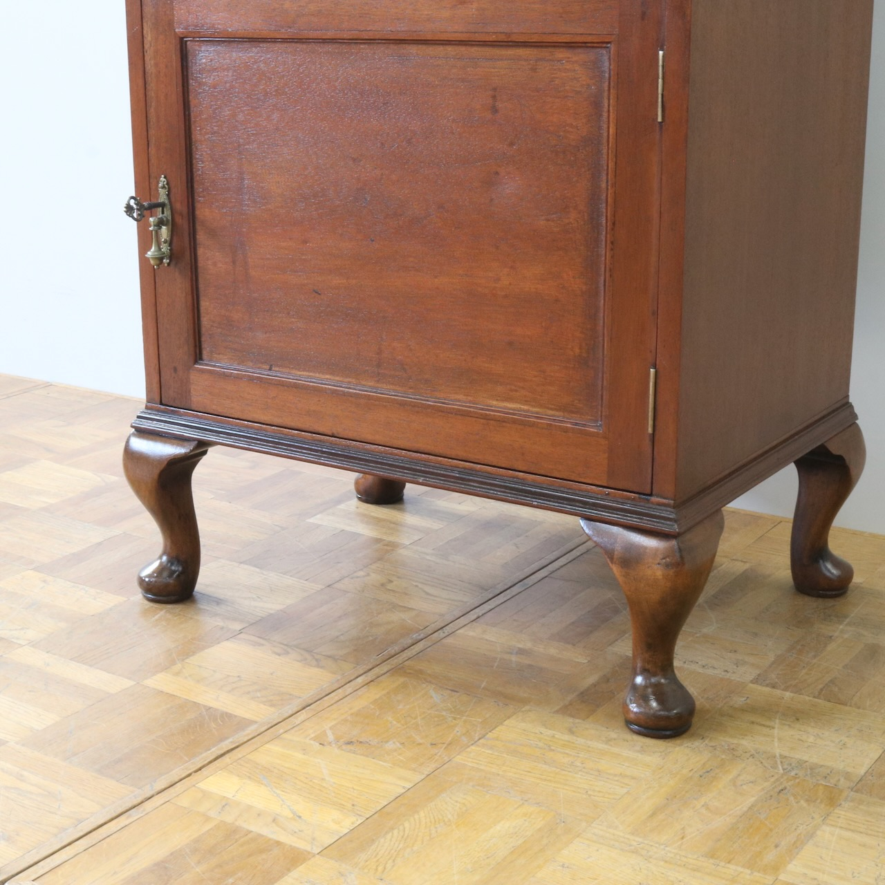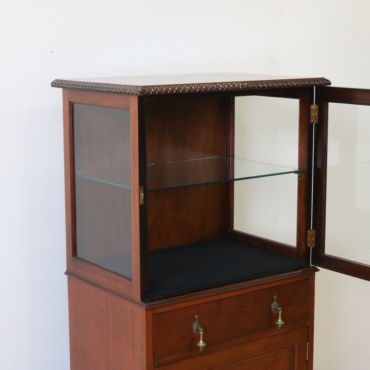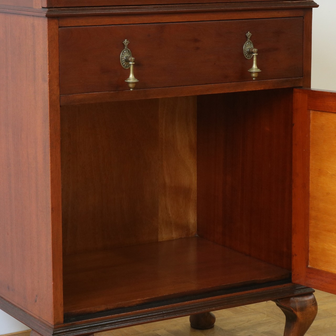 天板の縁や引き手金具など、随所にアンティークらしい意匠が伺えるキャビネットです。