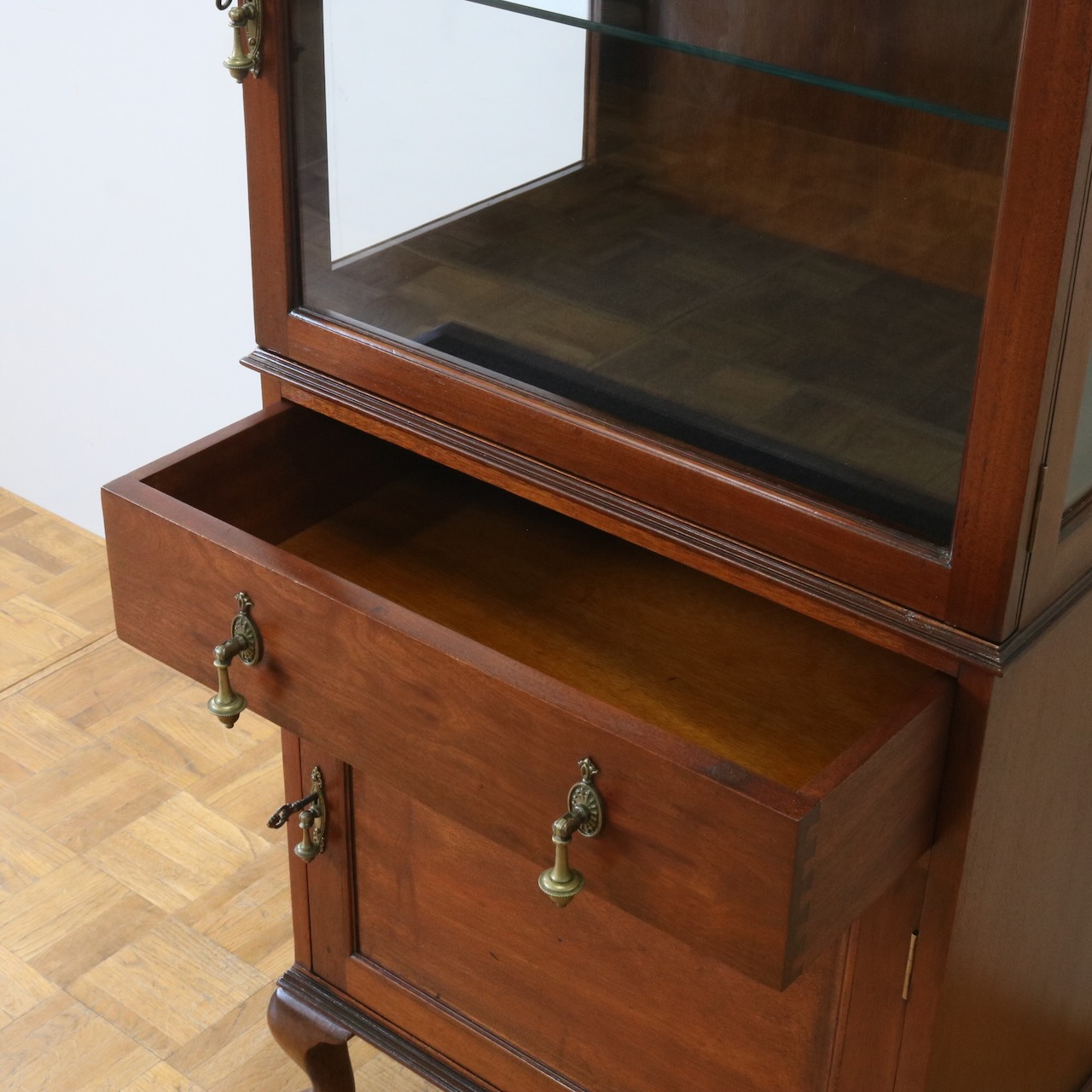 下段には引き出しが一杯と開戸の収納が一つ。ガラス扉のとも共通の引き手金具が