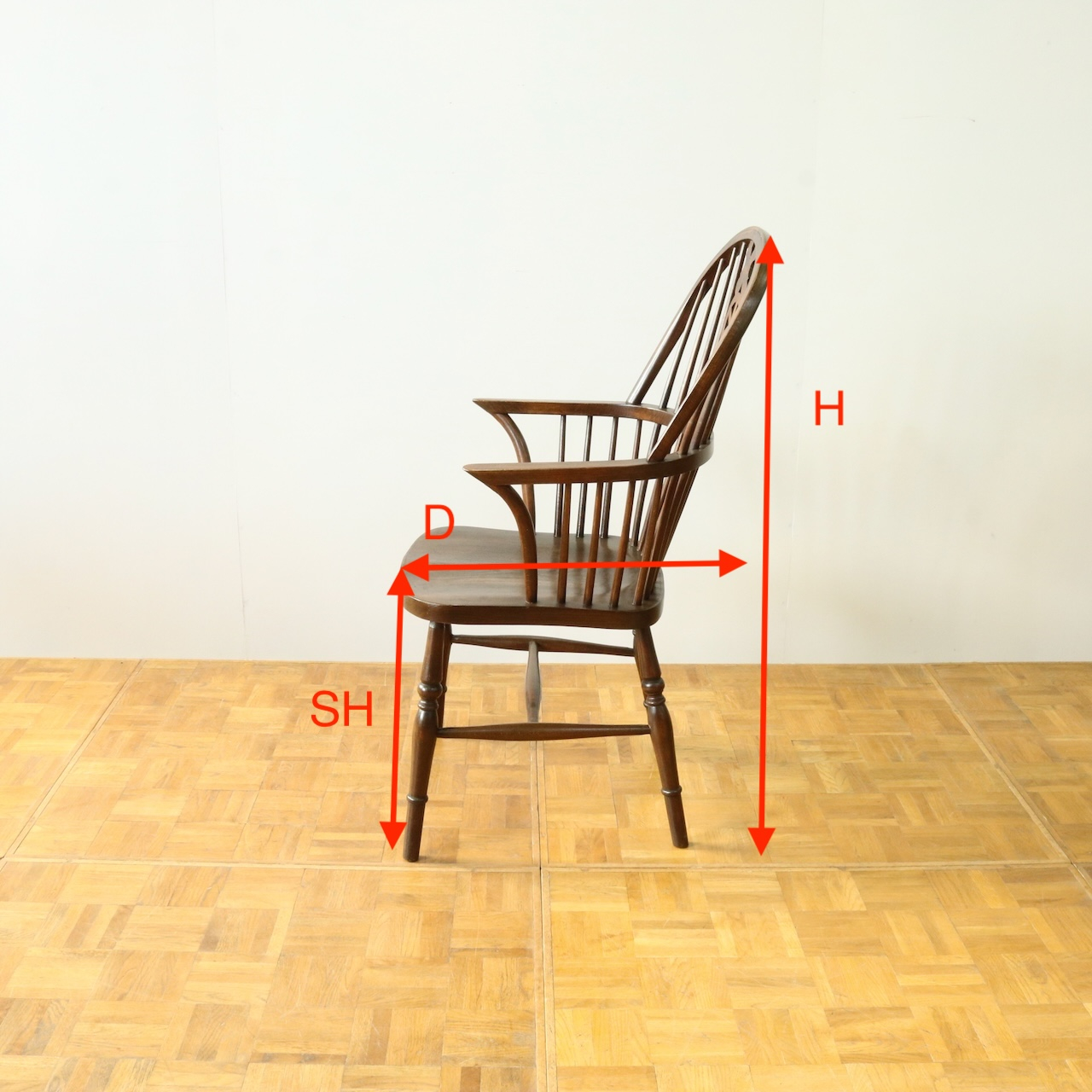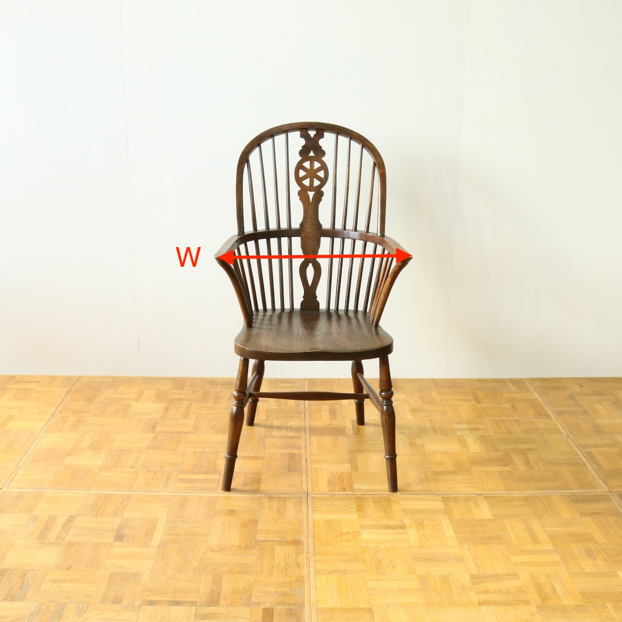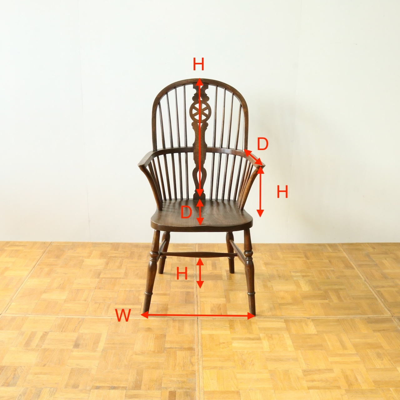 縦方向のすっきりとしたボウバックに、背もたれの透かしのホイールがアクセント。ウィンザーチェアーの中でも人気のあるホイールバックデザインです。