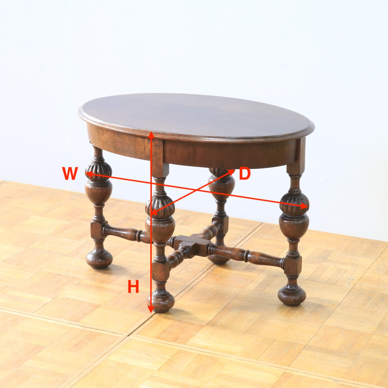 1930年代、オーク材のコーヒーテーブル。楕円形のシンプルな天板に、どんぐりのようなブルボースレッグのアクセントがクラシックなアイテムです。ソファ前やベッドサイドにおすすめです。