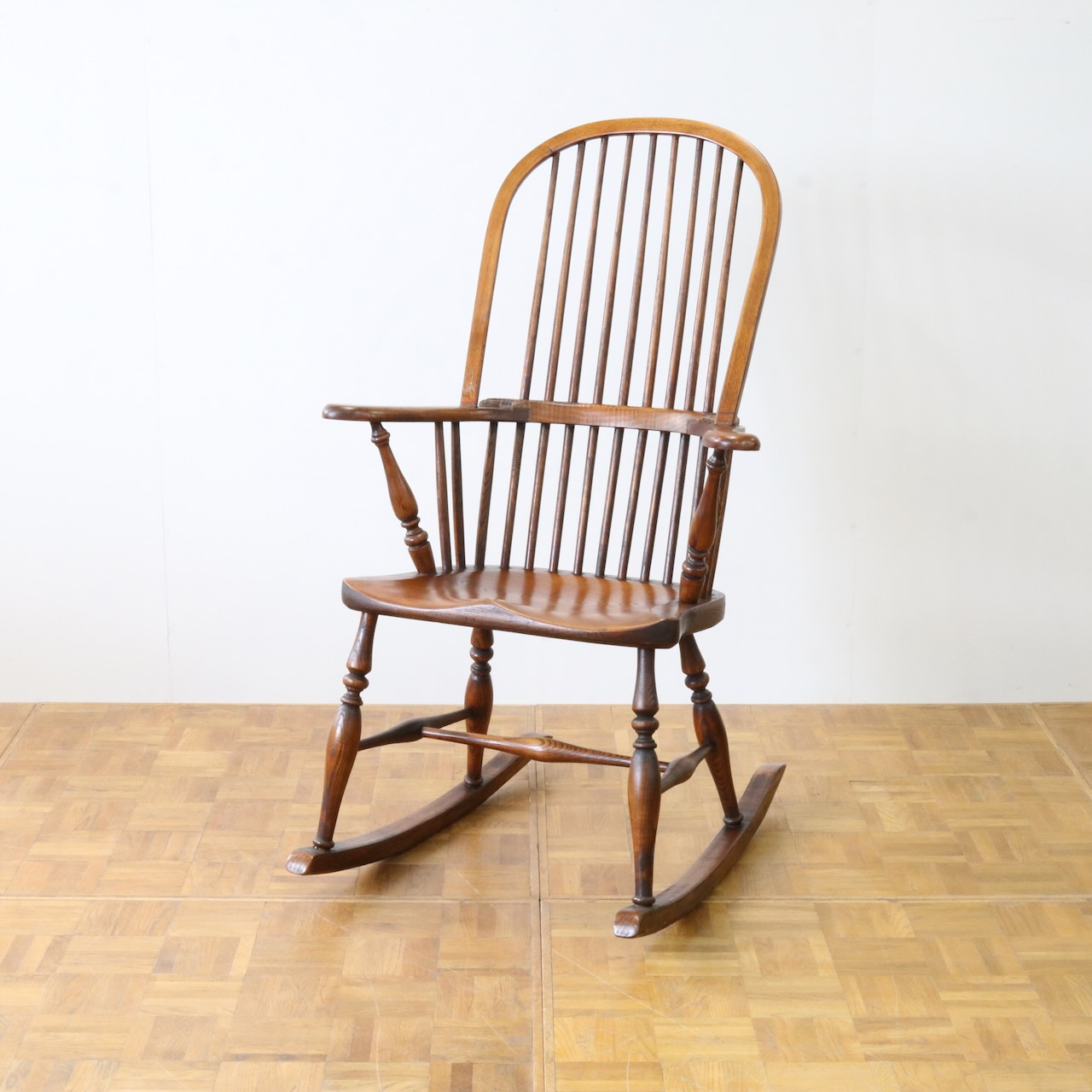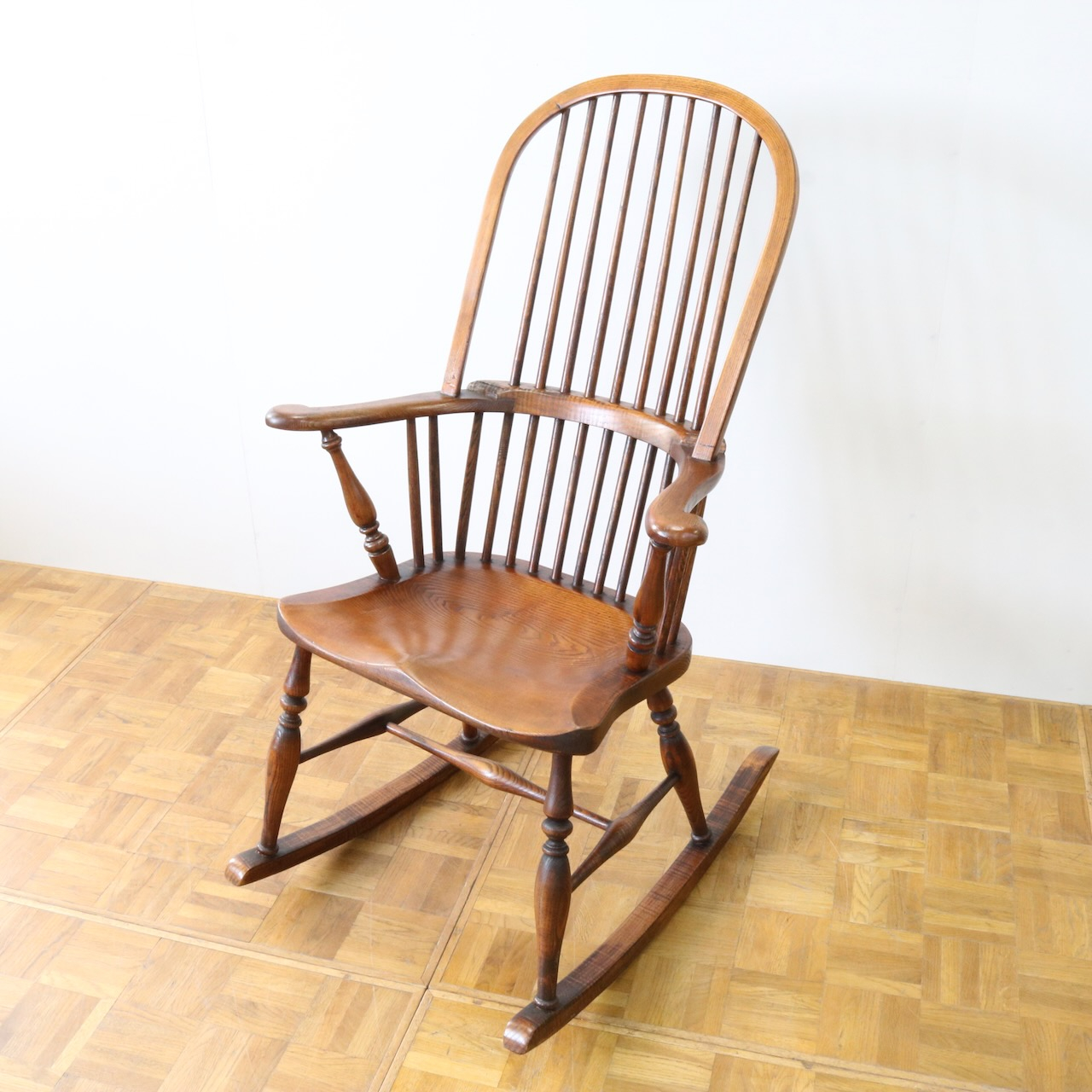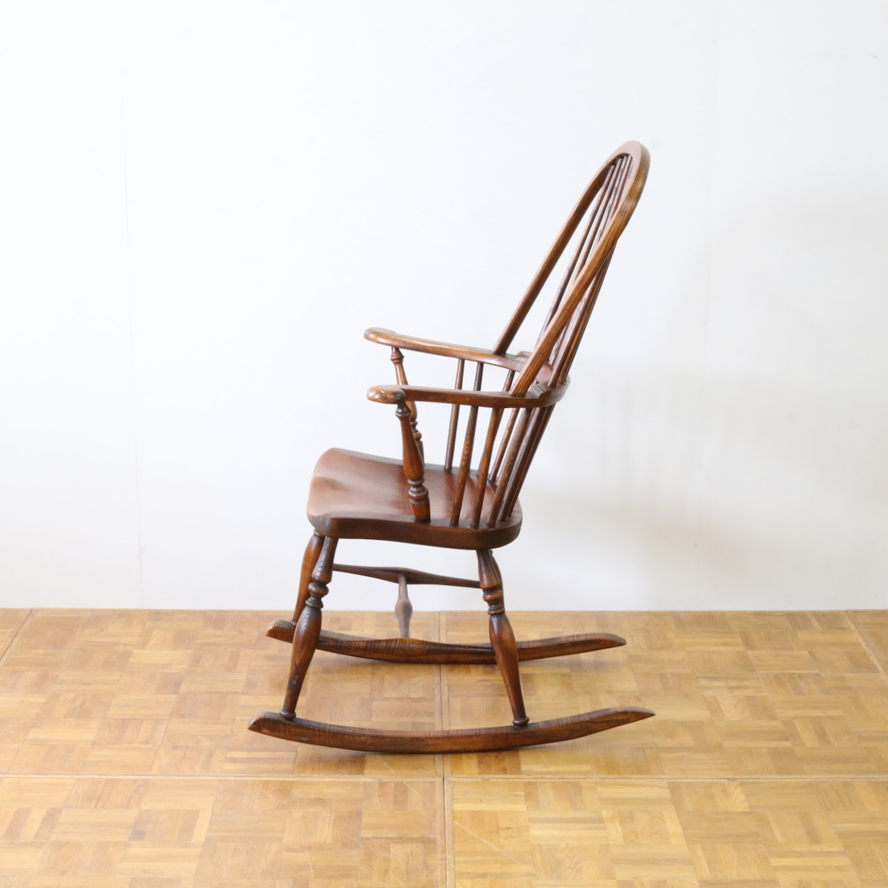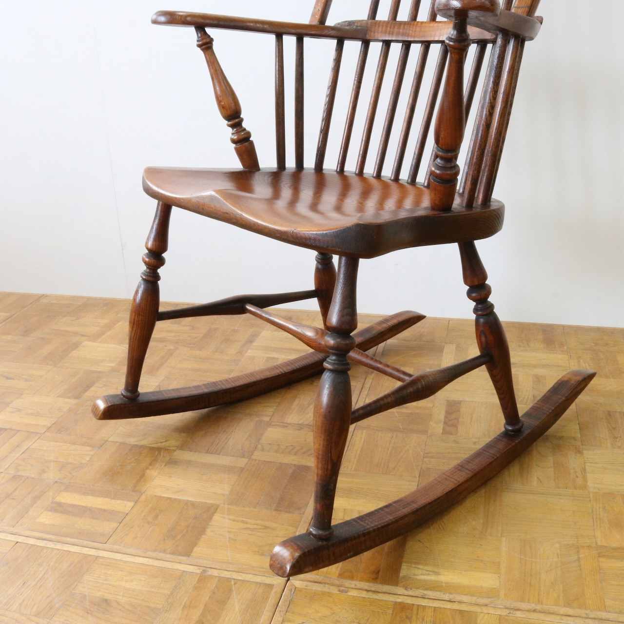 配送料の目安 ▶︎1960年代、ビーチ材のロッキングチェアー。ブレードと呼ばれるカーブした脚の奥行きも短く、全体的にコンパクトなサイズです。コームバックのデザインが目を惹くロッキングチェアーです。