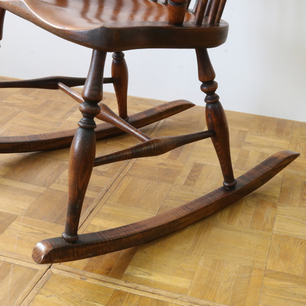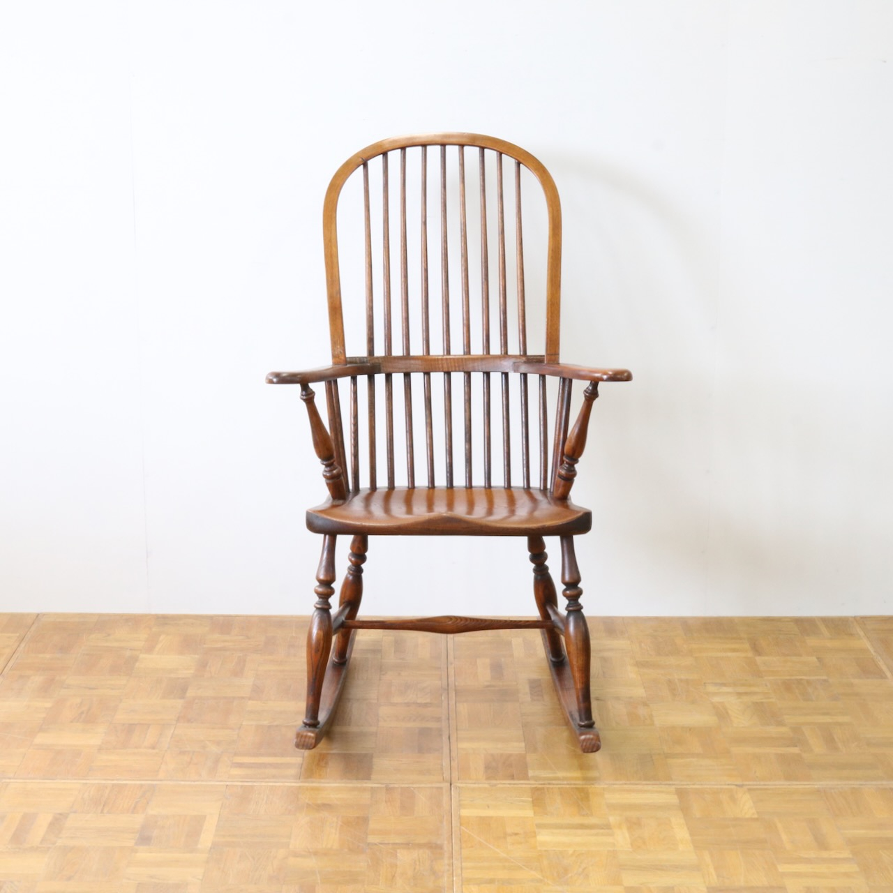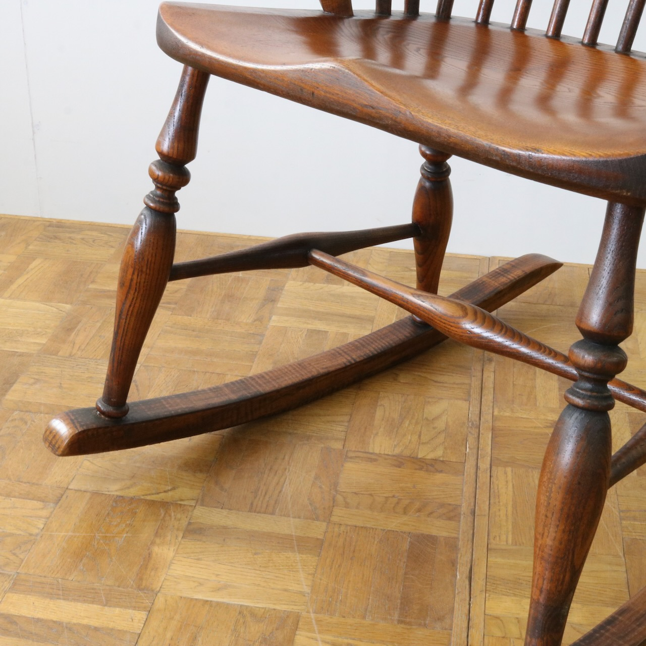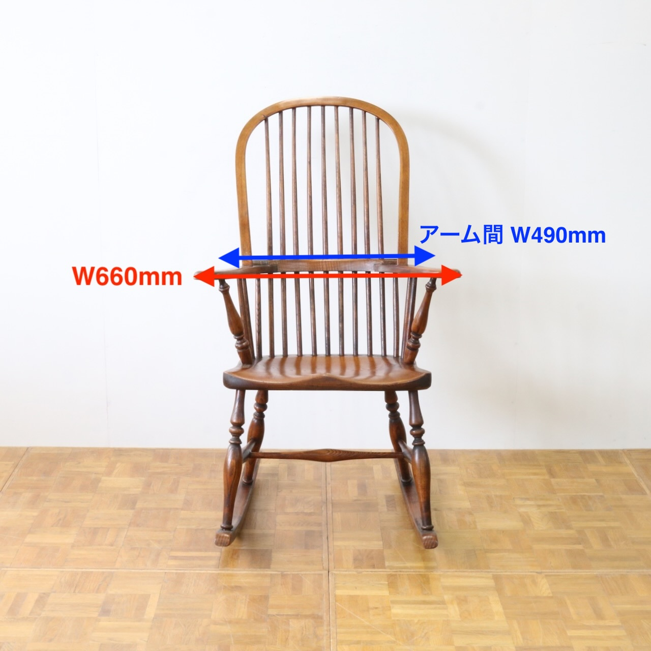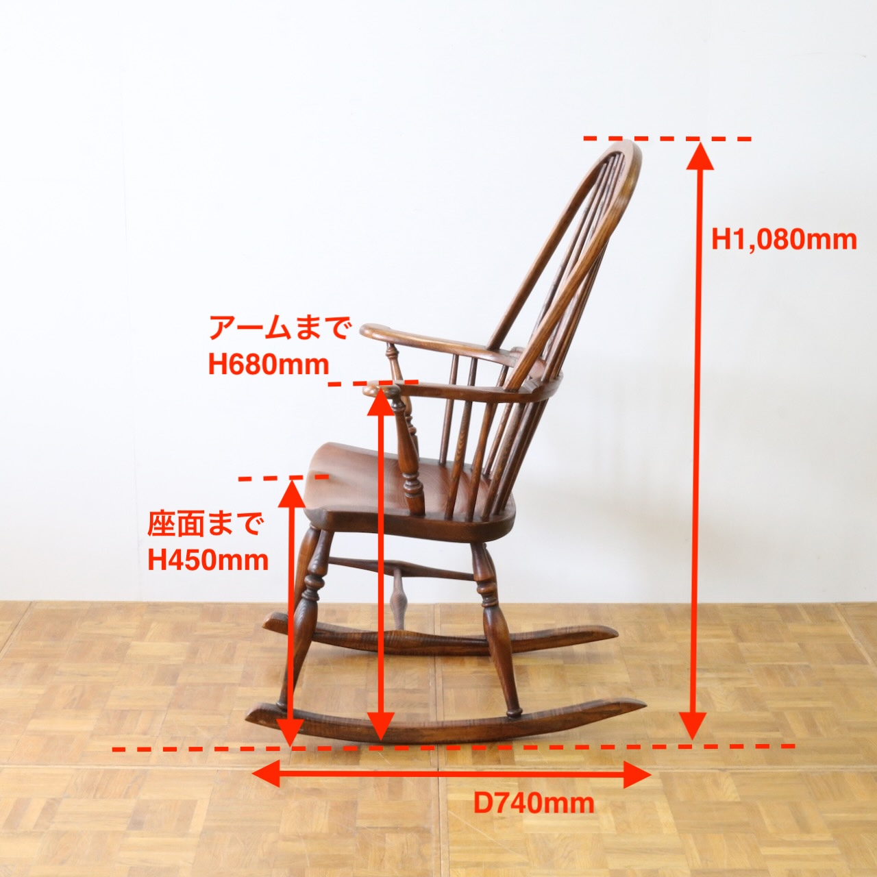 配送料の目安 ▶︎1960年代、ビーチ材のロッキングチェアー。ブレードと呼ばれるカーブした脚の奥行きも短く、全体的にコンパクトなサイズです。コームバックのデザインが目を惹くロッキングチェアーです。