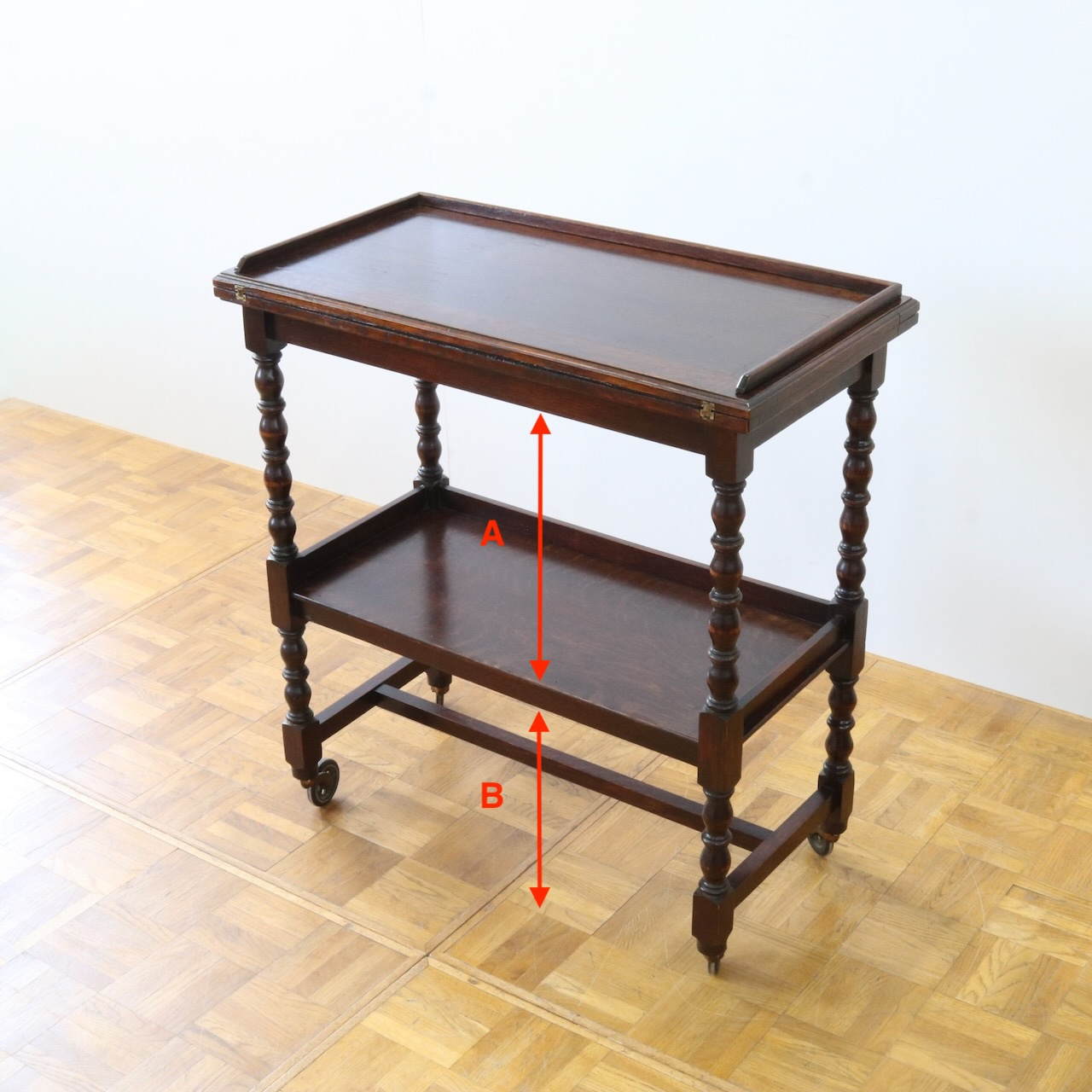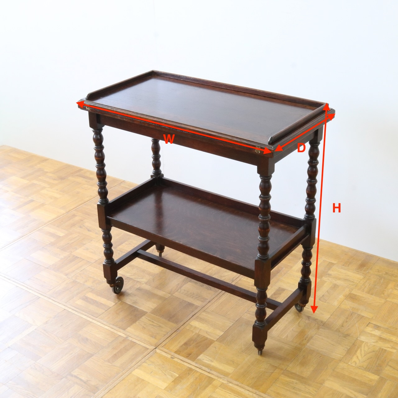 配送料の目安 ▶︎1930年代、オーク材のトローリーワゴン。ボビンターニングのコラムで2段の天板を支えます。折り畳んだ天板を広げることが出来、キッチンの他どんなシーンでも使い勝手の良いスモールファニチャーです。