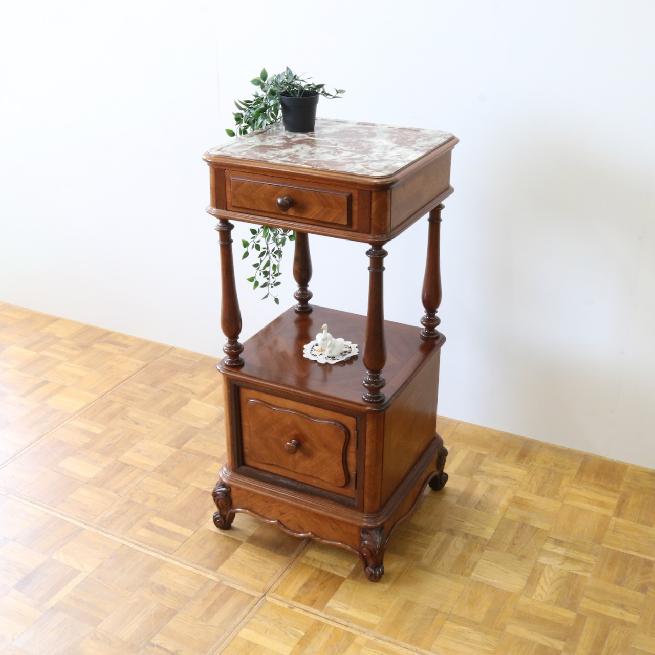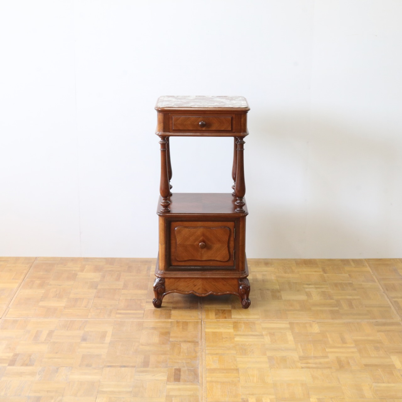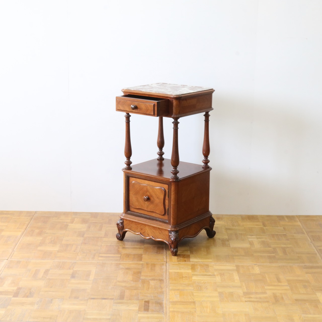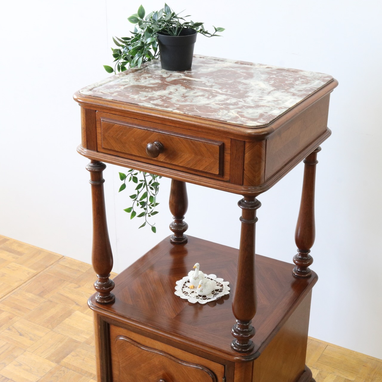 天板や下扉内部は大理石が埋め込まれています。ベッドのサイドに置いたり花台やランプを置く代としてもお使い頂けます。