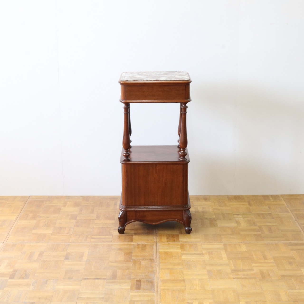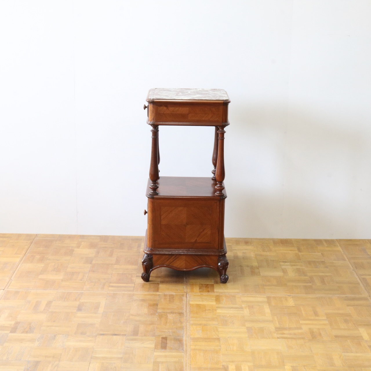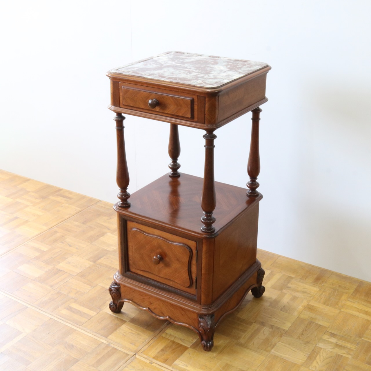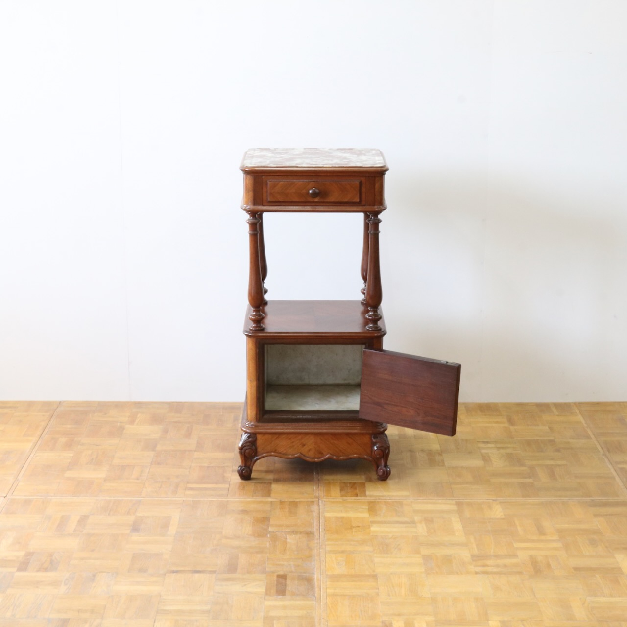 天板や下扉内部は大理石が埋め込まれています。ベッドのサイドに置いたり花台やランプを置く代としてもお使い頂けます。