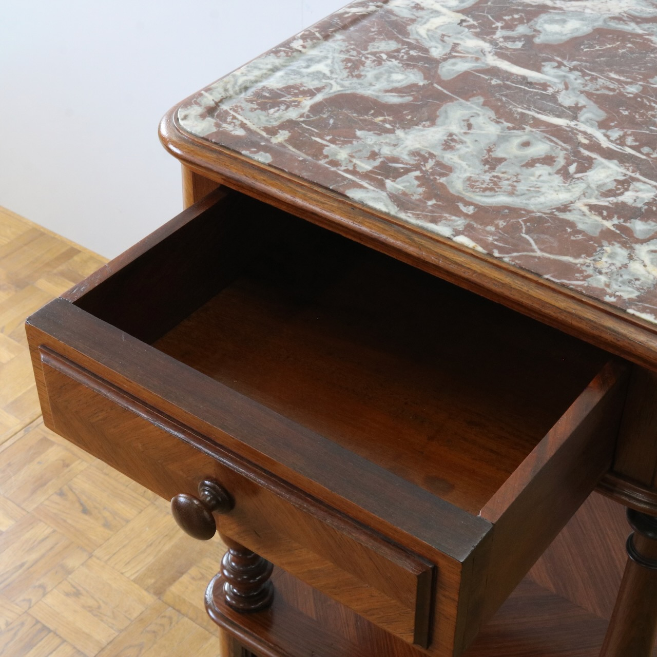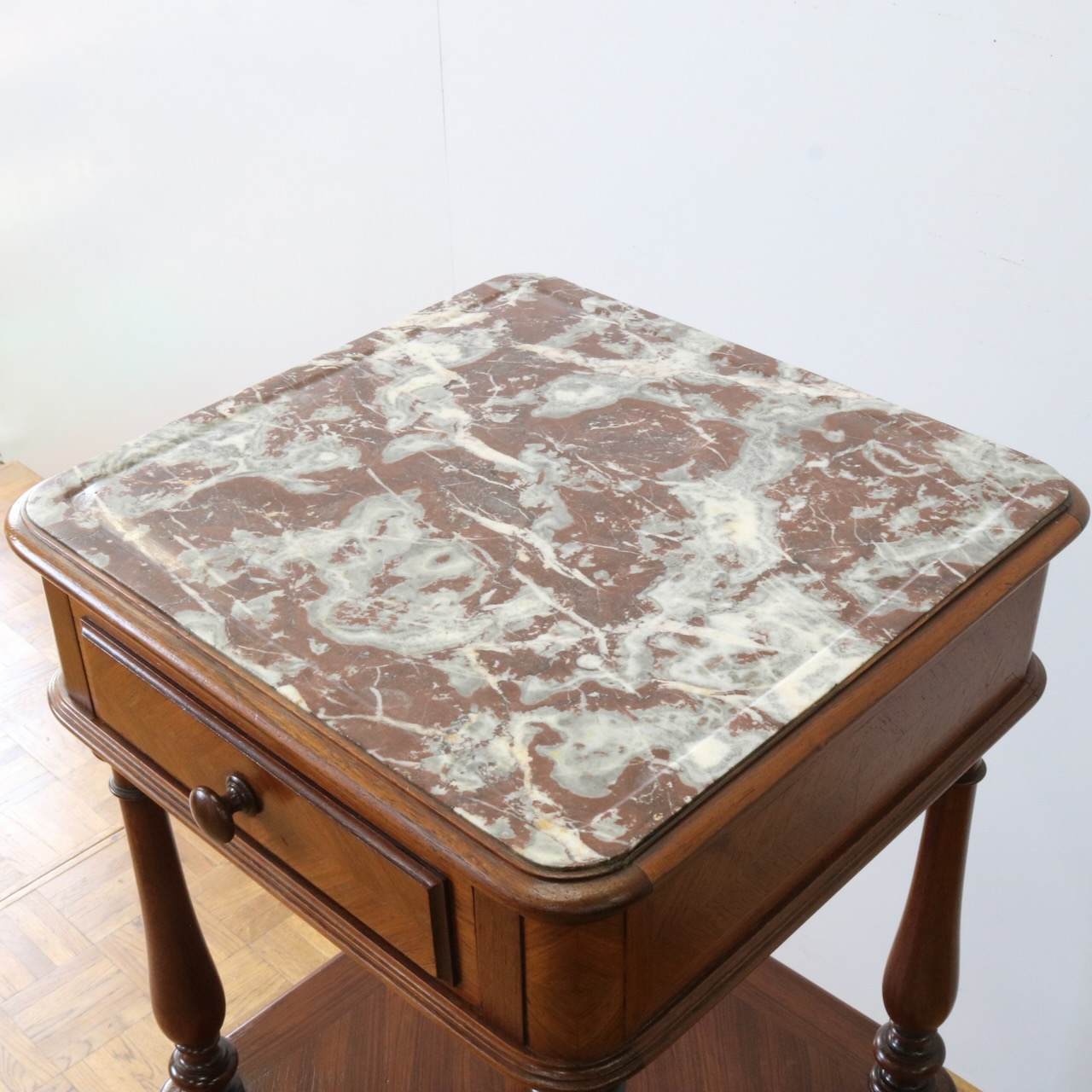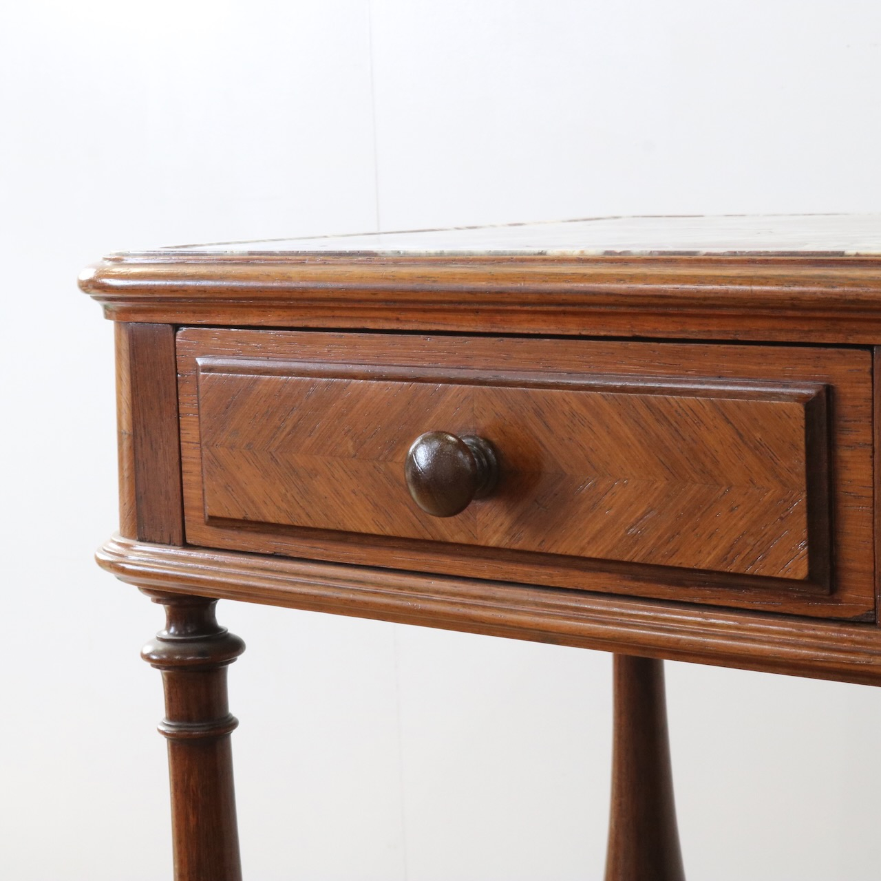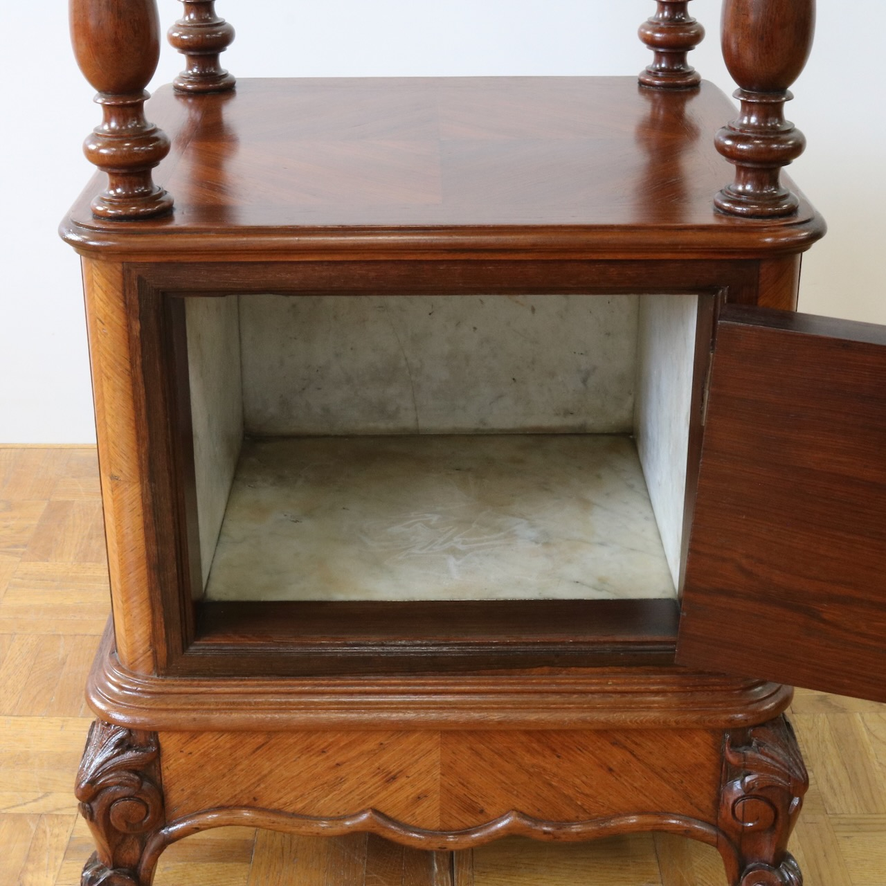天板や下扉内部は大理石が埋め込まれています。ベッドのサイドに置いたり花台やランプを置く代としてもお使い頂けます。