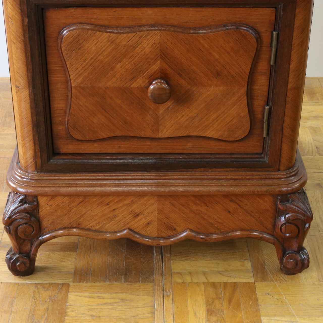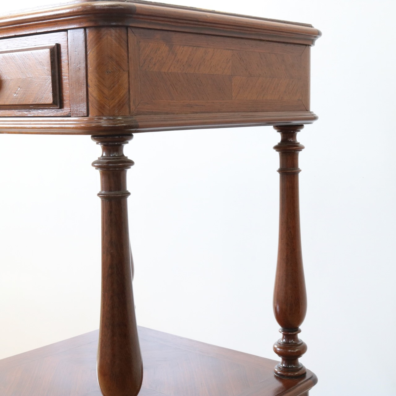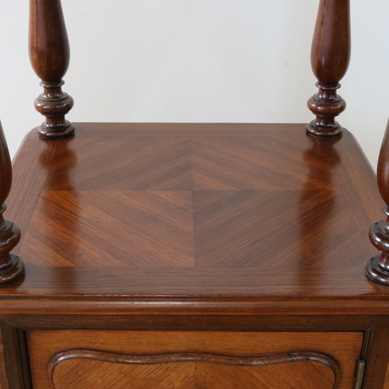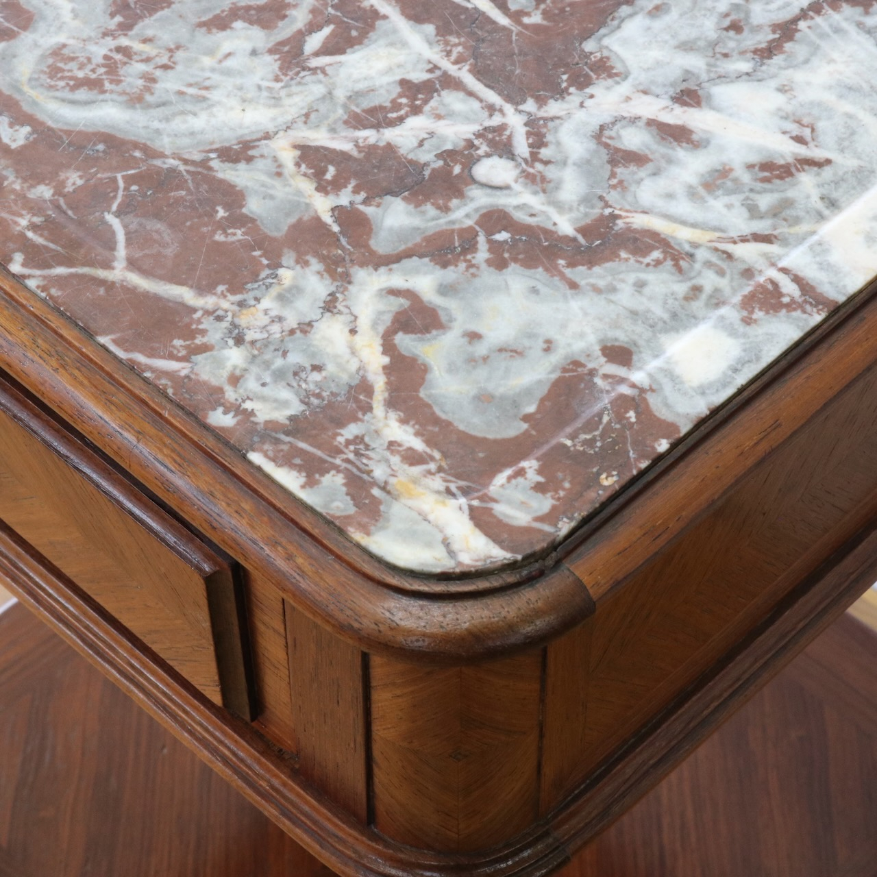 天板や下扉内部は大理石が埋め込まれています。ベッドのサイドに置いたり花台やランプを置く代としてもお使い頂けます。