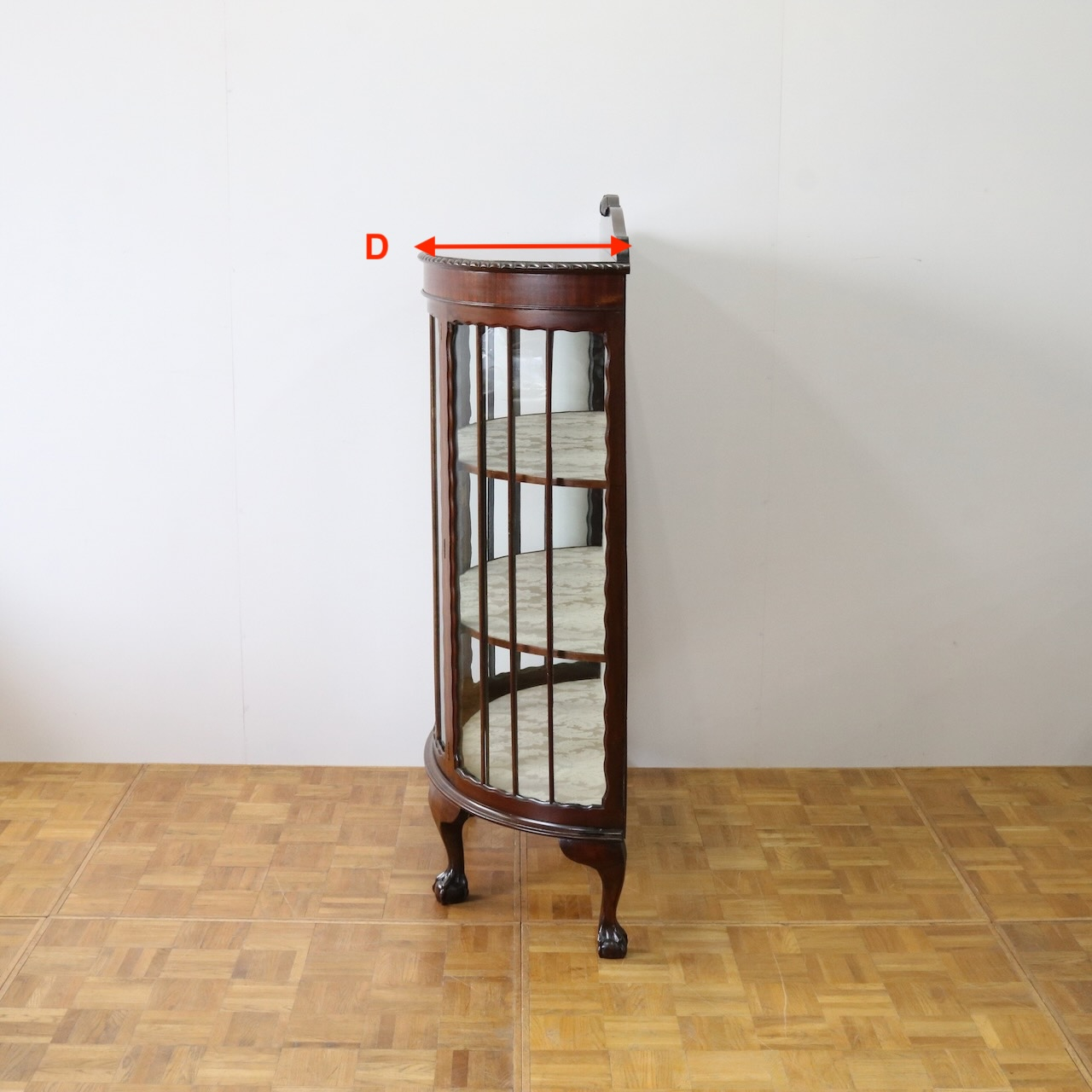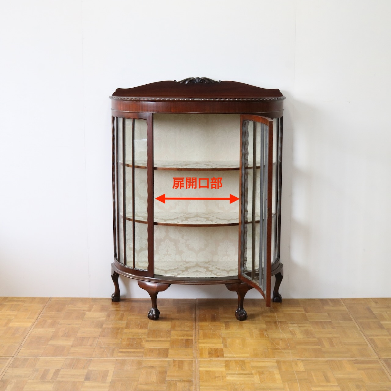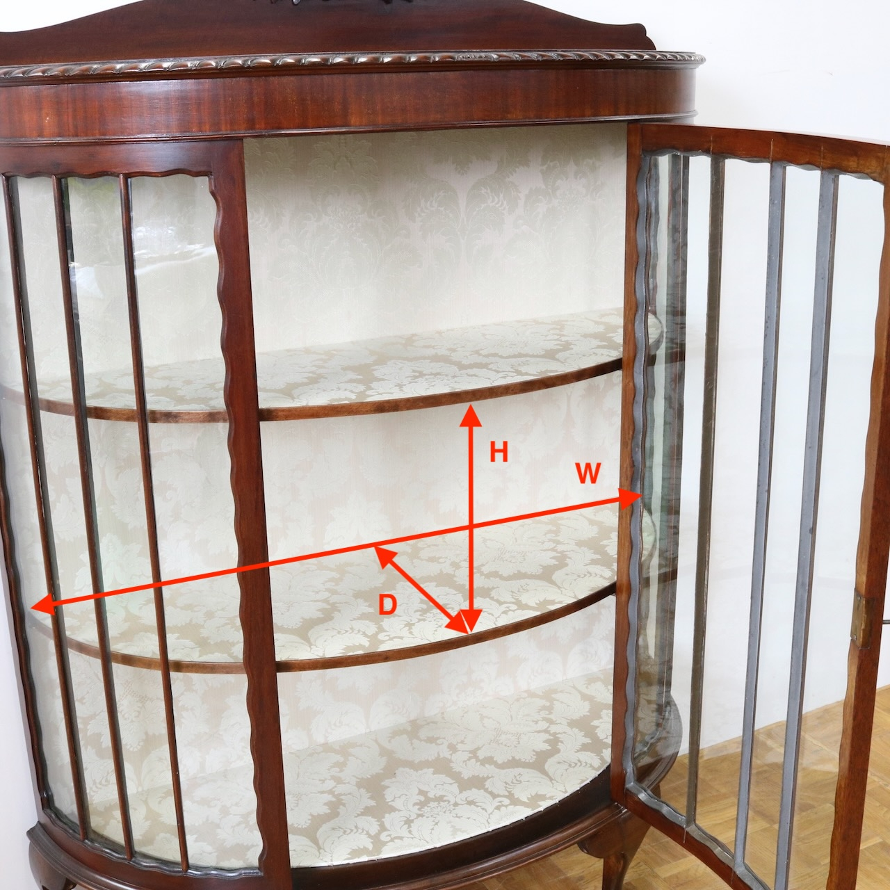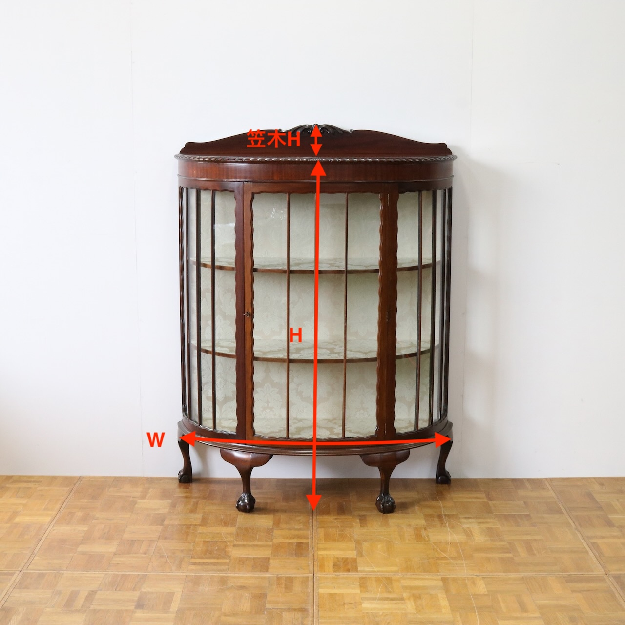 配送料の目安 ▶︎1930年代、マホガニーのグラスキャビネット 。手が込んだ装飾がポイントに施された洗練された佇まい。マホガニーの上品な風合いも魅力的です。