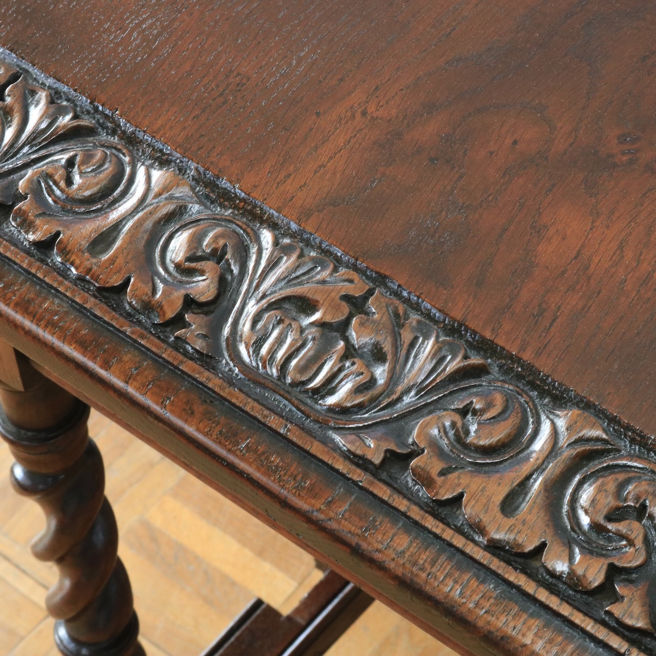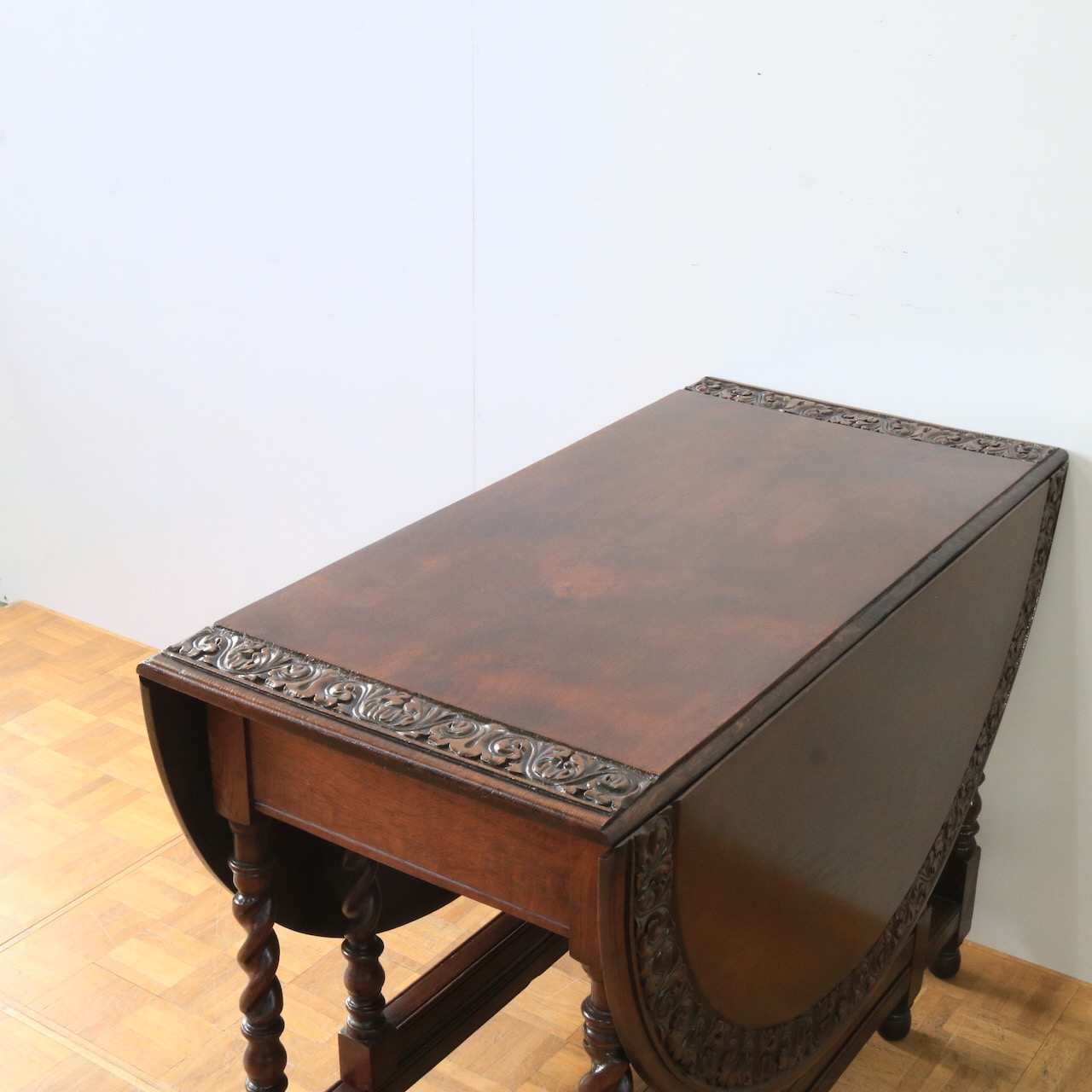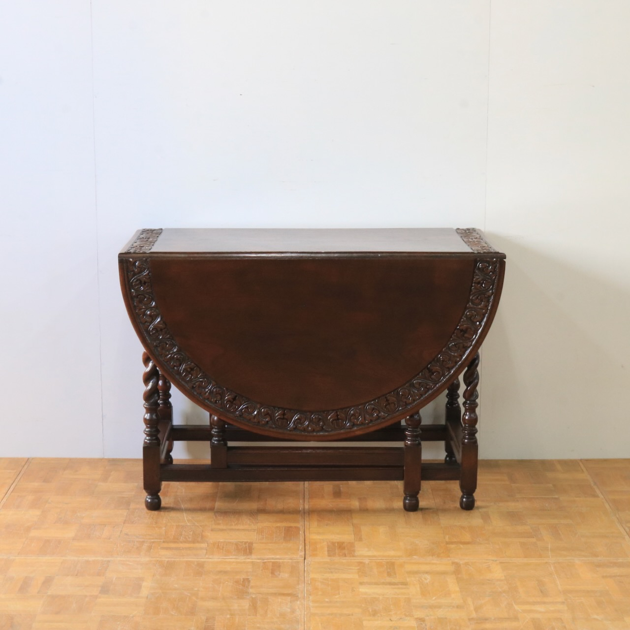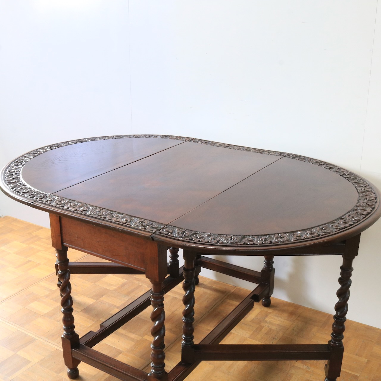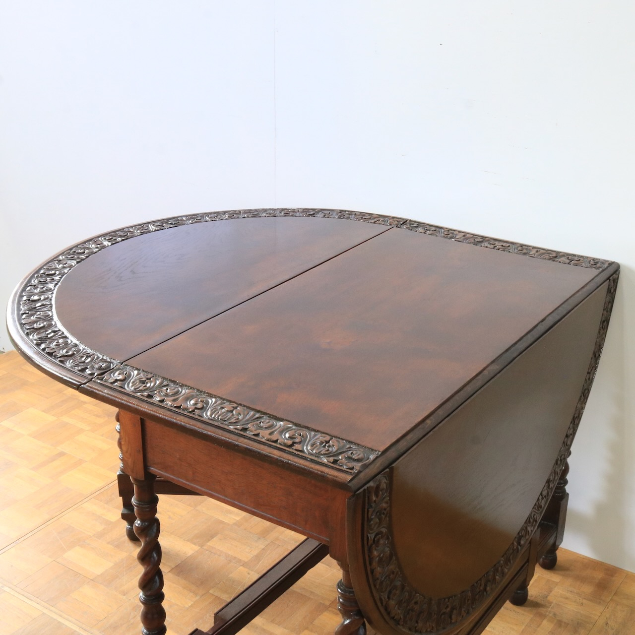 フチの植物紋様の彫刻がオーク材らしい重厚感を引き立たせ、アンティークならではの深い存在感があります。