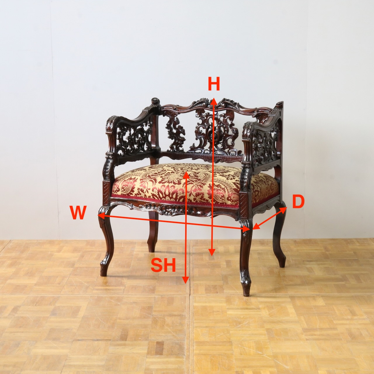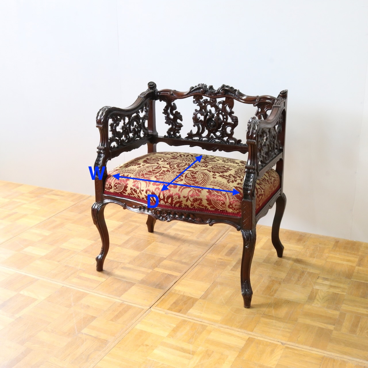 配送料の目安 ▶︎1930年代、マホガニーのスツール。アームや背に施された透かし彫りが繊細で優美。細部まで職人の美意識の高さを感じられるひと品です。